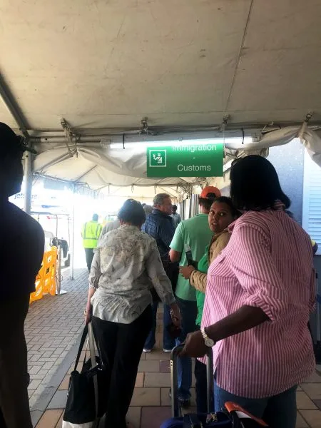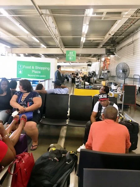 We stood in line to clear immigration while Jerry retrieved our luggage, He then escorted us to another tented area where they had some counters and checked us in at Winair. Then we went to a booth to get our passports stamped again, this time for departure, and we went through a security checkpoint in a hangar serving as the departure lounge. It had some places to buy drinks and snacks and a restroom. Soon after, Jerry came to get us, and we were on our way to St. Barth.