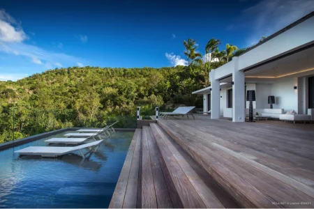 Amongst the new villas I visited, I absolutely loved Villa Kelly, a chic three bedroom villa, located near Gustavia and perfect for families. From the villa you can enjoy the panoramic view of St. Jean and a constant ballet of planes in the distance. The villa is beautifully designed in a nice contemporary style and features 3 bedrooms (2 bedrooms can communicate), a fitness room, a nice outdoor living space with a bar/kitchenette and a large barbecue to dine alfresco! The indoor living area and kitchen is fully air conditioned for those who cannot handle the heat. The long infinity heated pool (58 by 11 feet) is gorgeous with a shallow part where you can lay on chaise lounges. You will enjoy the convenience of being near your favorite restaurants and shopping spots in Gustavia.