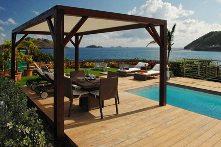 I picked up my car and headed toward Flamands Beach because we were lucky enough to be able to take advantage of a 4 night opening atVilla Les Embruns. The villa is so popular that being able to stay here is a real treat. As I write this I am sitting on the sectional sofa in the living area and looking out at the heated swimming pool, outside deck, the sea and the little islet of Frégate. There are 4 very nice chaise lounges and an outdoor table for 4 so that we can enjoy or morning coffee outside. The open floor plan features another sitting area for TV viewing, an indoor dining area and a fully equipped kitchen with bar.