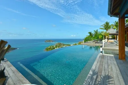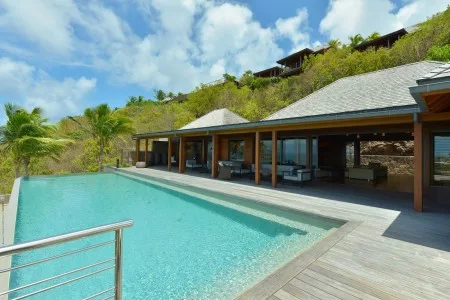 Villa Jade, the eight bedroom vacation home of legendary French Rocker Johnny Hallyday is a stand-out even on St. Barth, where villas-to-die-for are as prolific as celebrities. A private Marigot location offers sweeping views of its bay and expansive outdoor living space complete with a super-sized heated infinity pool, Jacuzzi, king-sized canopied day bed and party-sized alfresco dining area. Indoors, there’s a state-of-the-art gym with a steam and sauna and a home-cinema with theater-style tiered seats and access to 4,000 movies. Sleeping accommodations include a three-bedroom family suite (a master and 2 children’s bedrooms) three additional en suite bedrooms, one suitable for staff and a private studio-style bungalow facing the sea. The Asian-themed décor is striking.