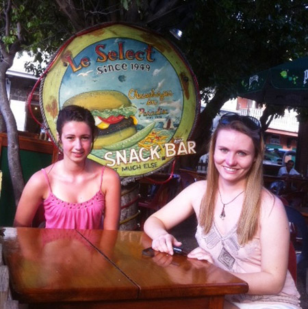What’s next? I had made plans to dine that evening with my long time (11 visits with SBP!) wonderful clients Mike and Bonnie long before I had surprised Reegan with this trip. Not a big deal as these teenage girls love to shop and wanted to wander around Gustavia and get their bearings before doing some serious shopping later in the week. They also wanted to go to the famous Le Select for a Cheeseburger in Paradise. We made plans, dropped them off in Gustavia and then picked them up at about 7:00. They were glad to spend the evening alone at the villa. (Yes, they were sunburned, too.) They had their laptops and were happily posting their activities on Facebook!