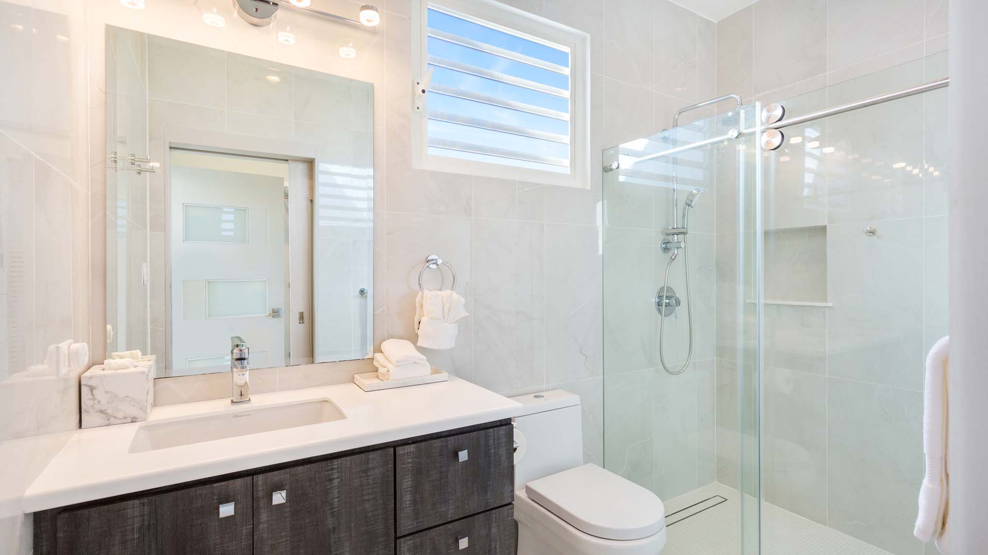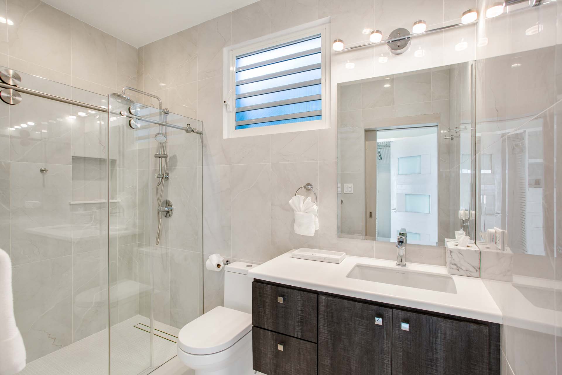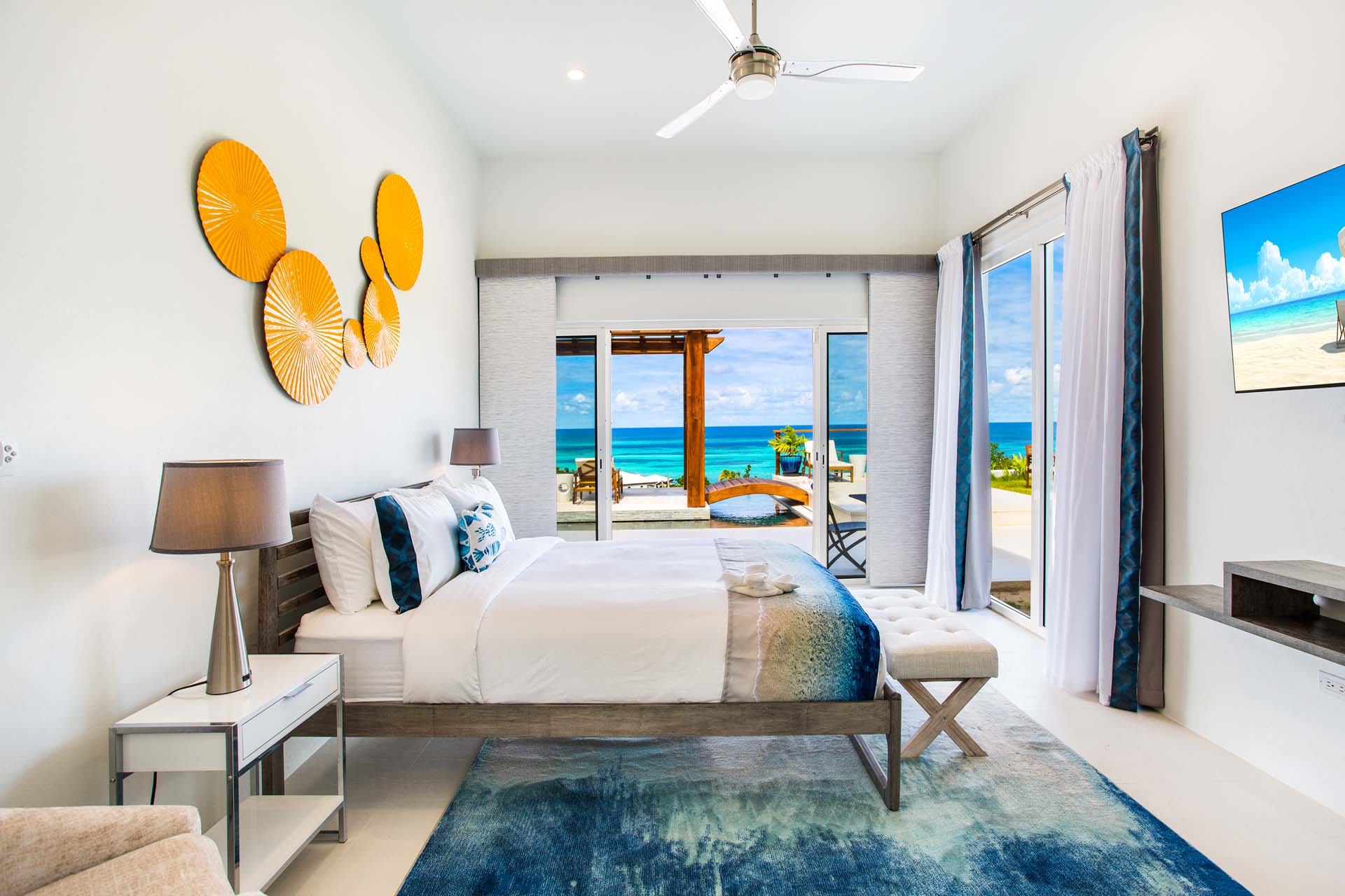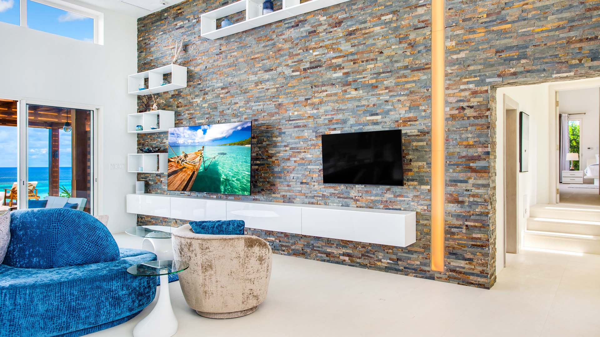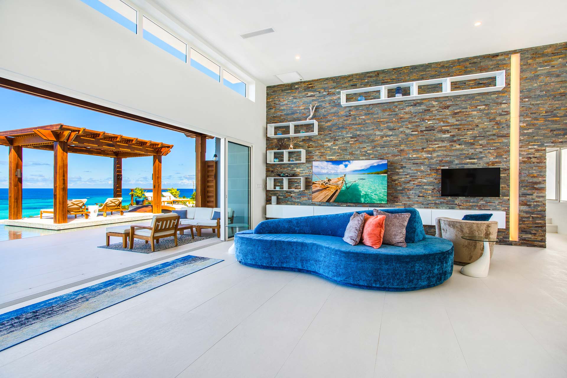 With four ocean-view bedrooms on the main level, each with its own ensuite bathroom, and a fifth ensuite bedroom located on the lower level, the villa offers comfortable accommodations for up to eight guests across its 10,000 square feet of finely curated space. The interiors are thoughtfully styled, drawing inspiration from the radiant colors and natural textures of Shoal Bay to create an atmosphere of relaxed sophistication.