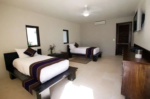 Each of the four bedrooms is a private sanctuary. Three master suites boast king beds, luxurious amenities, and entertainment systems. Two of these open onto balconies with sea views and outdoor showers, while the third offers direct garden access. The fourth bedroom features a queen bed and tranquil views of the surrounding gardens.