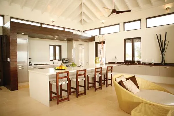 Inside, the villa’s grand entrance leads to the airy great room—a bright, welcoming space with vaulted white ceilings and calming décor. Here, both formal and casual living areas create an inviting environment for conversation and leisure. The fully equipped kitchen opens seamlessly into the living space, allowing sea breezes and natural light to flow through the home.