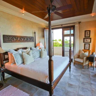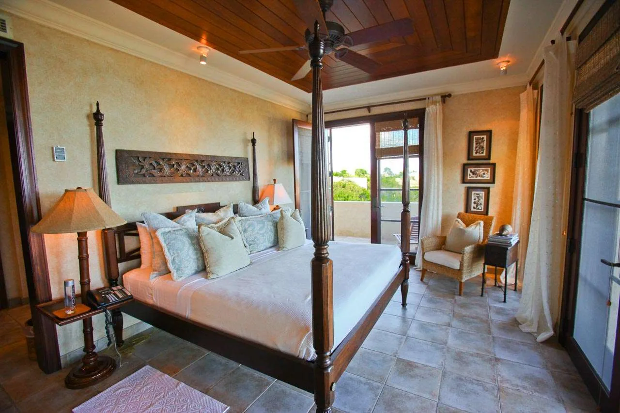 Also on the upper level, the second suite offers a king bed that can be configured into twin beds if needed. The ensuite bathroom includes a double vanity and a walk-in shower. The balcony provides beautiful views of the Caribbean Sea and St. Barts.