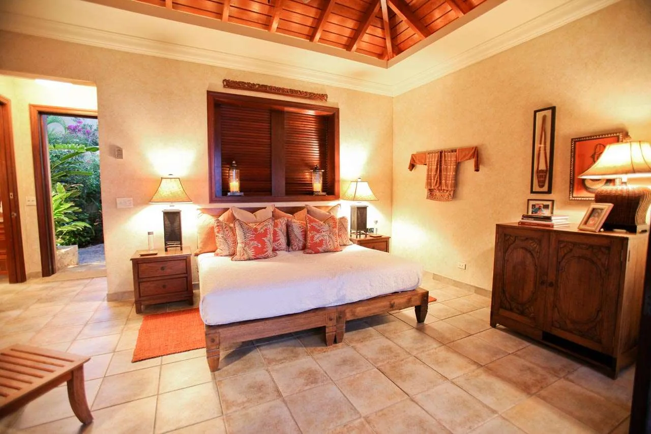 The first suite, located on the upper level, features a king-sized bed, a luxurious bathroom with indoor and outdoor showers, a soaking tub, and a double vanity. It also includes a walk-in closet, a private plunge pool, and a furnished veranda with sweeping sea views.