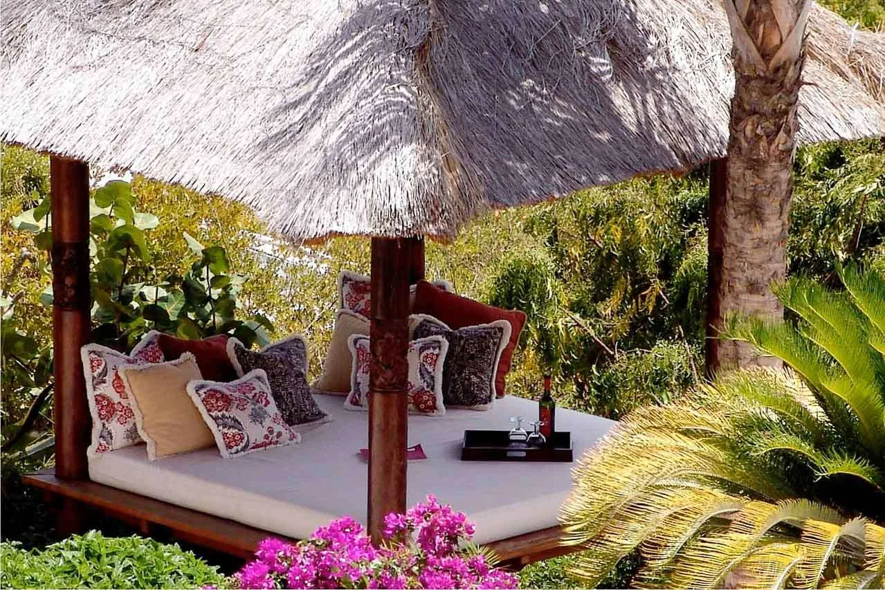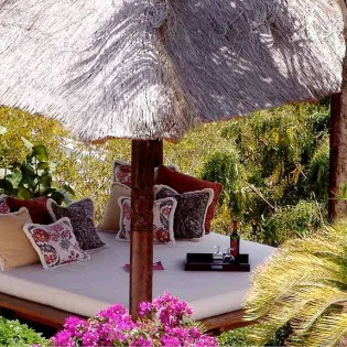 The villa offers multiple gathering spaces, including a grand indoor living room and several outdoor lounging areas. One of these features a fireplace, offering a cozy ambiance under the stars. Three separate dining spaces include a sophisticated veranda set against a backdrop of manicured gardens, rolling ocean waves, and distant islands. Throughout the property, guests can retreat to peaceful terraces or relax on an oversized Indonesian daybed nestled among the palms with a panoramic ocean view.