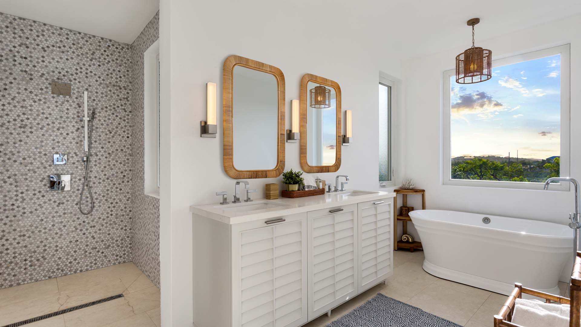 The spacious deck beckons with its charm, boasting a sizable infinity pool that tempts guests into moments of relaxation. Numerous lounging areas provide ample room to soak up the sun or find solace under the gentle sway of palm trees. For those who relish outdoor dining, the covered BBQ dining deck assures unforgettable island dining experiences.