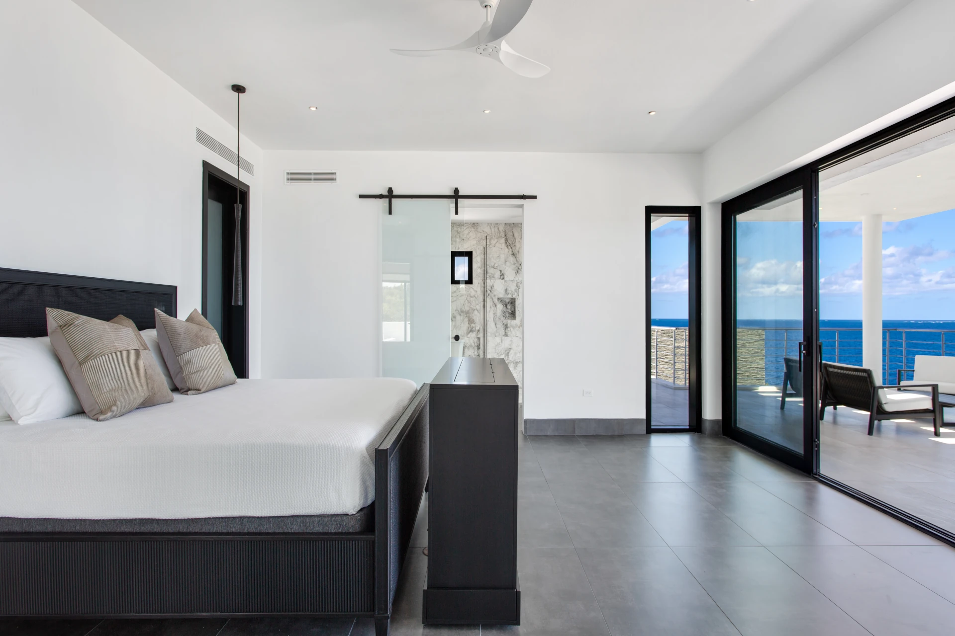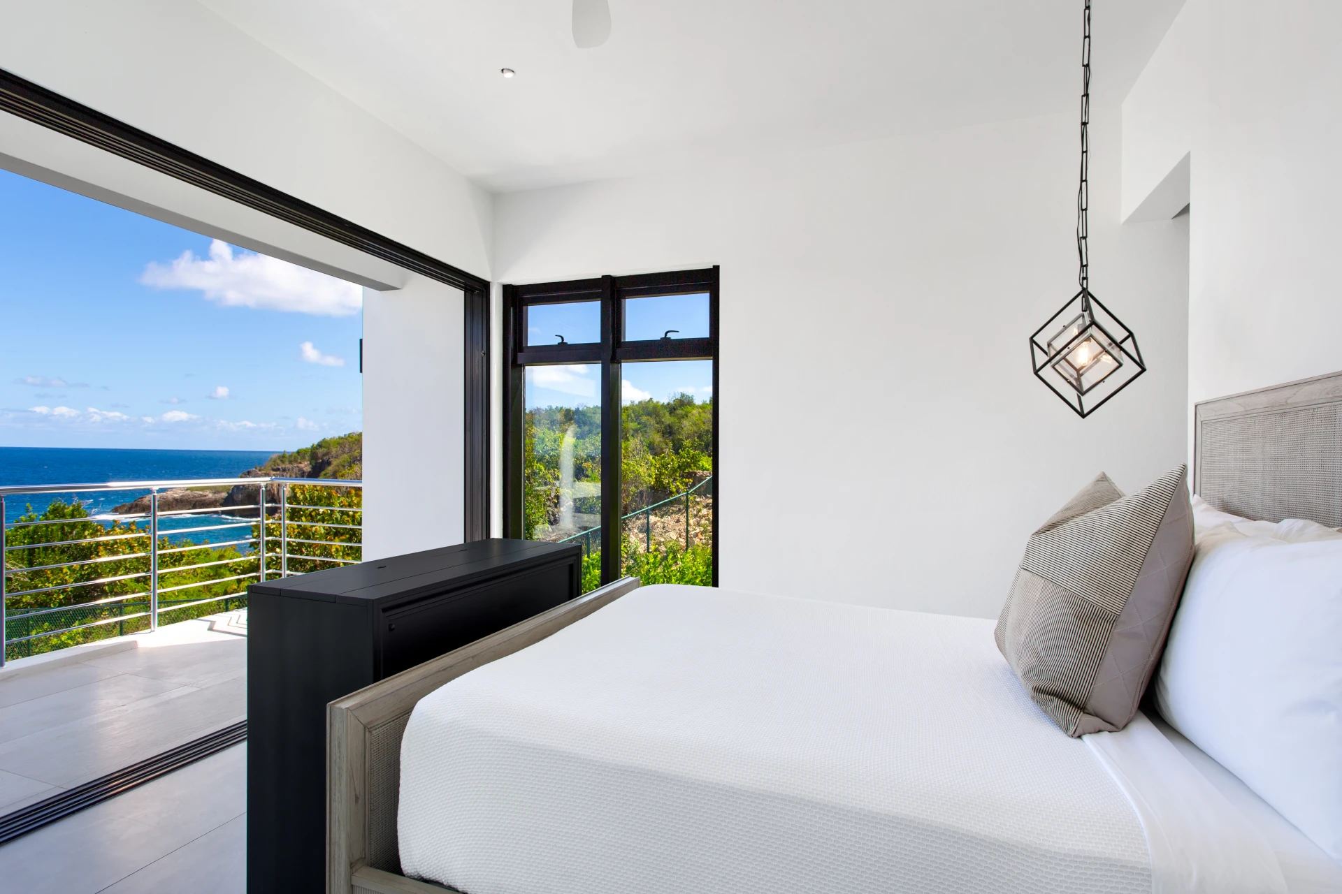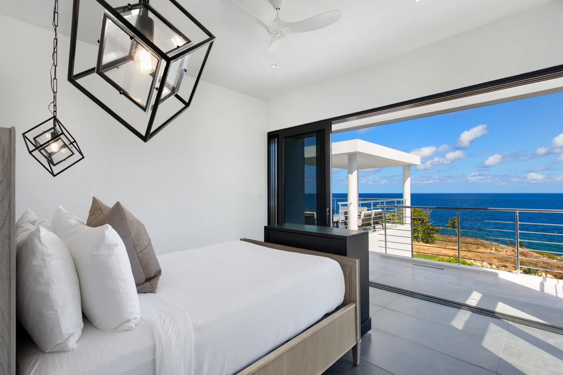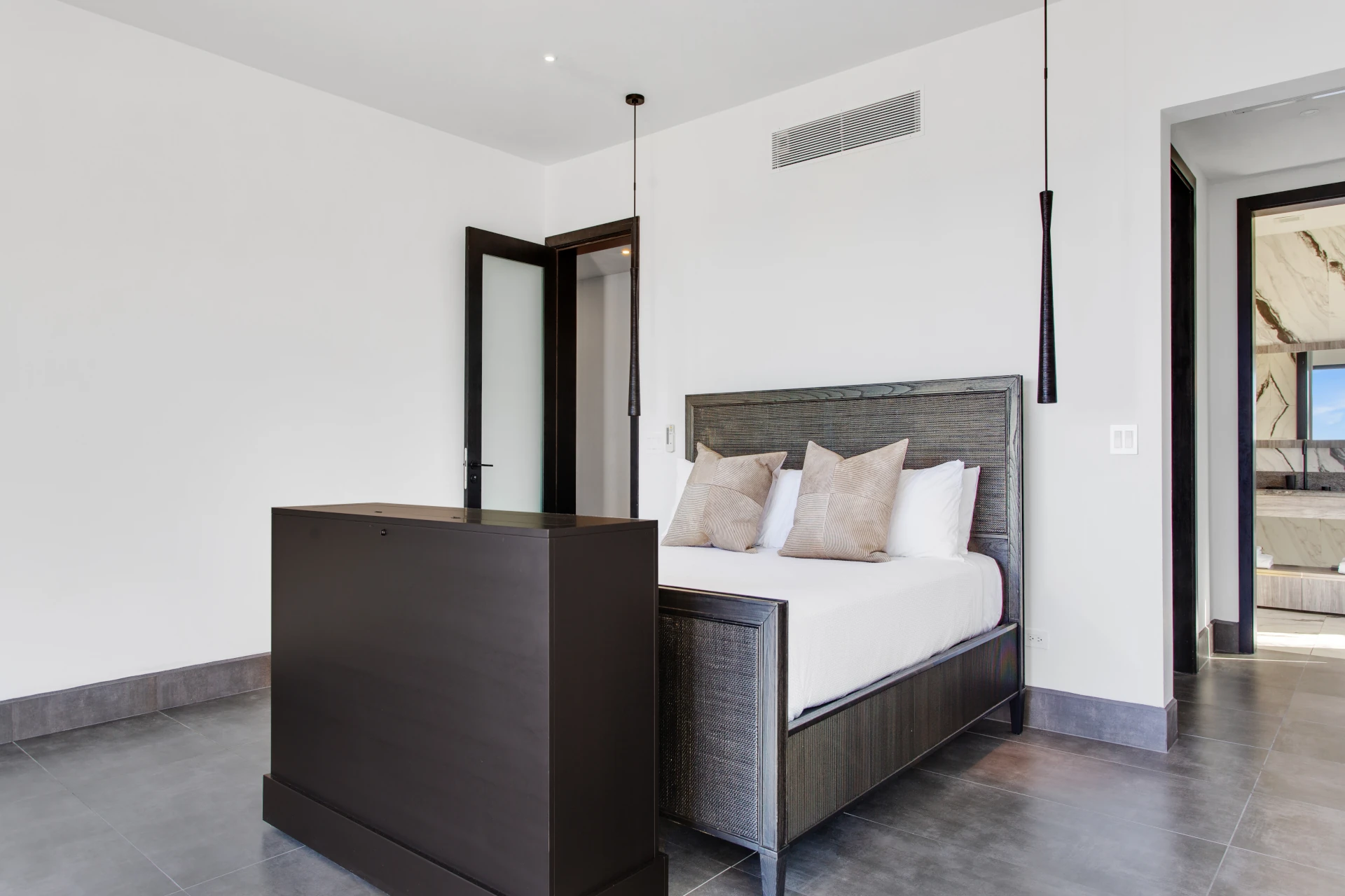This two-story, four-bedroom villa features refined living spaces designed for comfort and indulgence. On the main floor, two bedrooms offer queen beds and ensuite bathrooms, while another features a king bed and ensuite bath. The primary suite occupies the upper level, boasting his-and-hers bathrooms, a kitchenette, a king bed, and a private perch for enjoying the breathtaking surroundings.