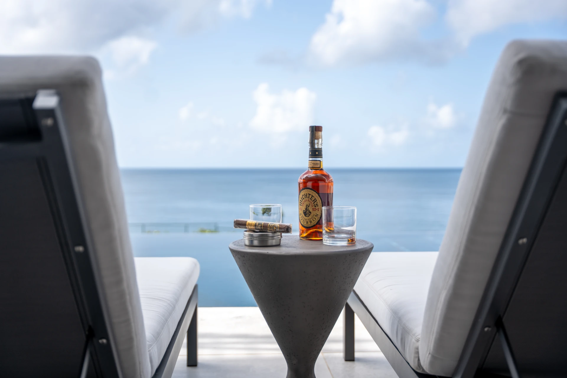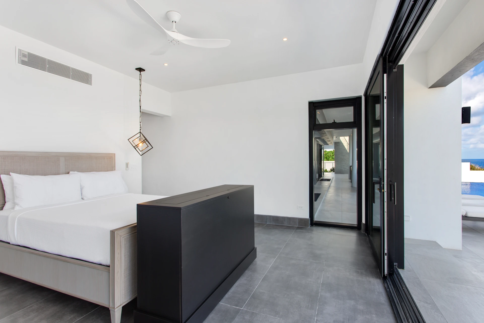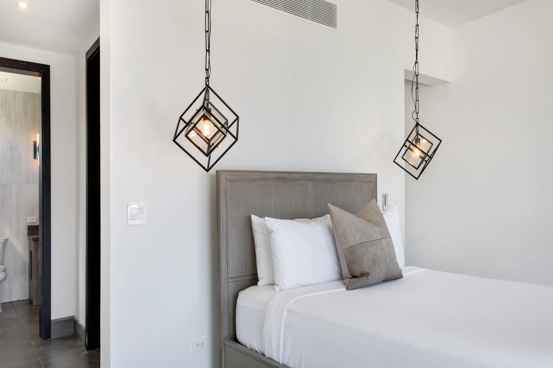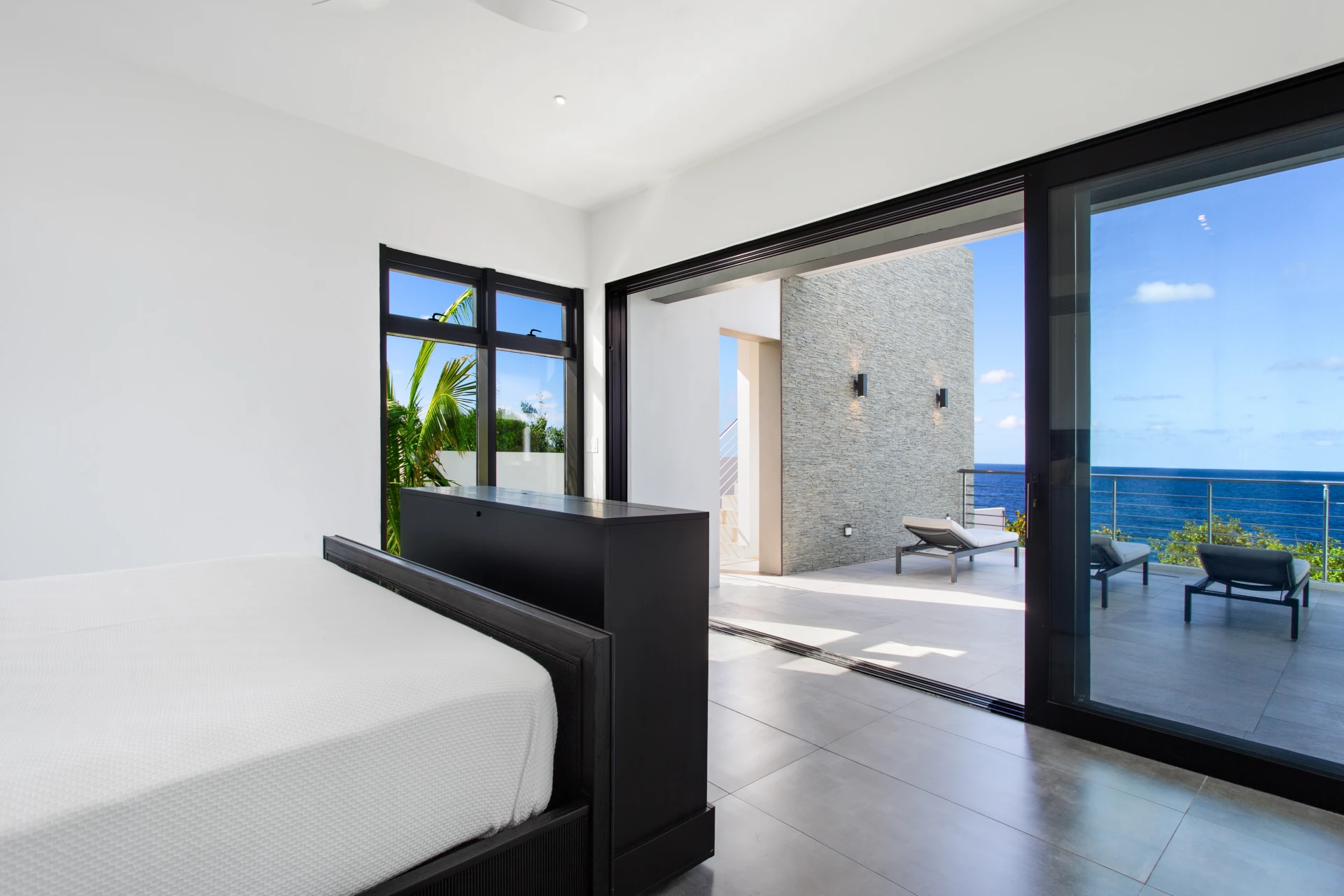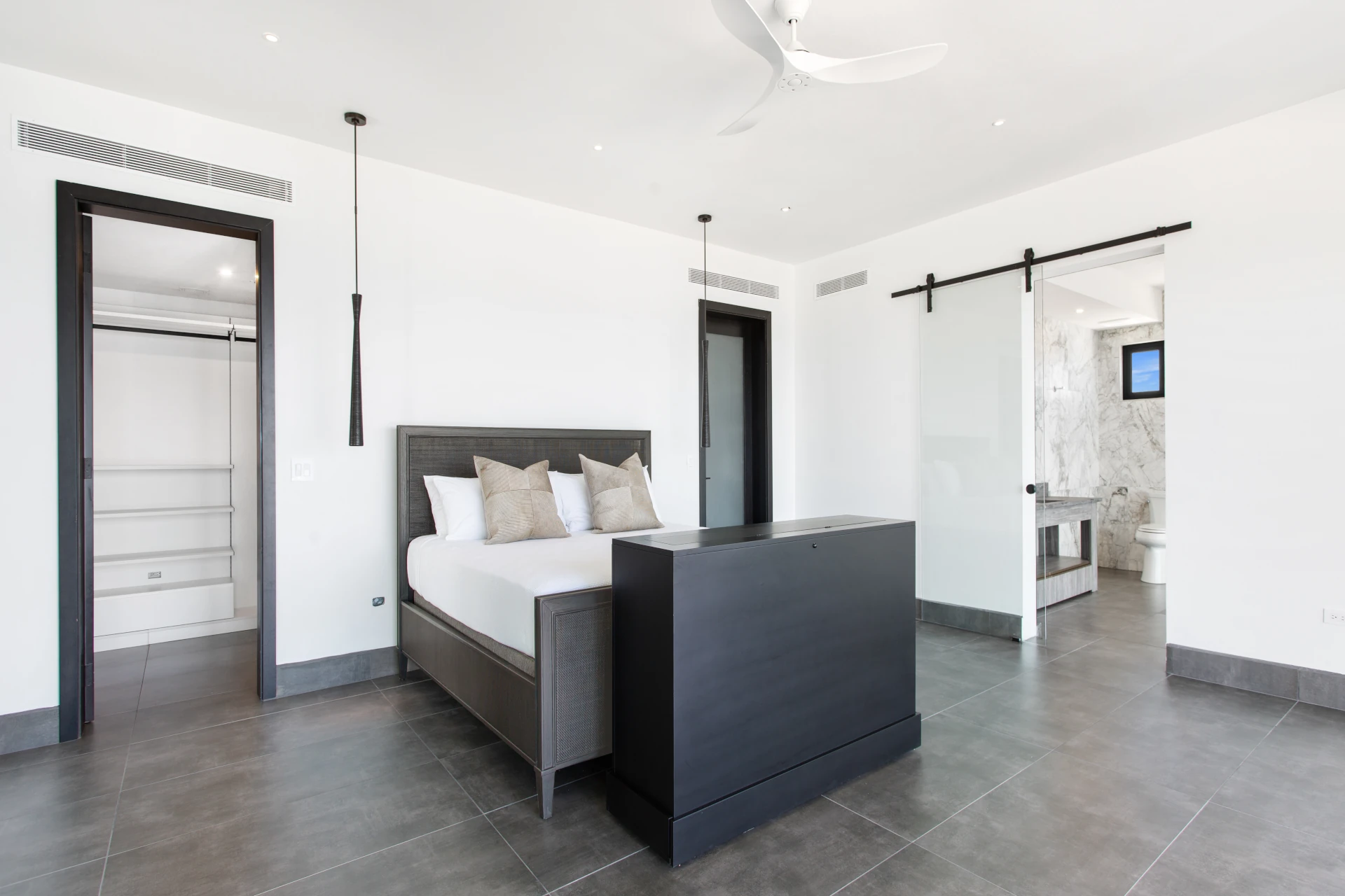 This two-story, four-bedroom villa features refined living spaces designed for comfort and indulgence. On the main floor, two bedrooms offer queen beds and ensuite bathrooms, while another features a king bed and ensuite bath. The primary suite occupies the upper level, boasting his-and-hers bathrooms, a kitchenette, a king bed, and a private perch for enjoying the breathtaking surroundings.