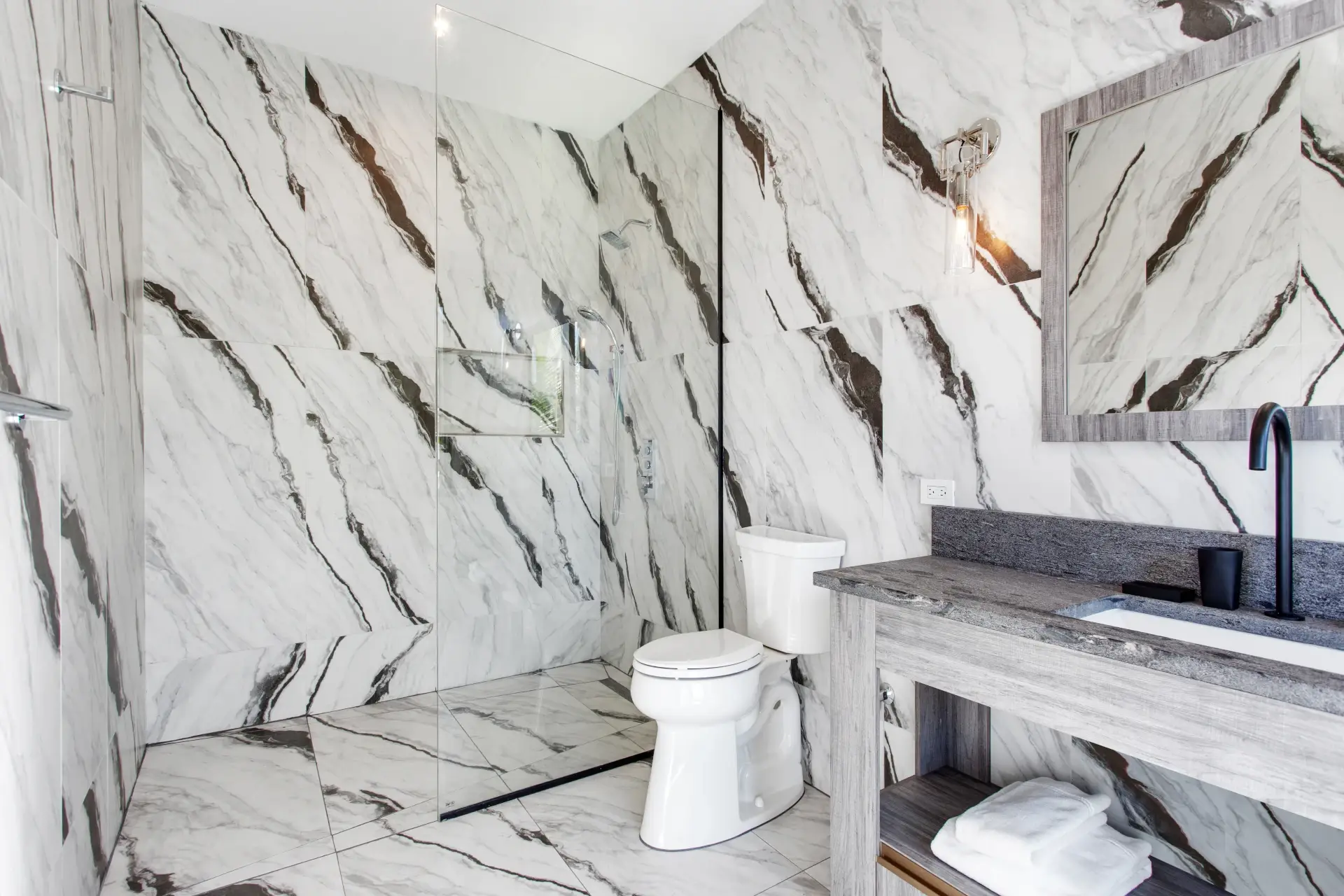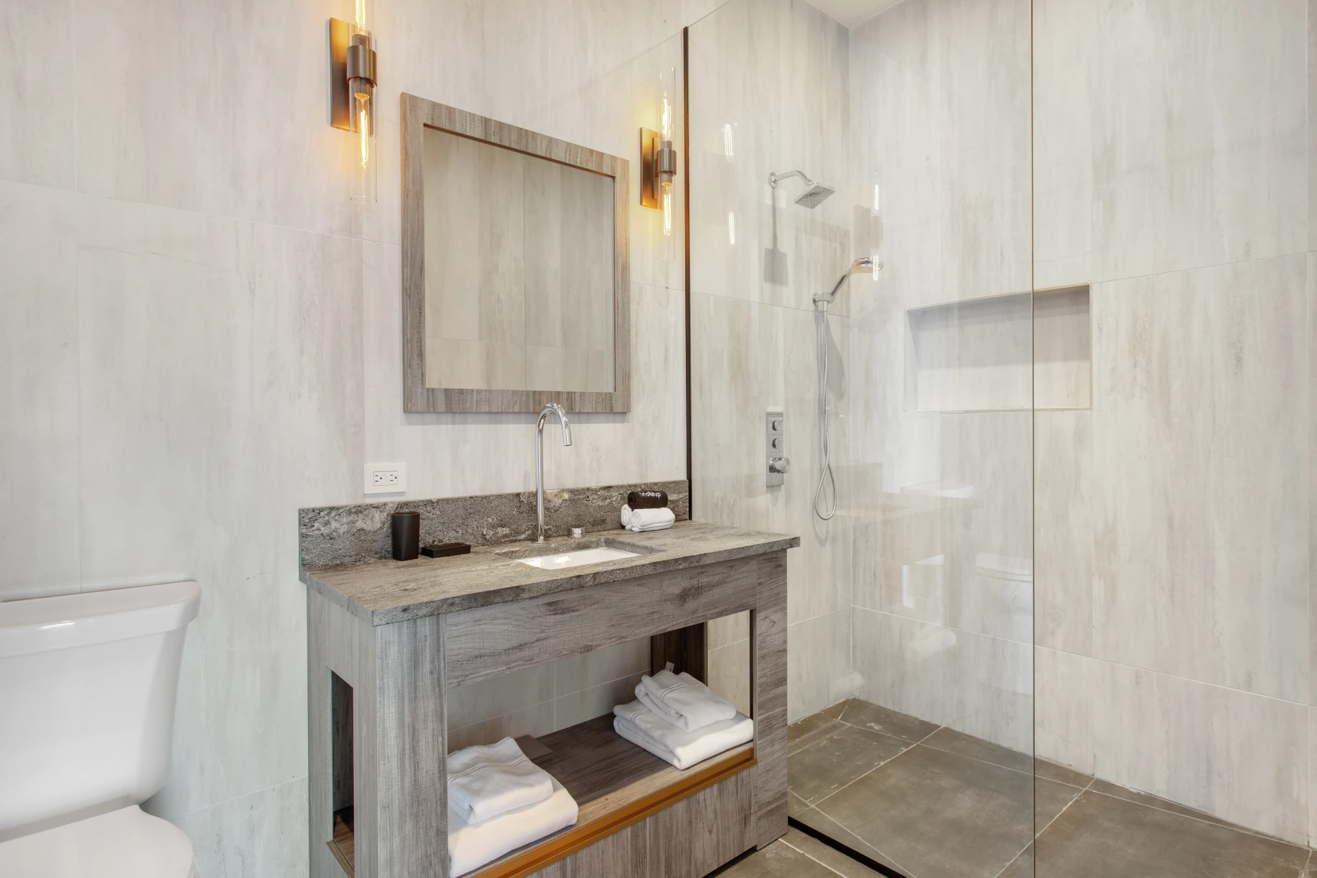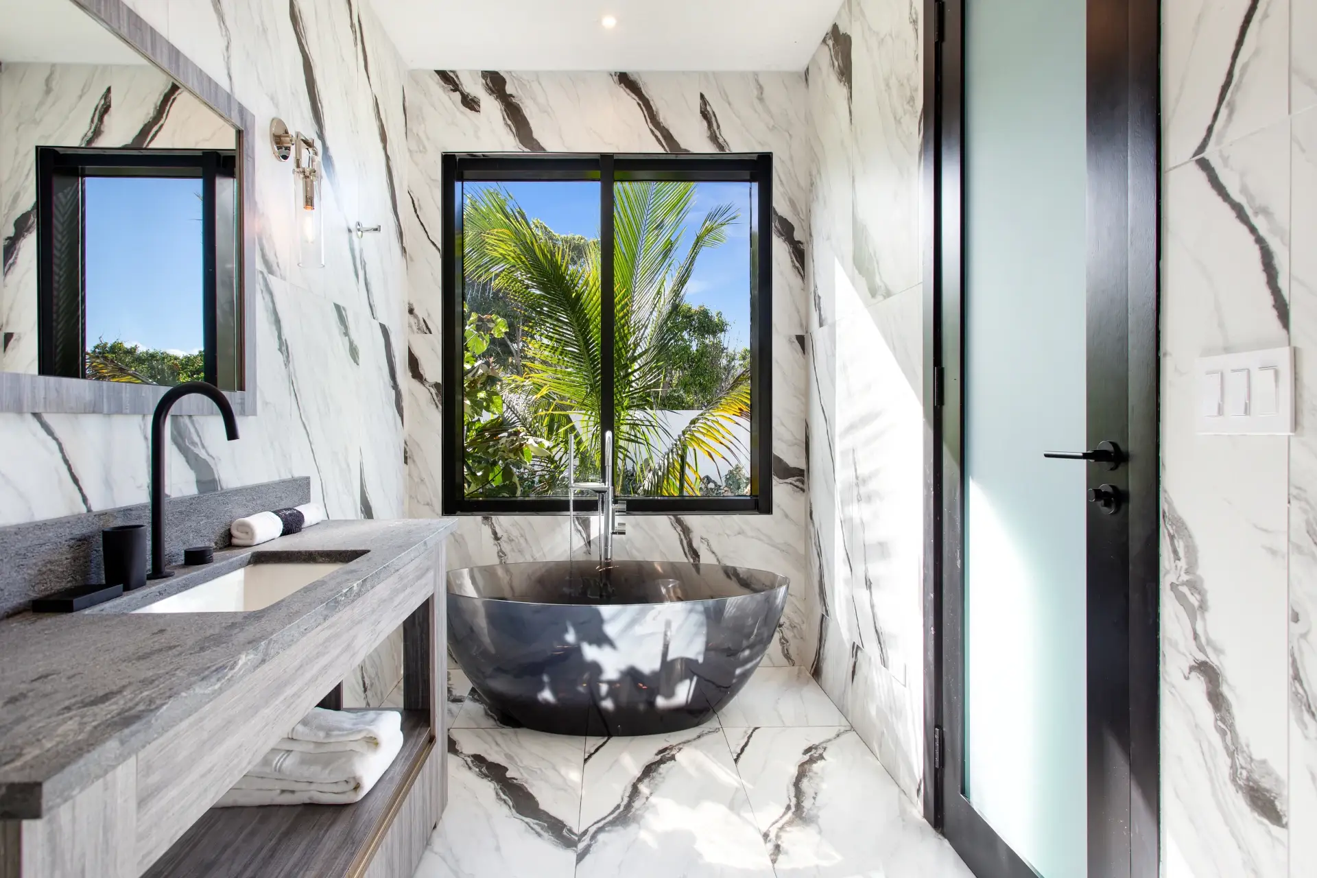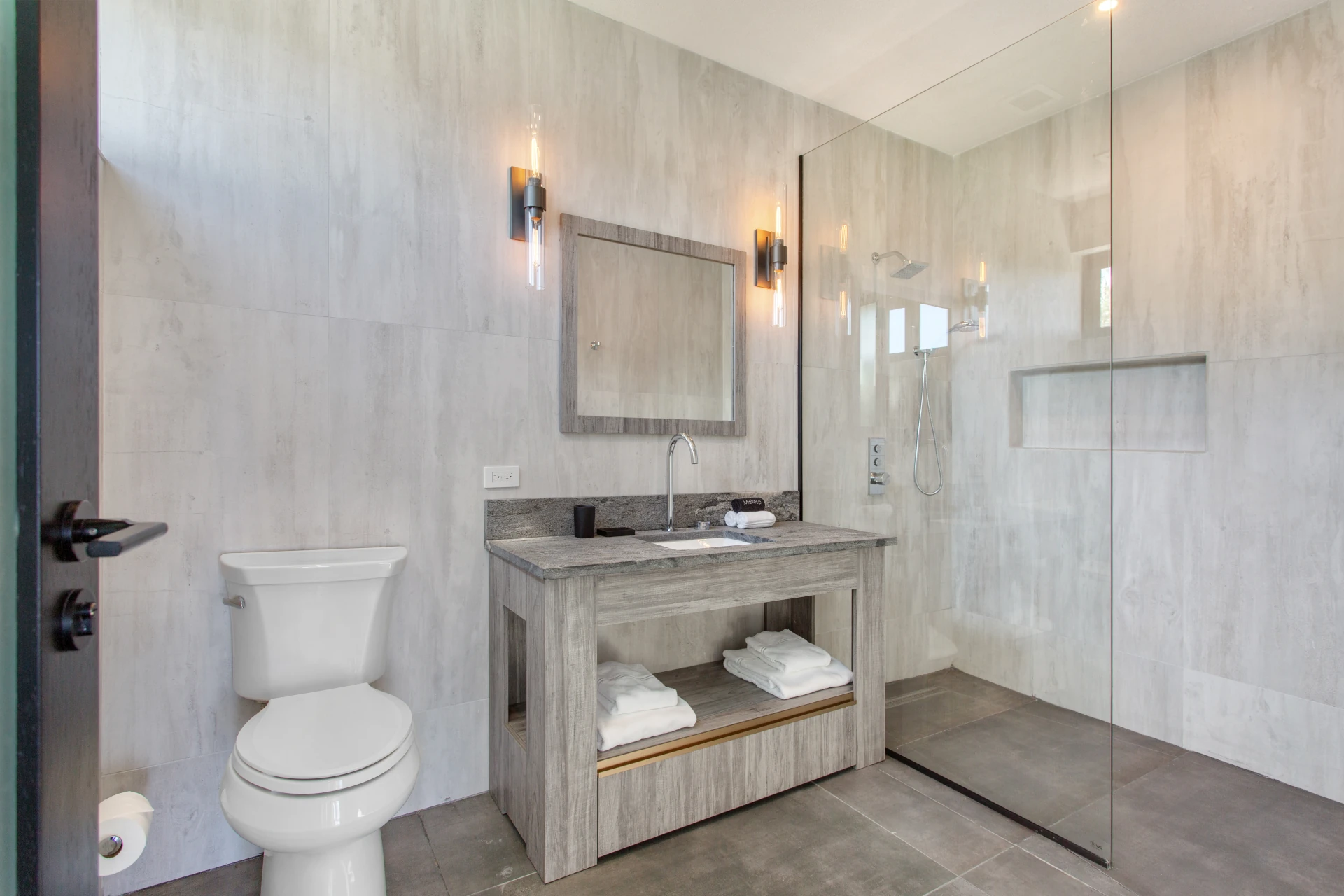 This two-story, four-bedroom villa features refined living spaces designed for comfort and indulgence. On the main floor, two bedrooms offer queen beds and ensuite bathrooms, while another features a king bed and ensuite bath. The primary suite occupies the upper level, boasting his-and-hers bathrooms, a kitchenette, a king bed, and a private perch for enjoying the breathtaking surroundings.