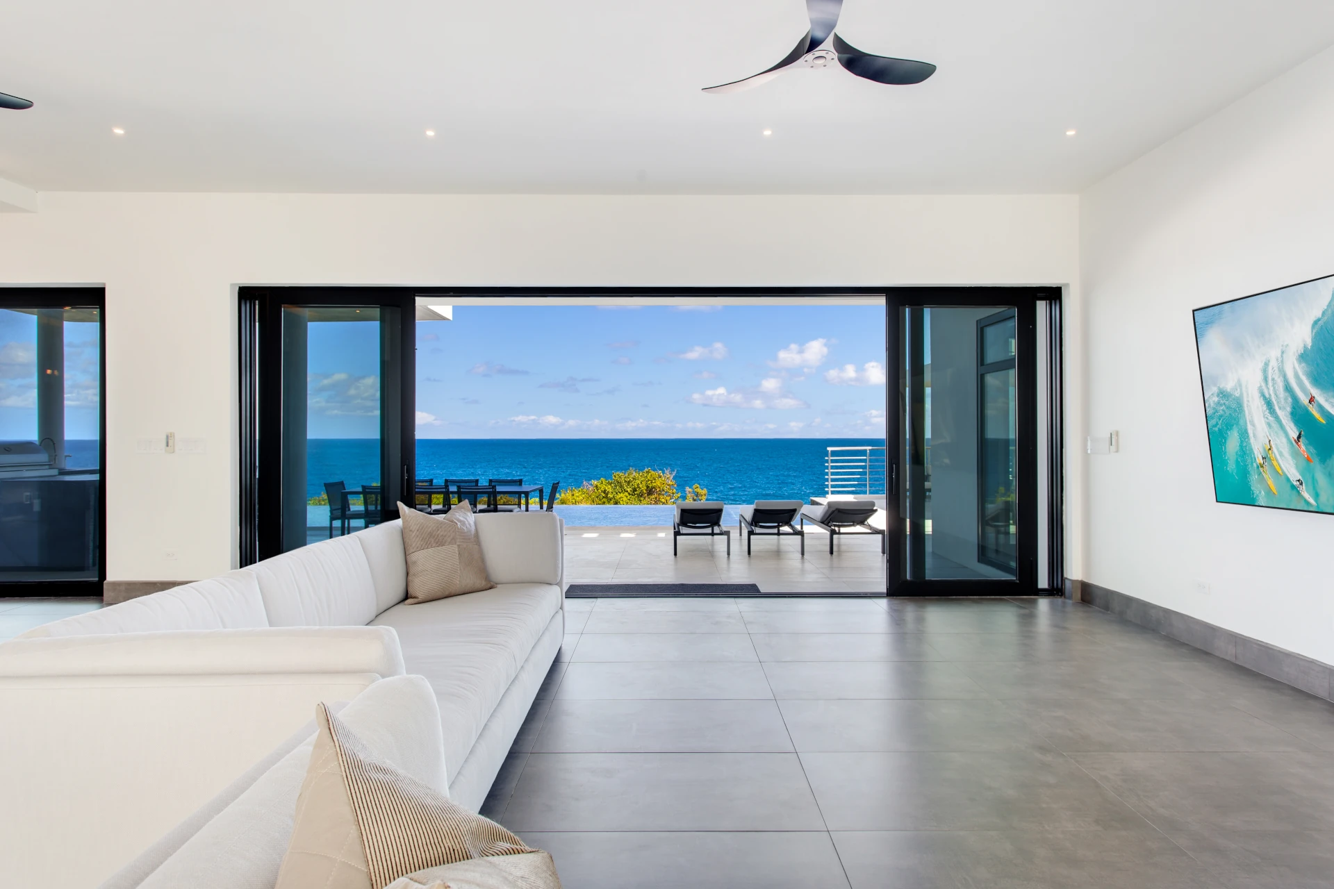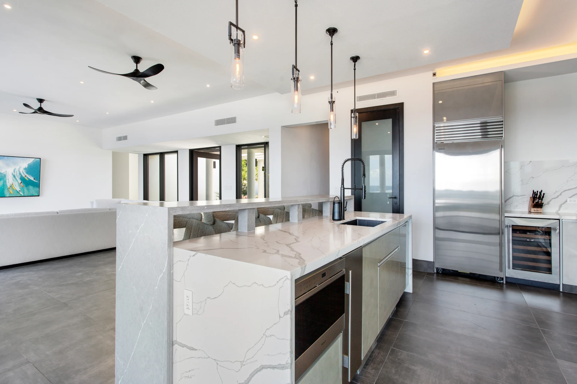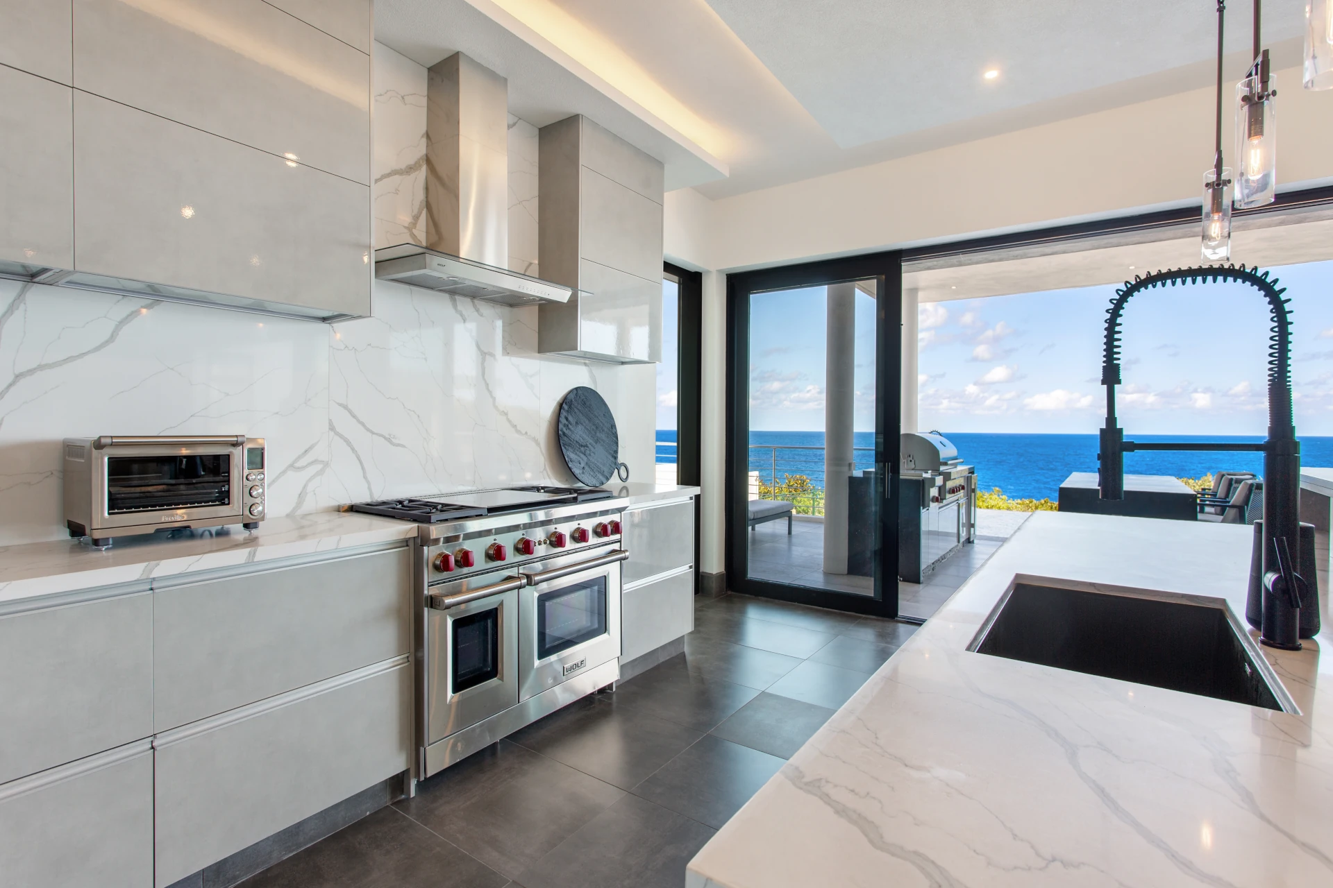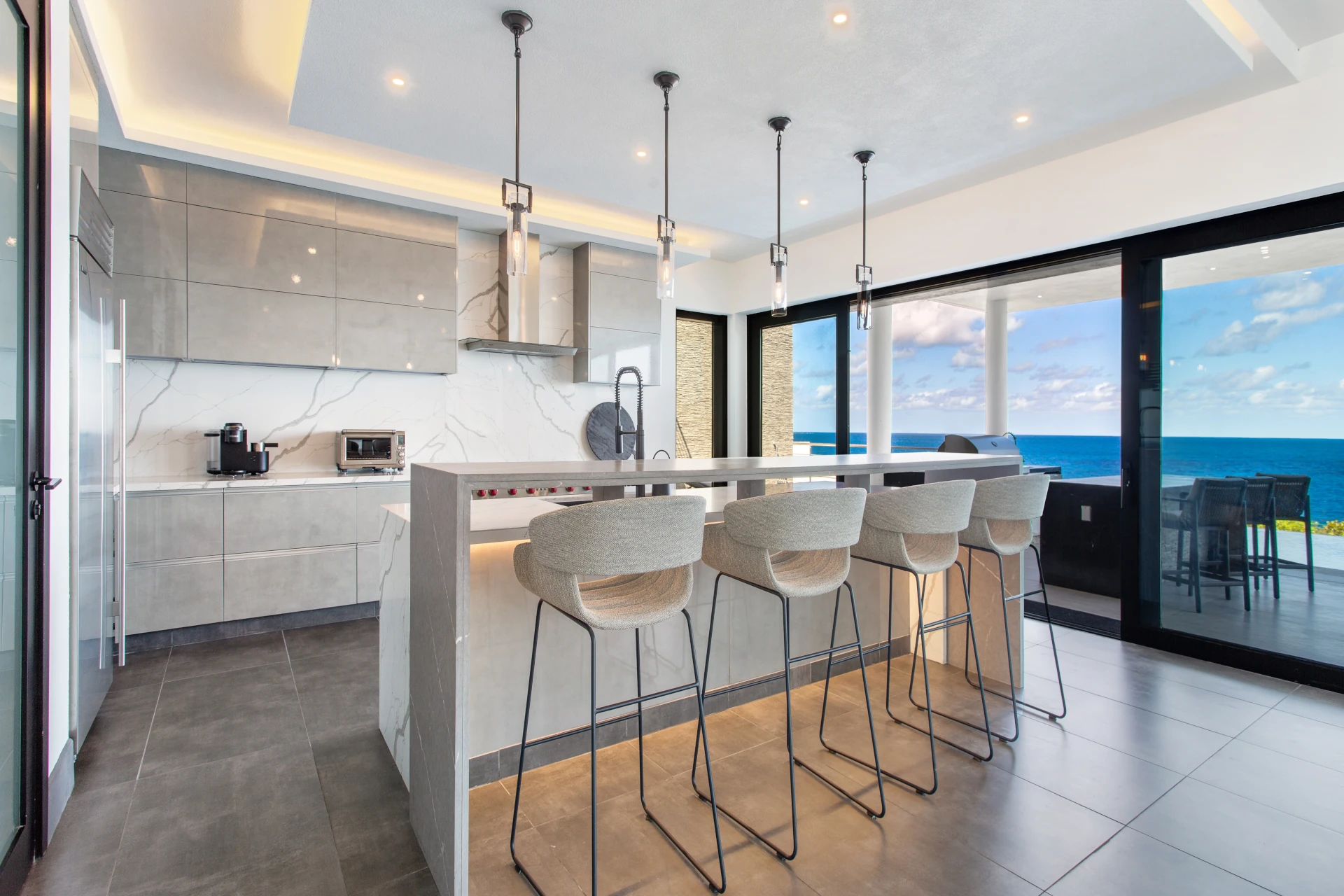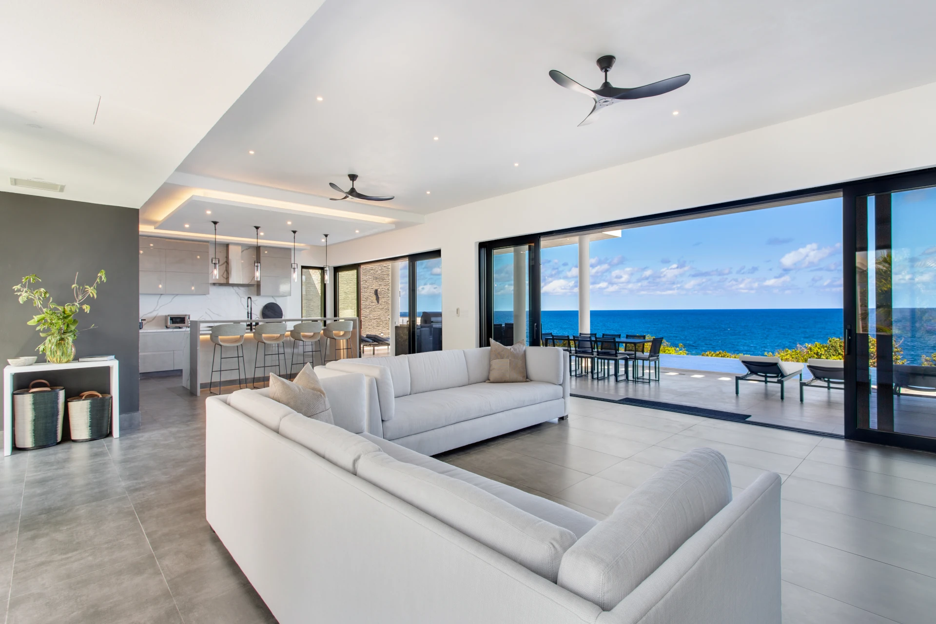 Inside, every room enjoys captivating ocean views, offering a serene backdrop from sunrise to sunset. The spacious living room, with its plush sofas and direct views over the pool and sea, serves as the heart of the home. A state-of-the-art modern kitchen sits just off to the right, ideal for preparing everything from casual breakfasts to gourmet dinners.