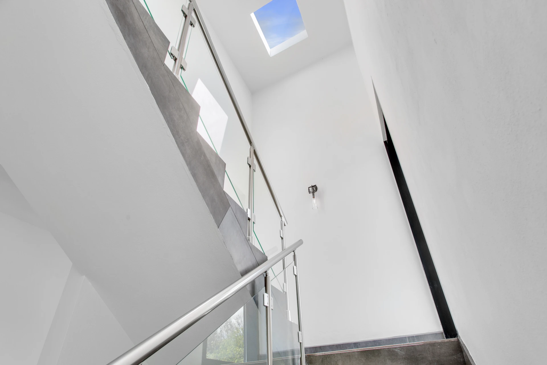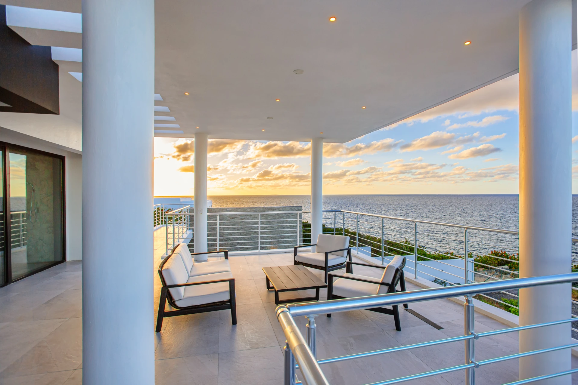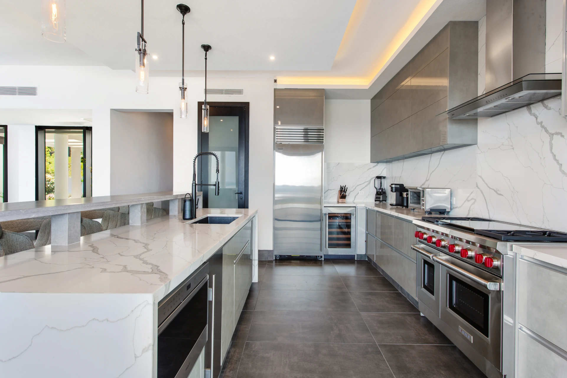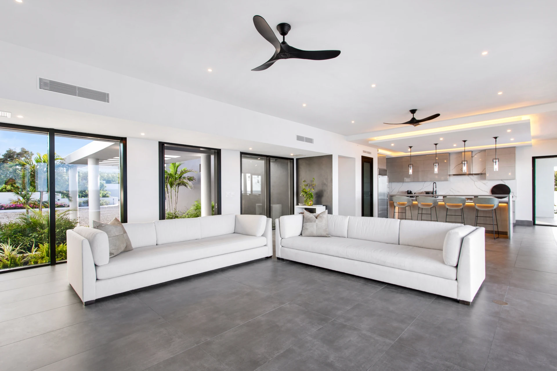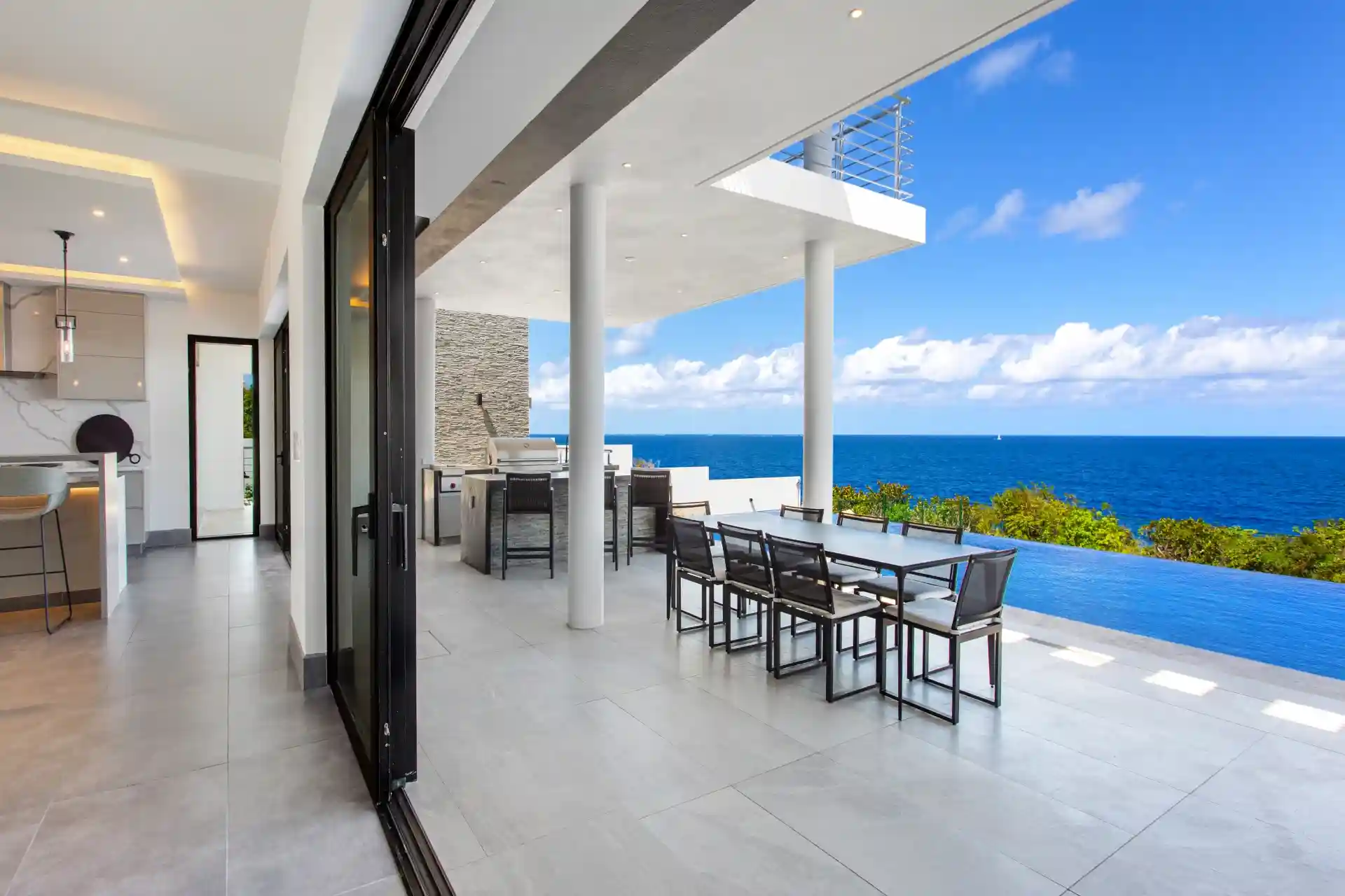 Inside, every room enjoys captivating ocean views, offering a serene backdrop from sunrise to sunset. The spacious living room, with its plush sofas and direct views over the pool and sea, serves as the heart of the home. A state-of-the-art modern kitchen sits just off to the right, ideal for preparing everything from casual breakfasts to gourmet dinners.
