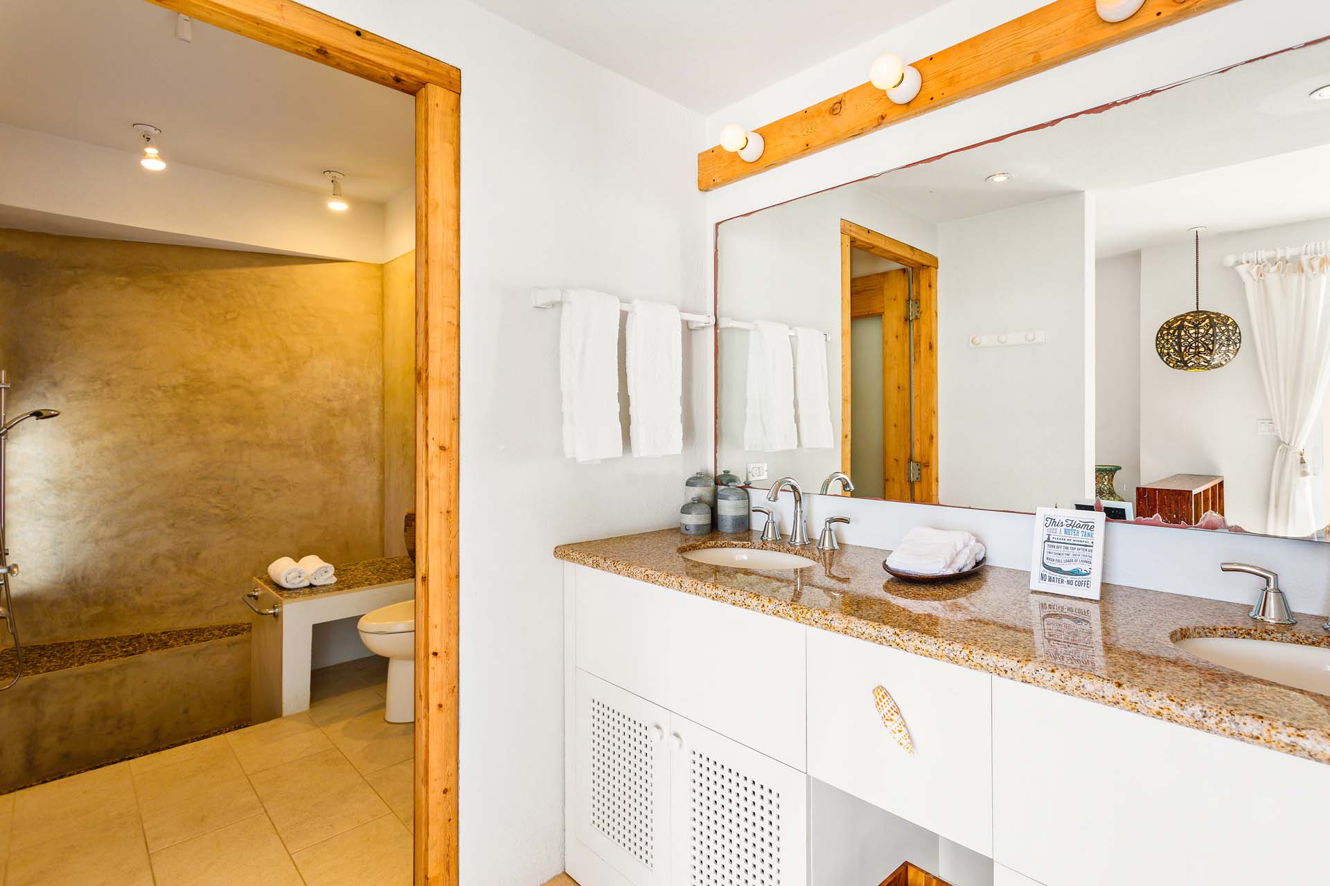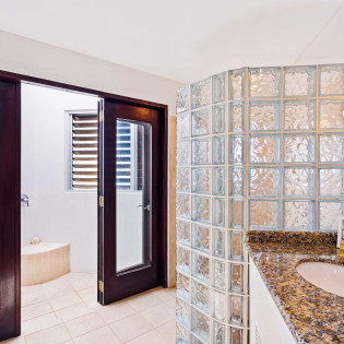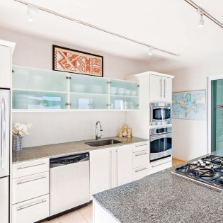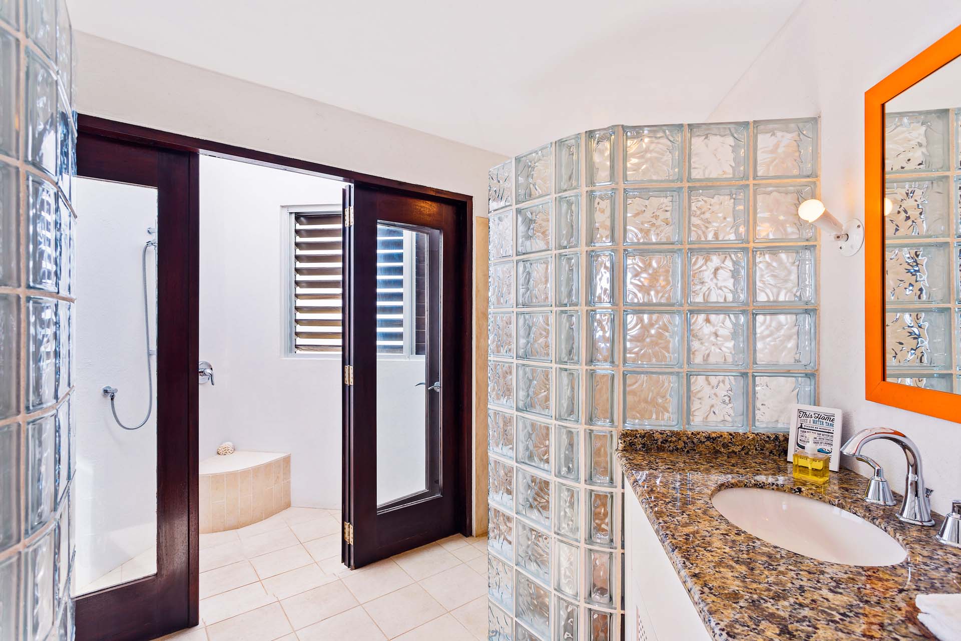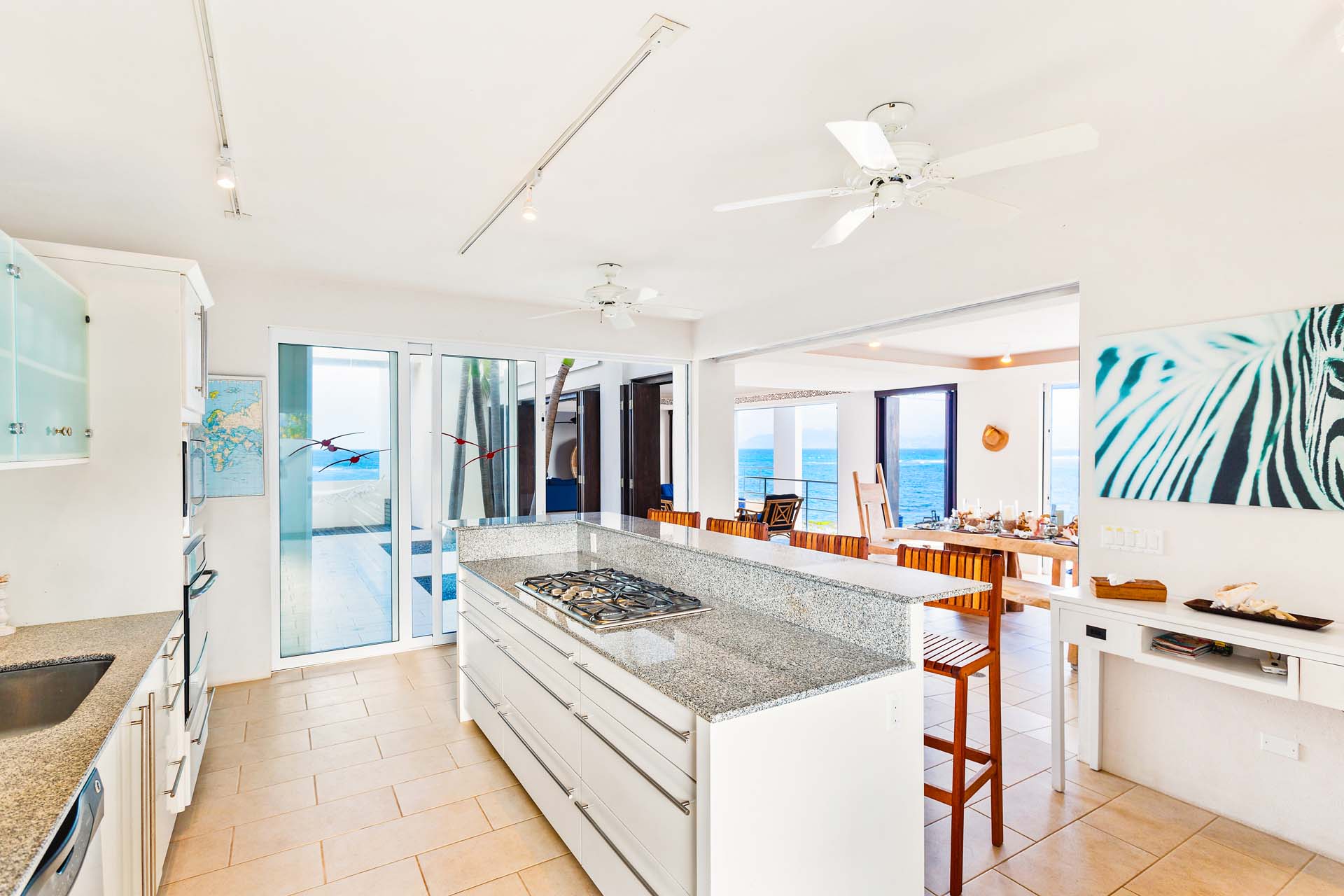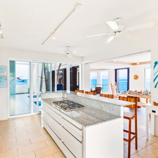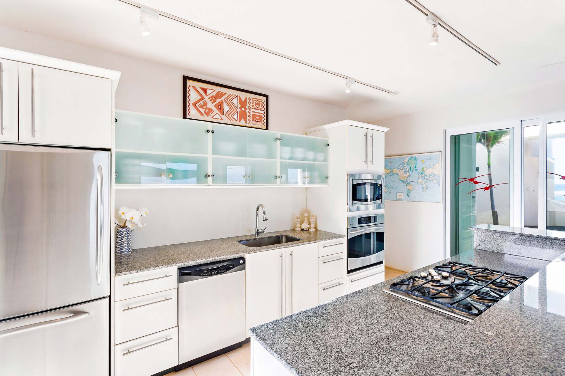 On the other side of the main living room is the dining table, with seating for up to 12 guests. It’s a fabulous setting for elegant island dinner parties, feasting on the local dishes. Behind the dining room is Limin’ da Coconut’s fully equipped kitchen. With a large granite-topped island and GE Profile appliances, cooking here is a breeze. The concierge can even organize a grocery delivery, catered meals, or for a special occasion, a private chef.