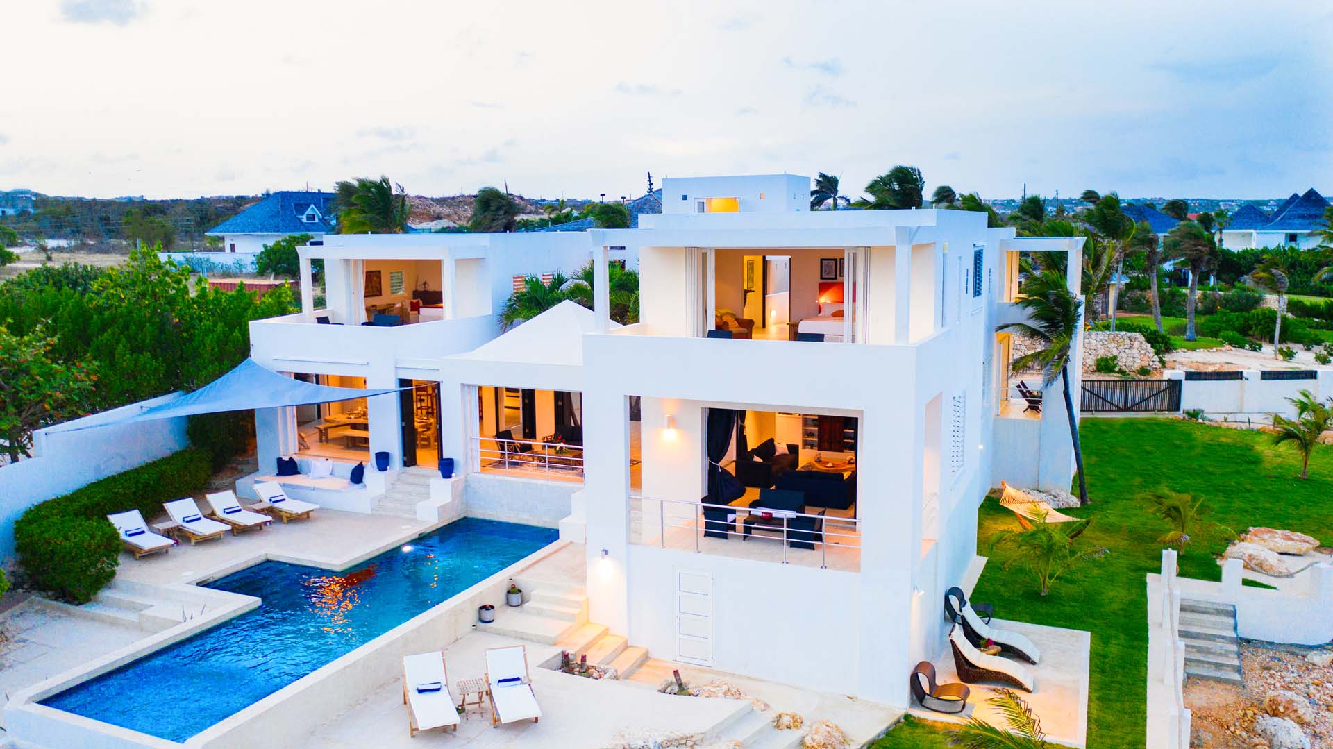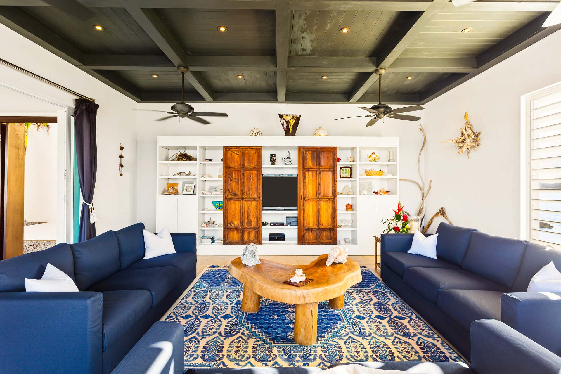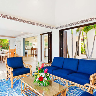 There are 8,000 square feet of luxurious indoor-outdoor living spaces at Villa Limin’ da Coconut. As you enter, you’re delivered into the open-air courtyard and atrium, dotted with palm trees and open to the sky above. Surrounded by open-plan relaxation areas, the flowing design takes in the living room, lounge area, and dining room. The serene living room is an inviting place to relax, with comfortable sofas offering views over the pool terrace and sparkling ocean. To the left is another lounge room, this one with several sofas arranged in front of a flat-screen TV for movie nights.
