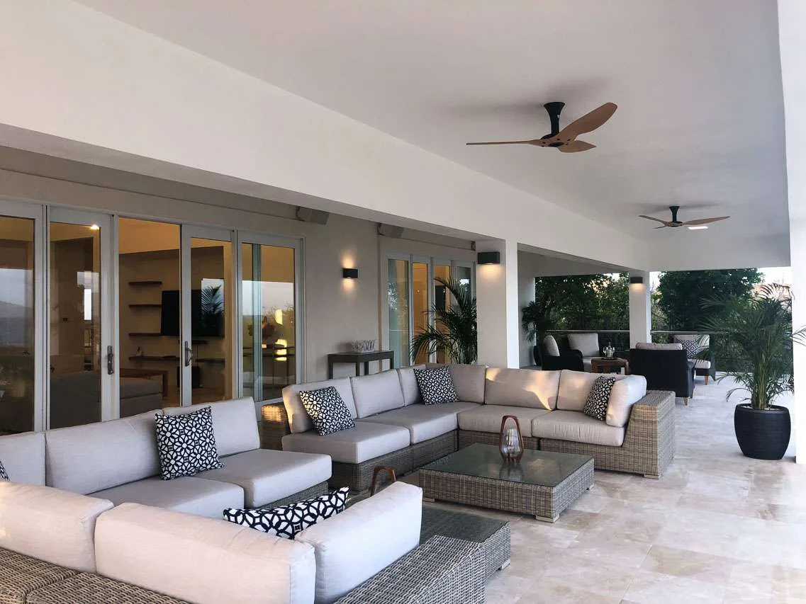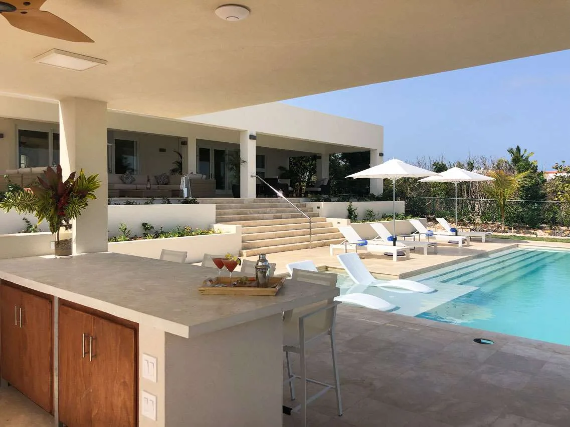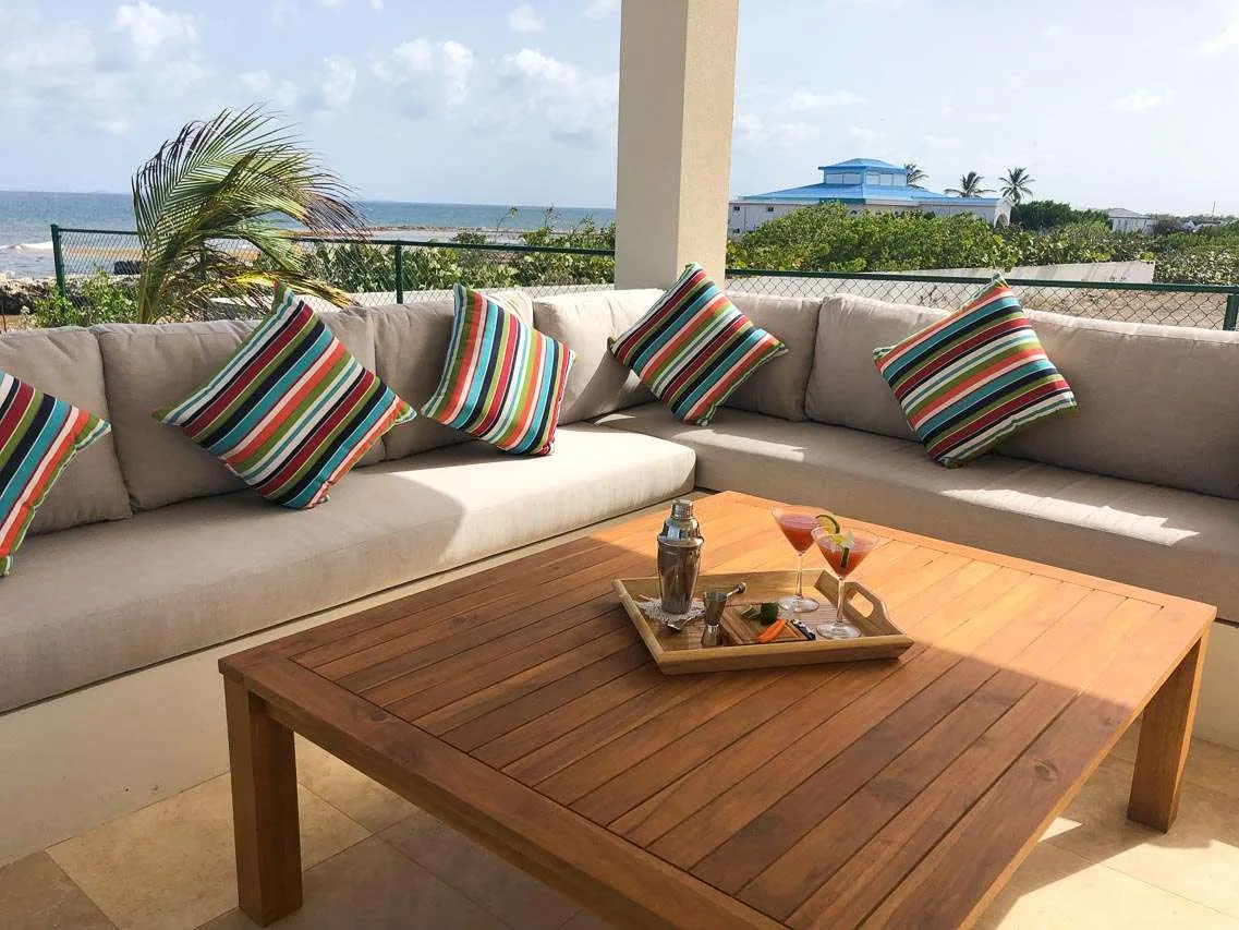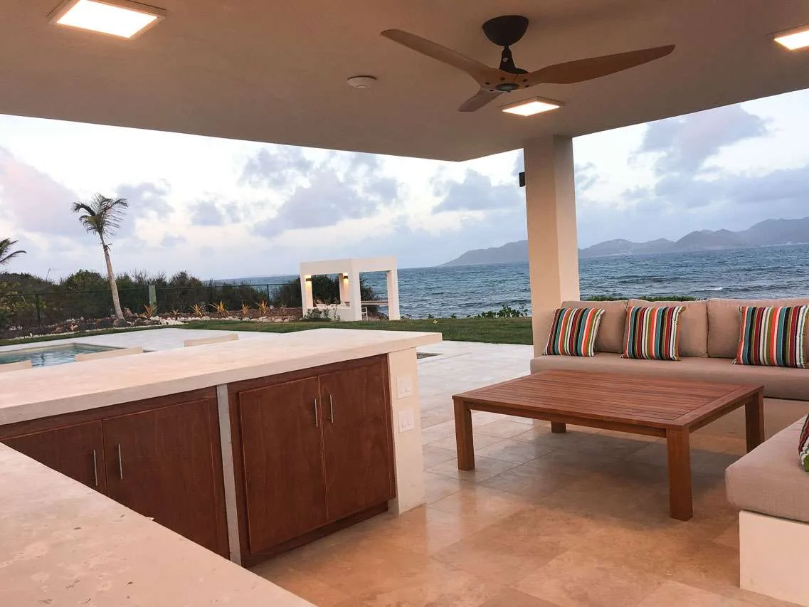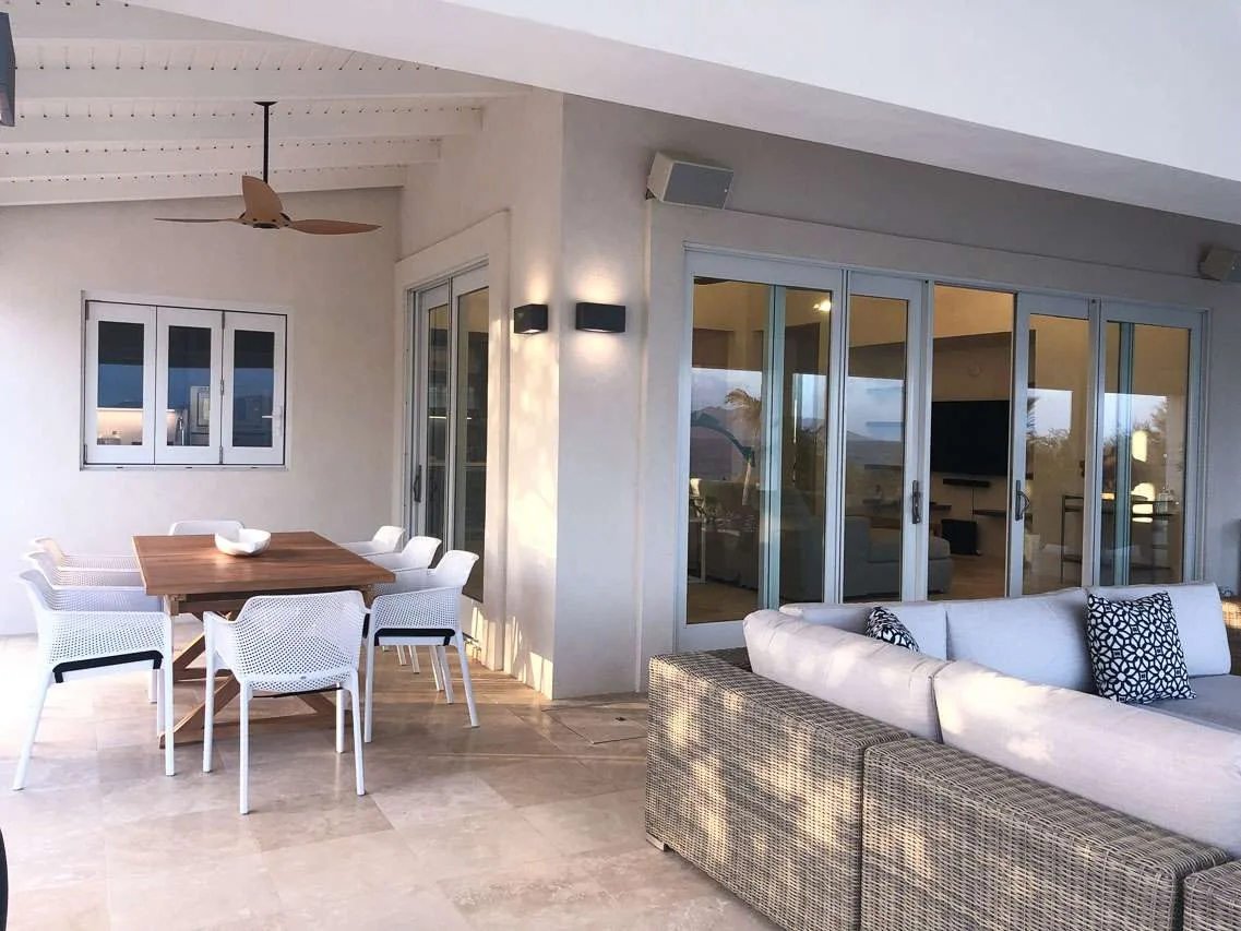 The exquisite living areas of Villa Round Rock continue into the outdoor spaces. The grand covered terrace features the dining table and a comfortable lounge area, a nice spot to unwind with a good book or host a sunset cocktail hour.