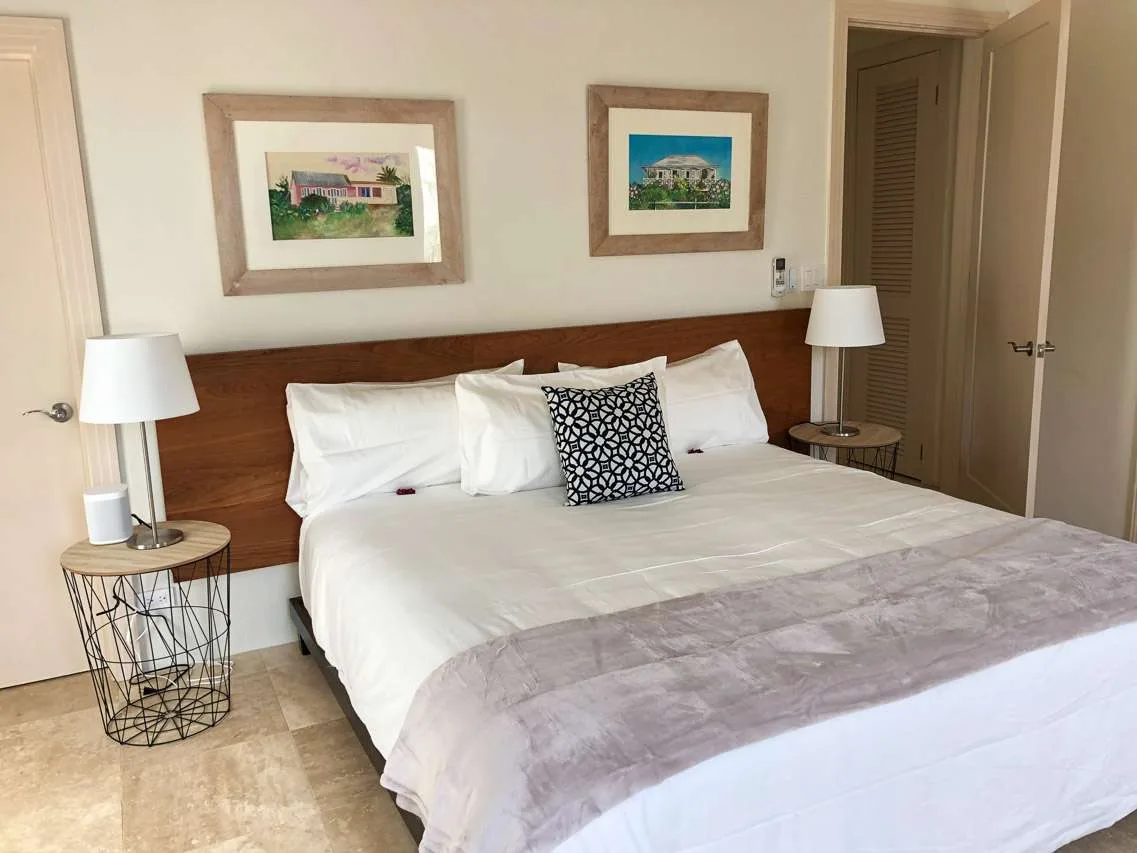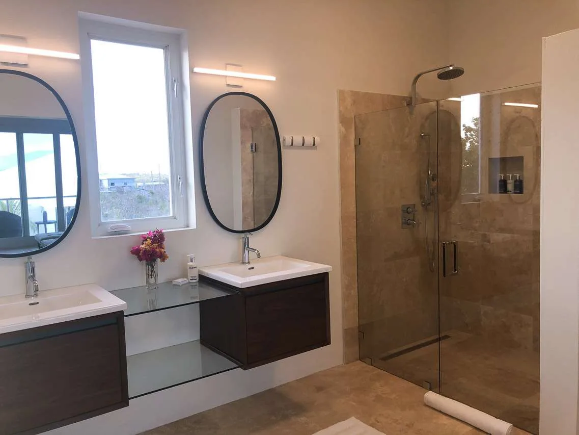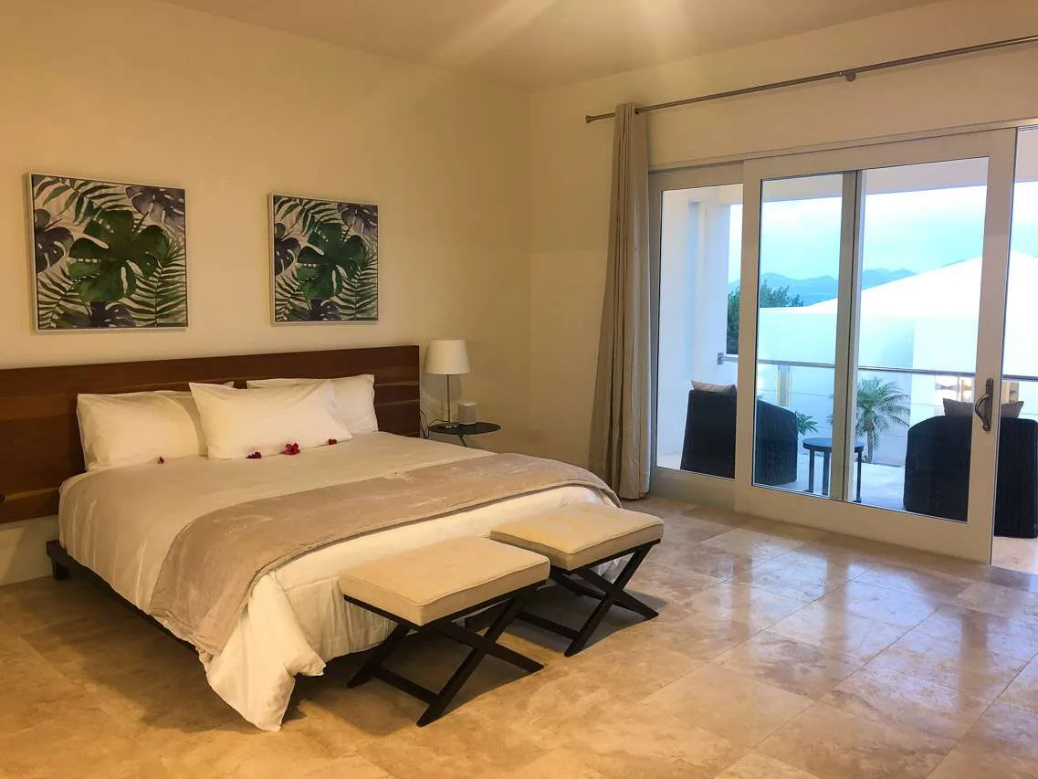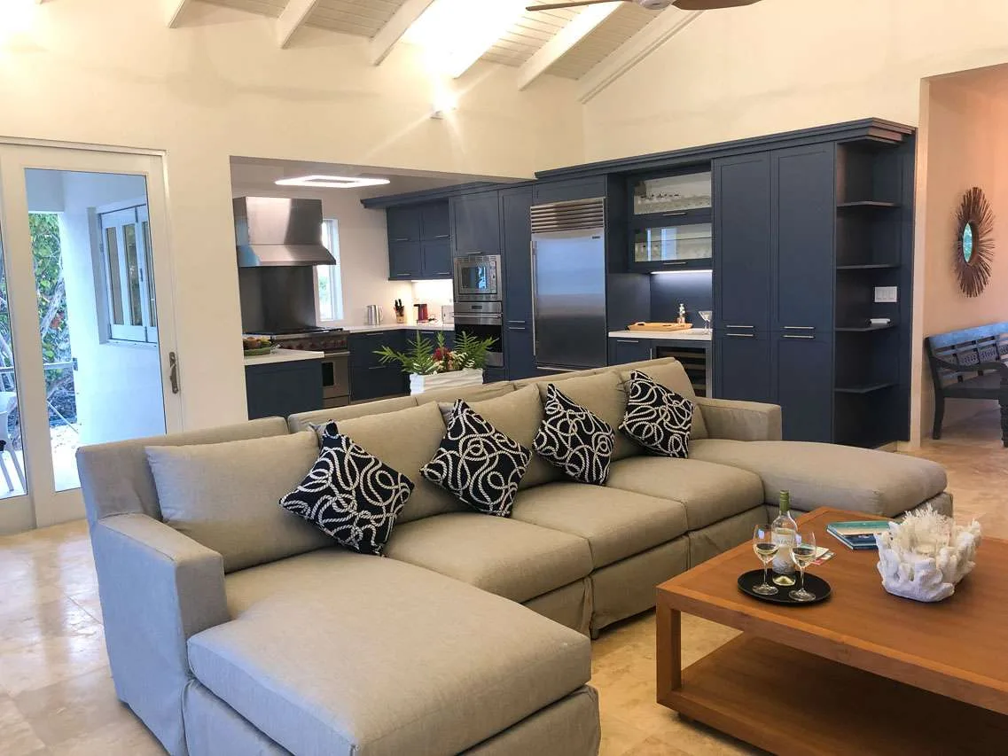 The living room has a plush L-shaped sofa, an inviting place to relax at the end of each day. Doors open onto the pool terrace, letting you unwind with the gentle island breeze. The design is contemporary, with a pleasant mix of neutral tones combining to keep your attention on those stunning ocean views.