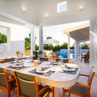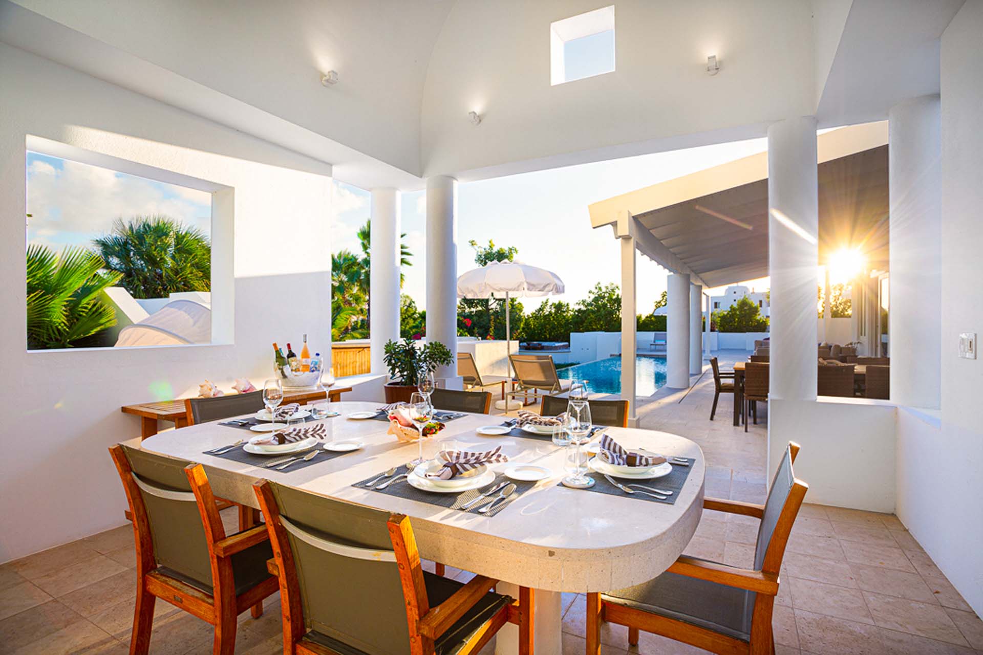 The estate spans 10,000 square feet and is designed for outdoor living and relaxation. At its heart is a stunning pool, perfect for a cooling swim or lounging in the sun. Nearby, a jacuzzi invites quiet moments of leisure, while a barbecue area makes casual outdoor dining effortless. Daybeds, loungers, and multiple terraces create ideal spaces to unwind and enjoy breathtaking sunset views or gather with family and friends. The alfresco dining setup allows guests to savor meals in the warm Caribbean air, surrounded by lush greenery and ocean vistas.