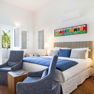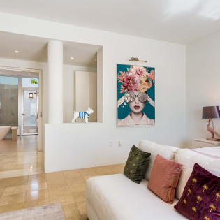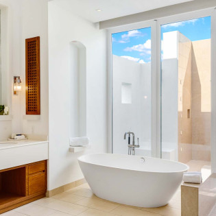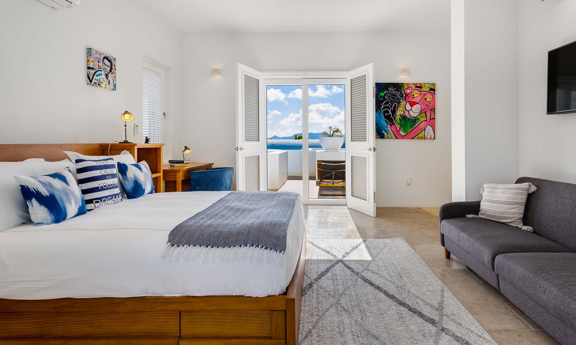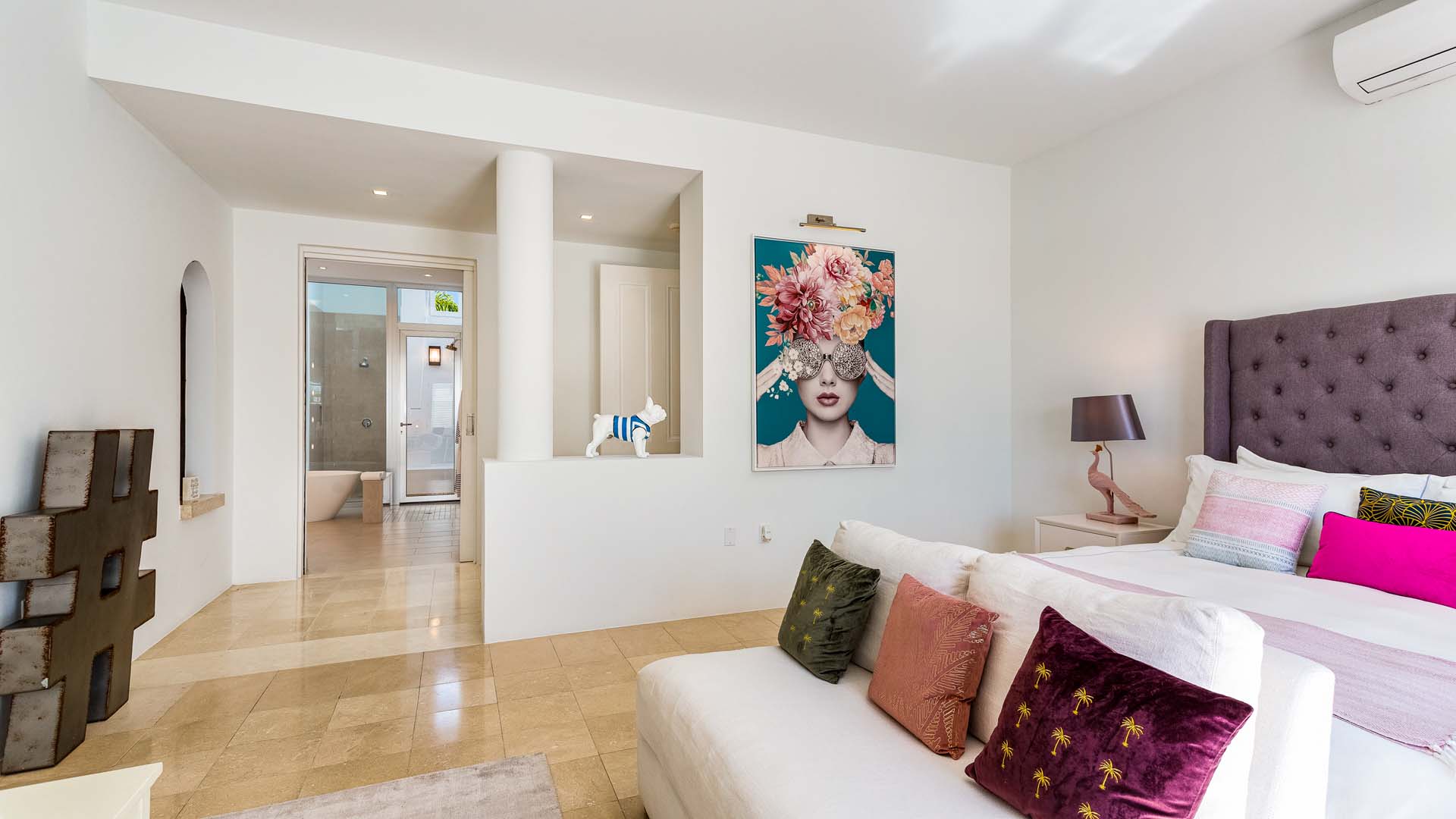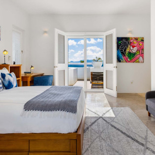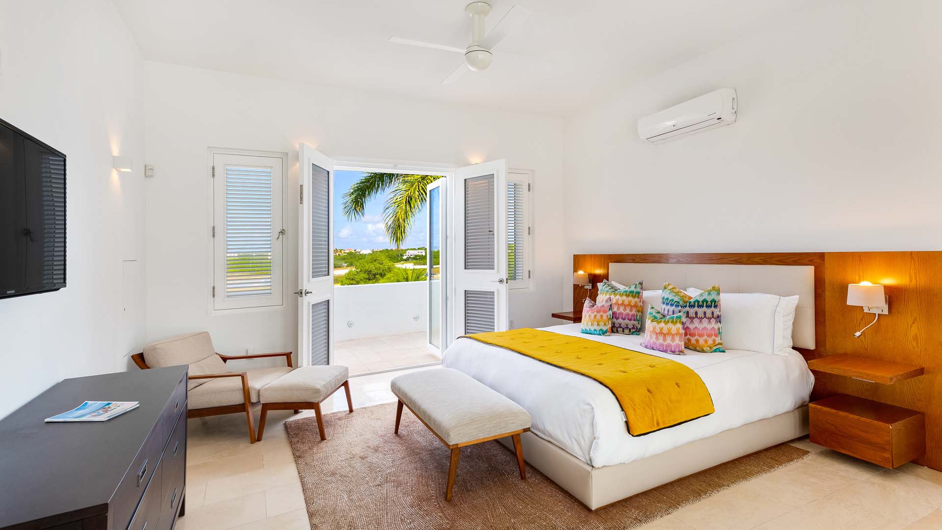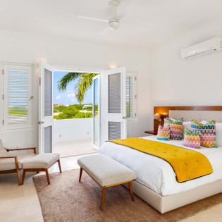Each of the bedrooms are thoughtfully styled with comfort and elegance in mind. Ensuite bathrooms are finished in marble, and the master suites feature both indoor and outdoor bathing options, including rain showers and soaking tubs. Air-conditioning ensures comfort, and floor-to-ceiling doors open to private balconies with uninterrupted views of the sea, turning every sunrise and sunset into a moment of quiet luxury.