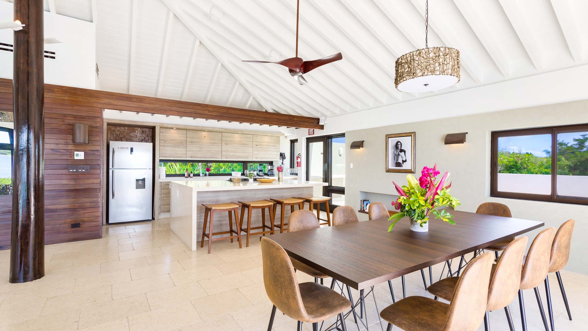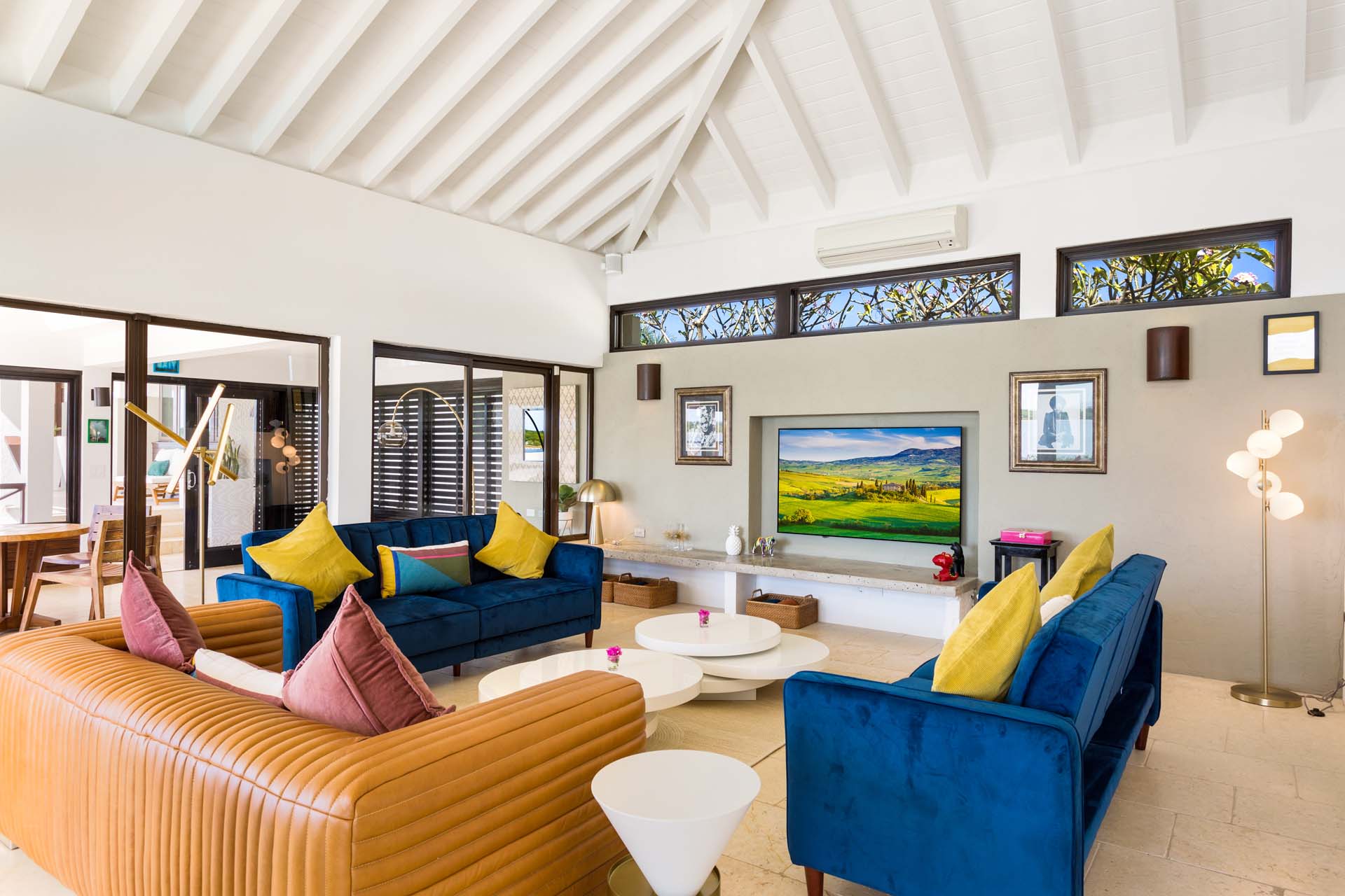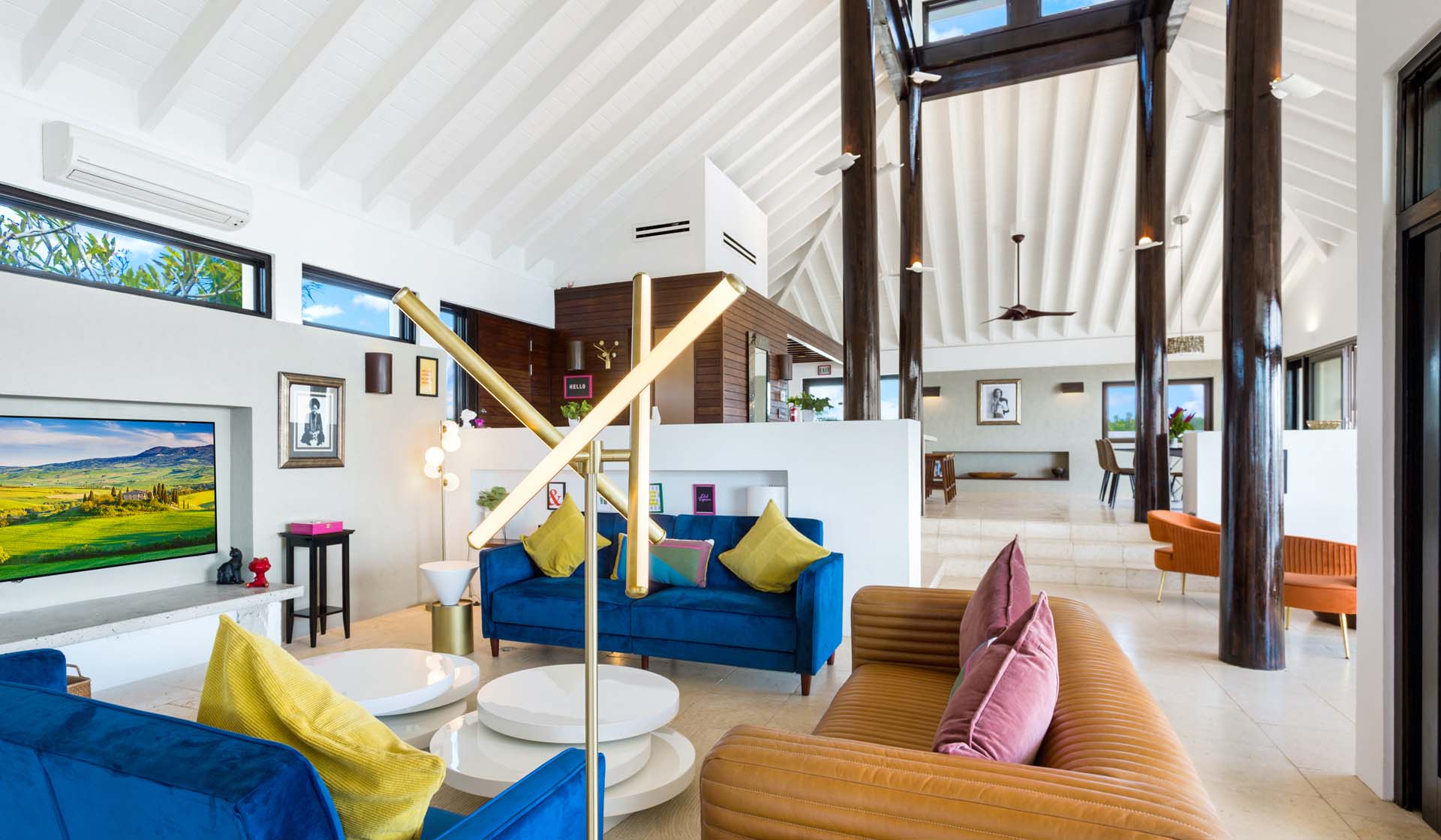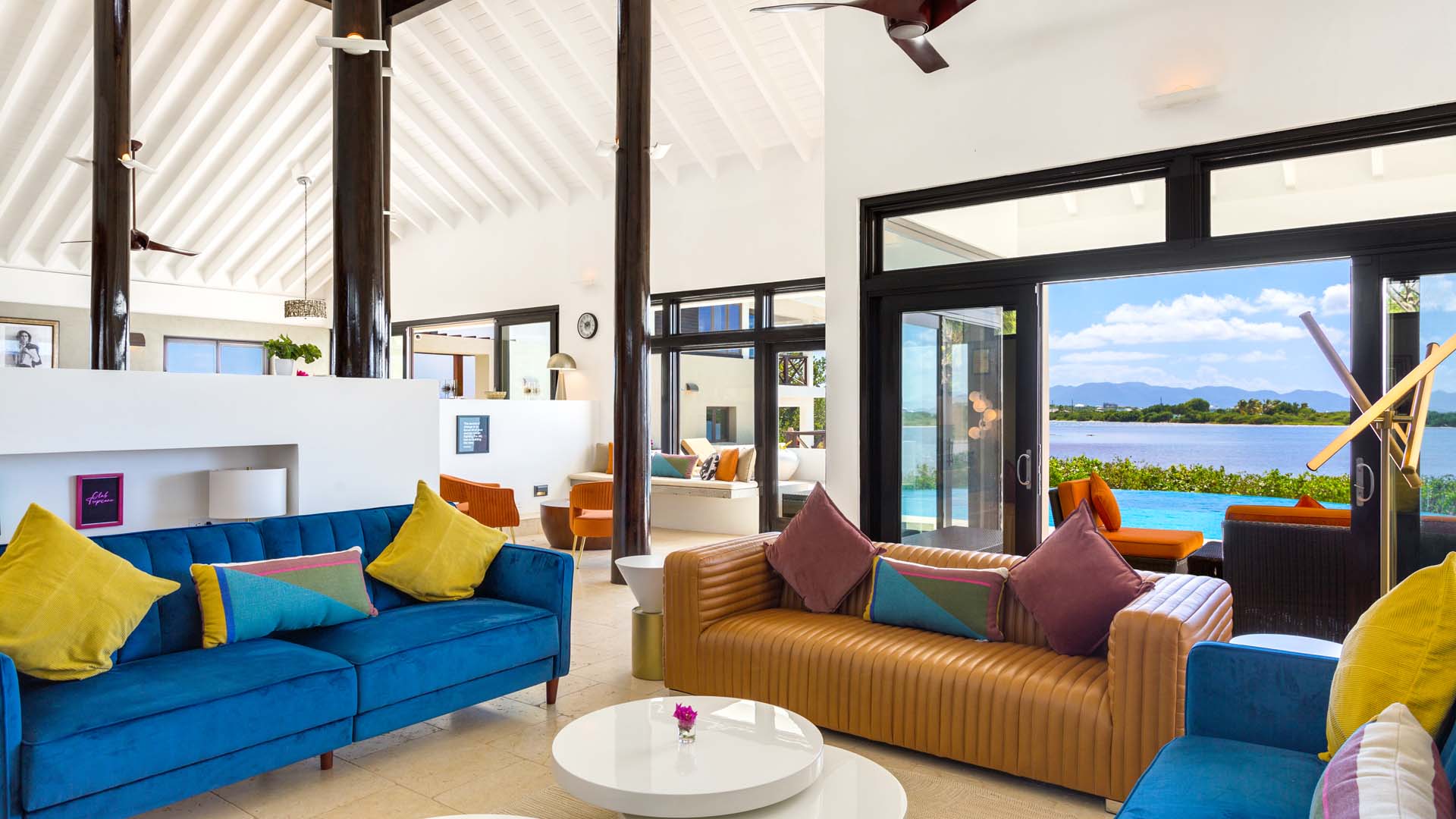 Set against a dramatic backdrop of Rendezvous Bay Beach and the distant silhouette of St. Martin, the villa is drenched in natural light. Expansive windows frame postcard-worthy views and invite in the island’s cooling breezes. Whether sipping coffee in the early morning or enjoying a cocktail as the sun dips below the horizon, guests will find countless spaces to relax and take in the scenery. The spacious terrace offers an idyllic perch to admire the sweeping, uninterrupted vistas.