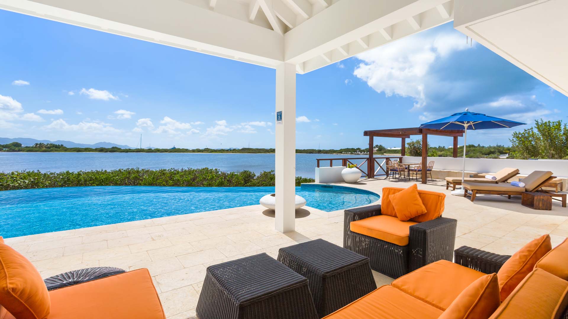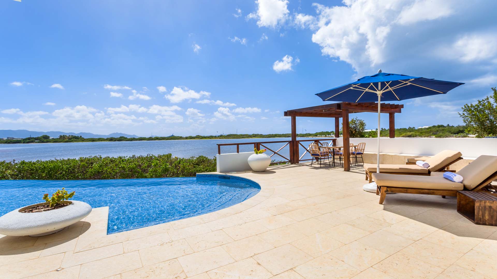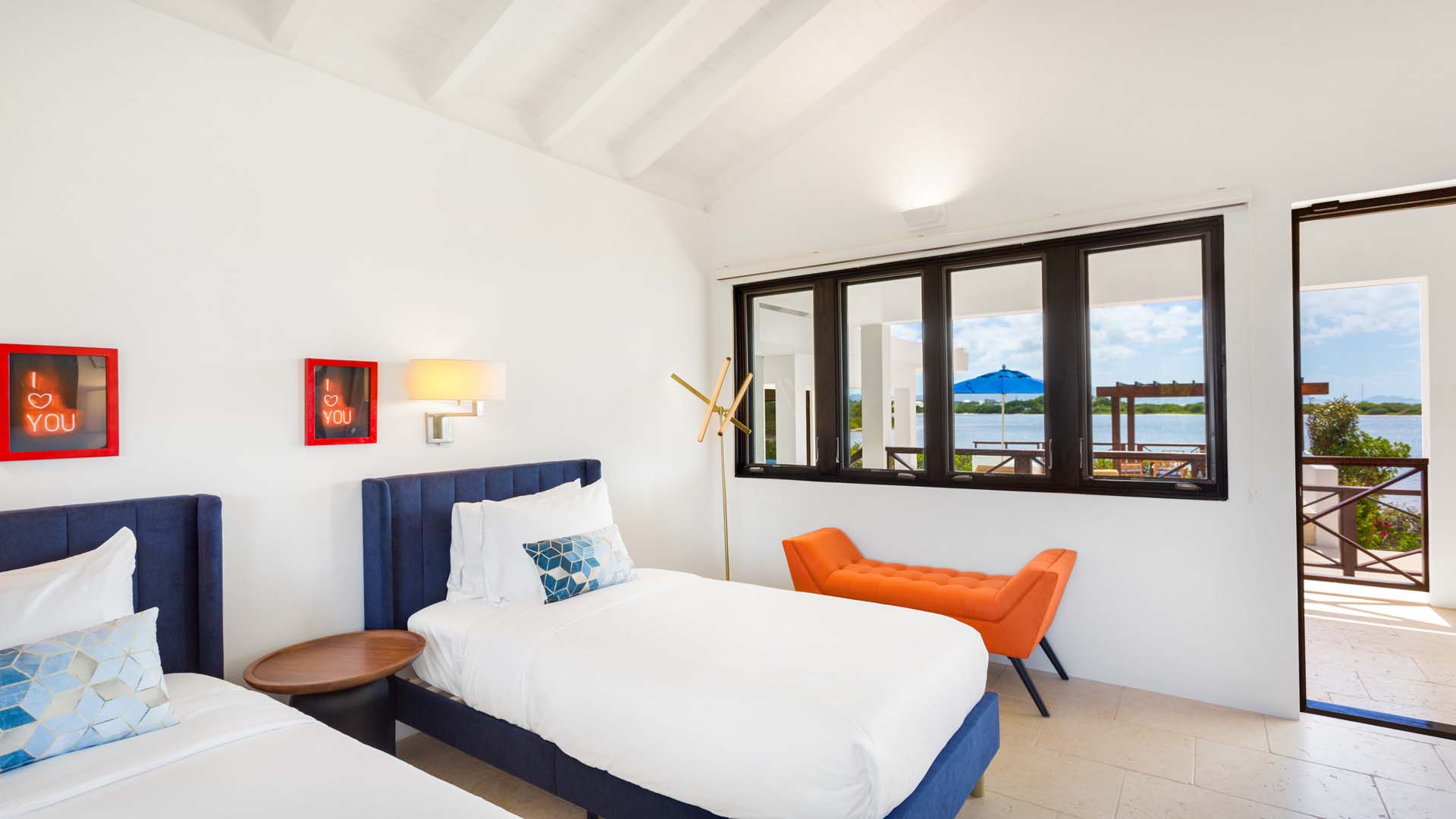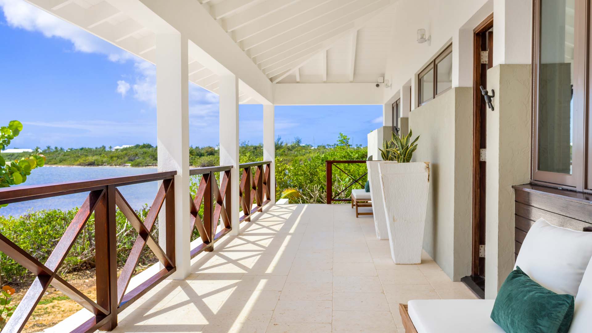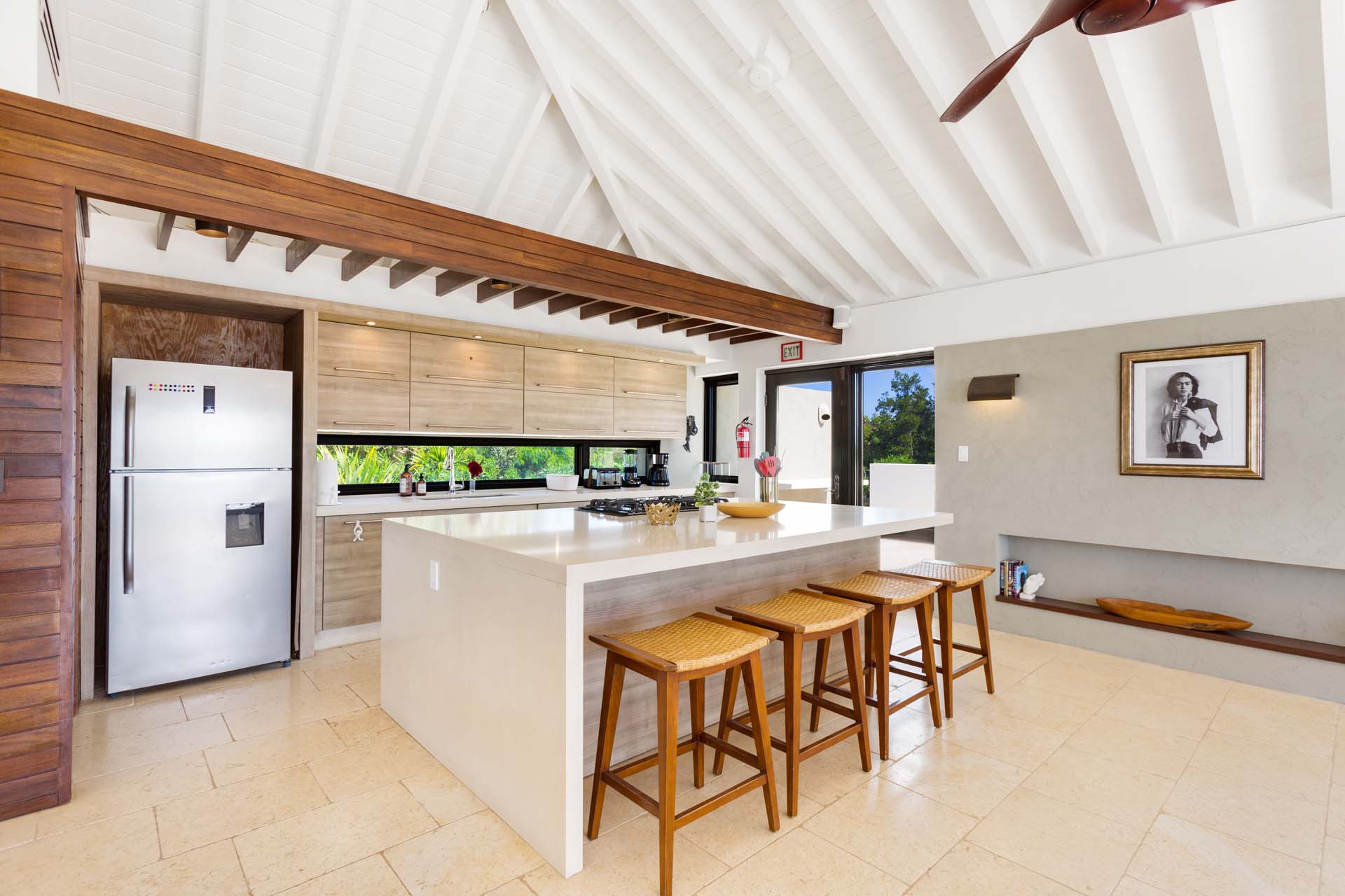 Set against a dramatic backdrop of Rendezvous Bay Beach and the distant silhouette of St. Martin, the villa is drenched in natural light. Expansive windows frame postcard-worthy views and invite in the island’s cooling breezes. Whether sipping coffee in the early morning or enjoying a cocktail as the sun dips below the horizon, guests will find countless spaces to relax and take in the scenery. The spacious terrace offers an idyllic perch to admire the sweeping, uninterrupted vistas.
