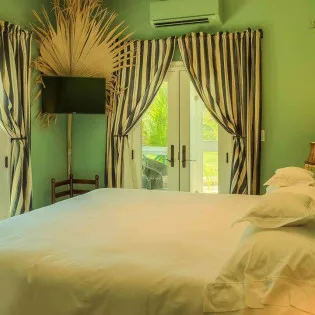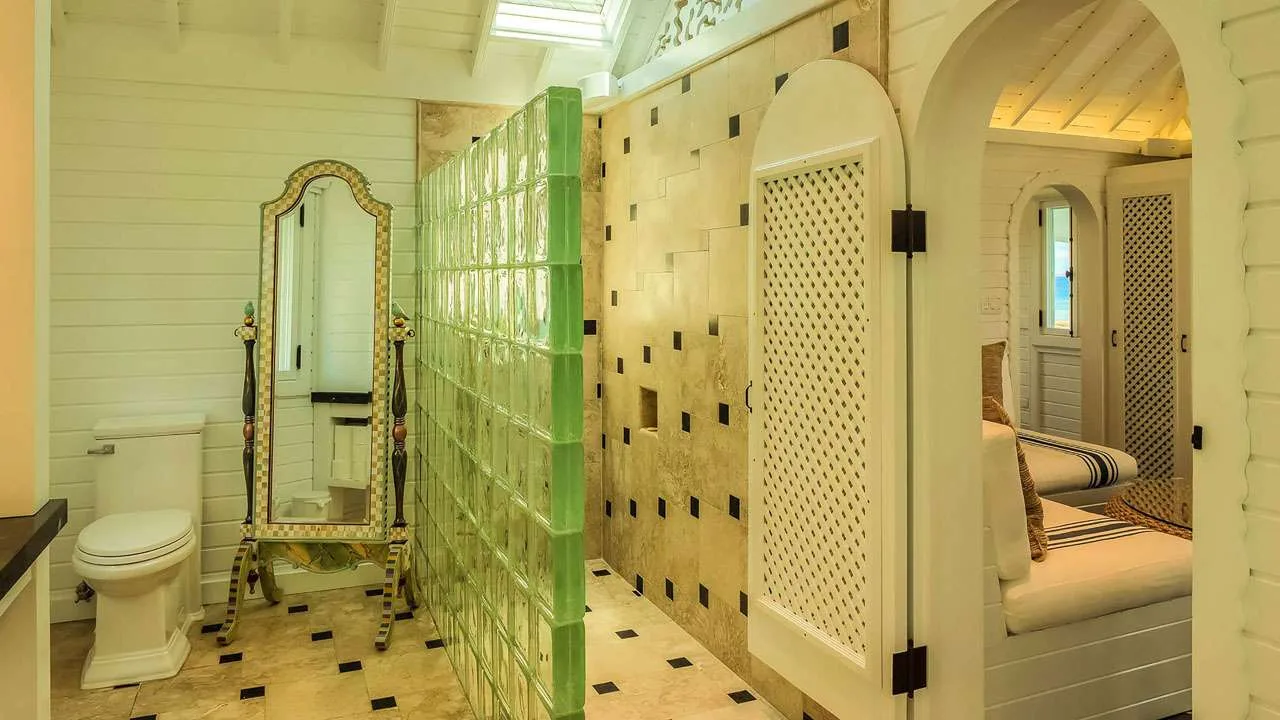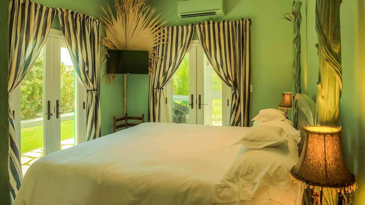 The bedrooms at Villa Tigh-na-Mara spread across the property to ensure privacy for guests. Each features vibrant tropical colors, plush furnishings, and an ensuite bathroom.