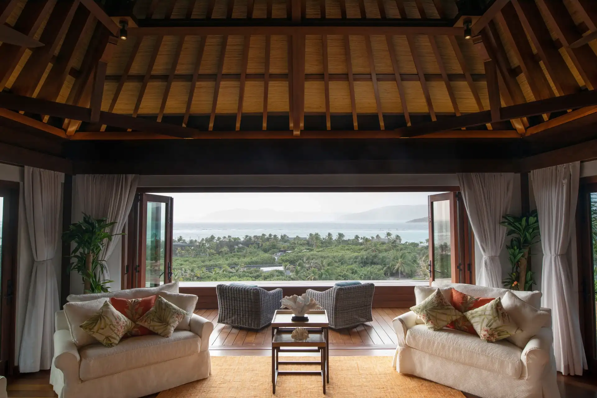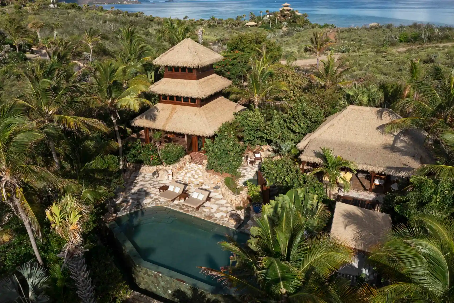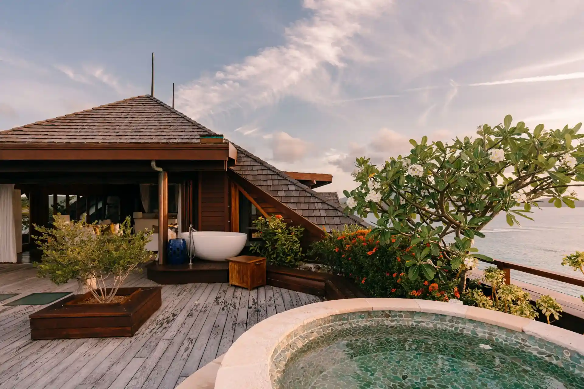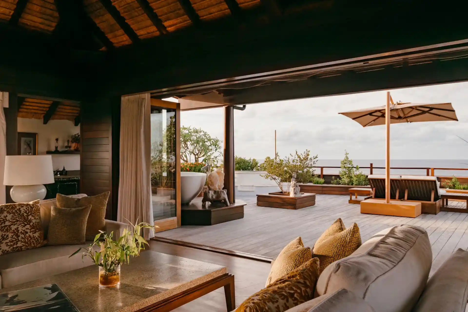 Bali Hi sleeps up to ten guests across five rooms in three Balinese-style houses, offering stunning ocean views, a shared pool and outdoor lounge area, and a plunge pool per house.