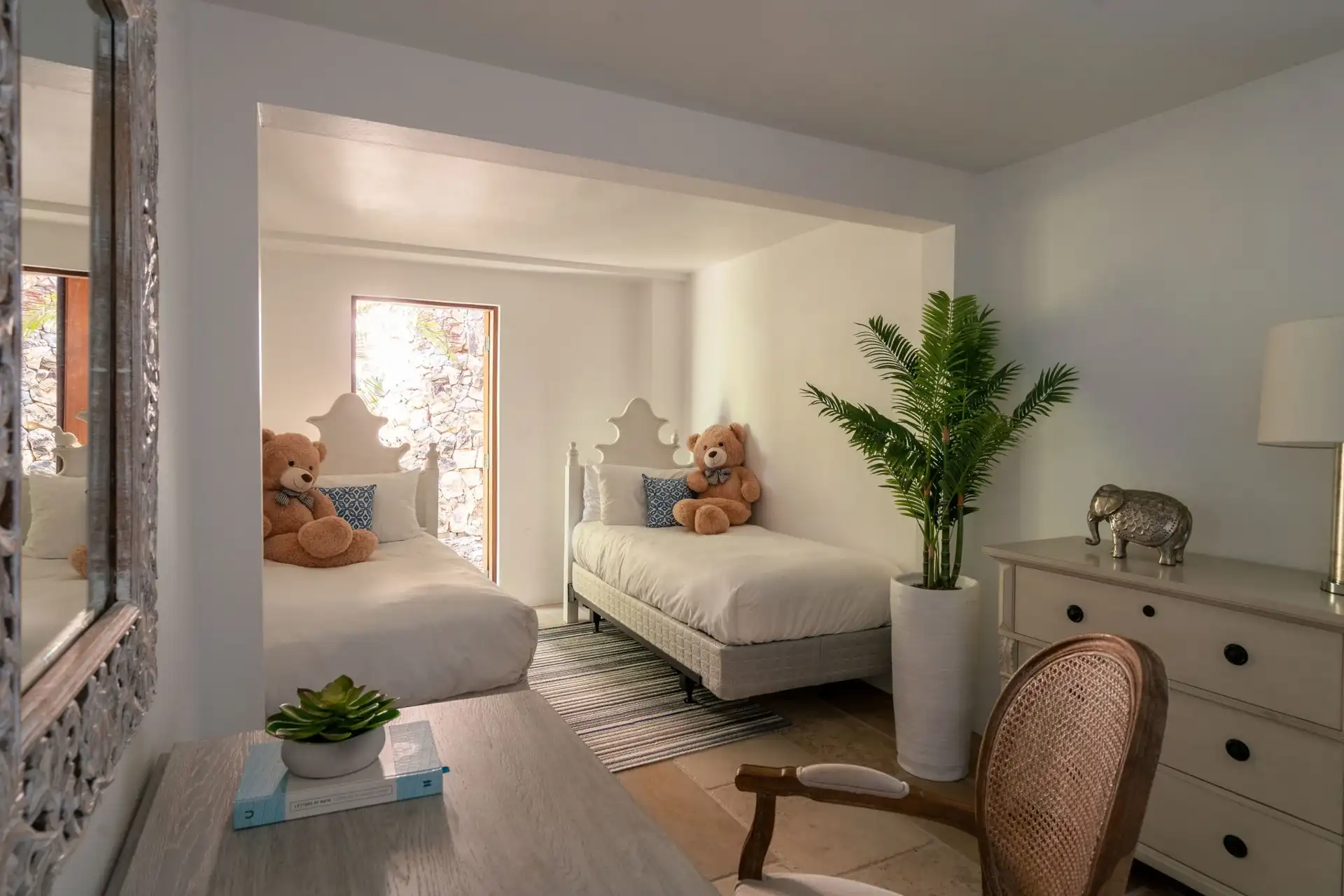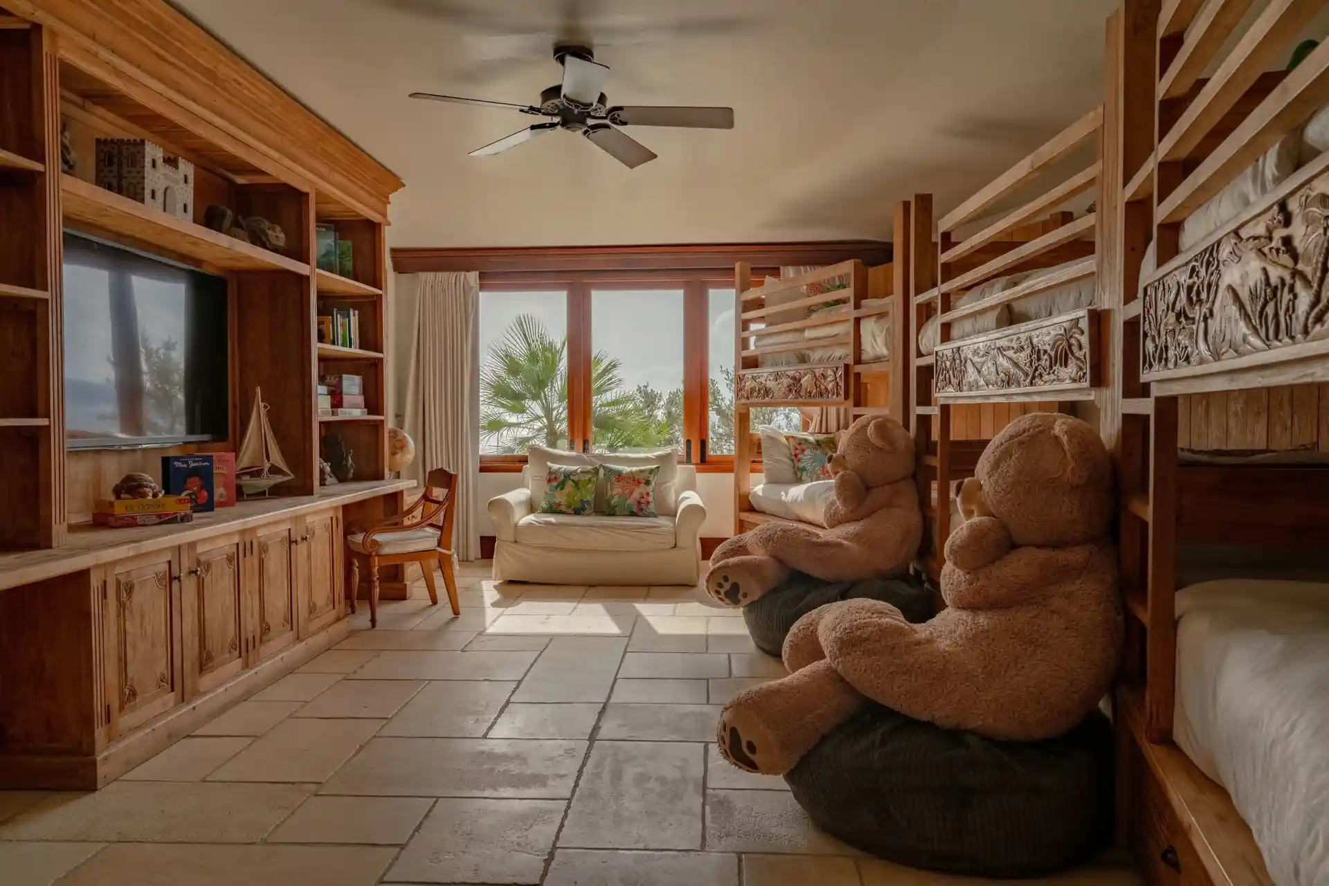 The spacious Master Suite takes up the entire top floor of The Great House and has three terraces, one of which has a hot tub and outdoor bathtub and shower. The Bunkroom is the fun and inclusive space for children to enjoy day and night. Designed with 3 sets of bunk beds there’s ample space to relax and hang out together, with luxurious home comforts.