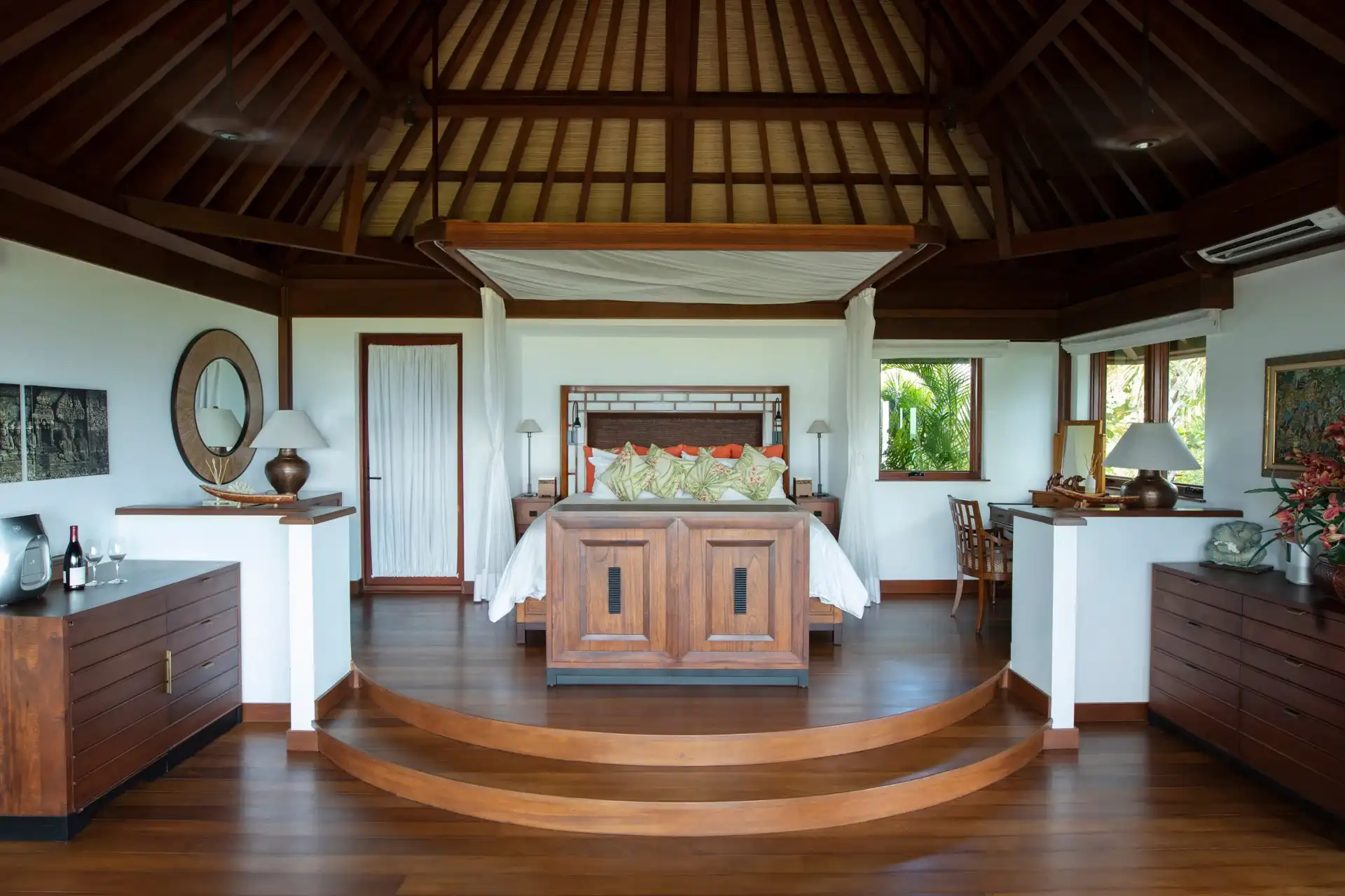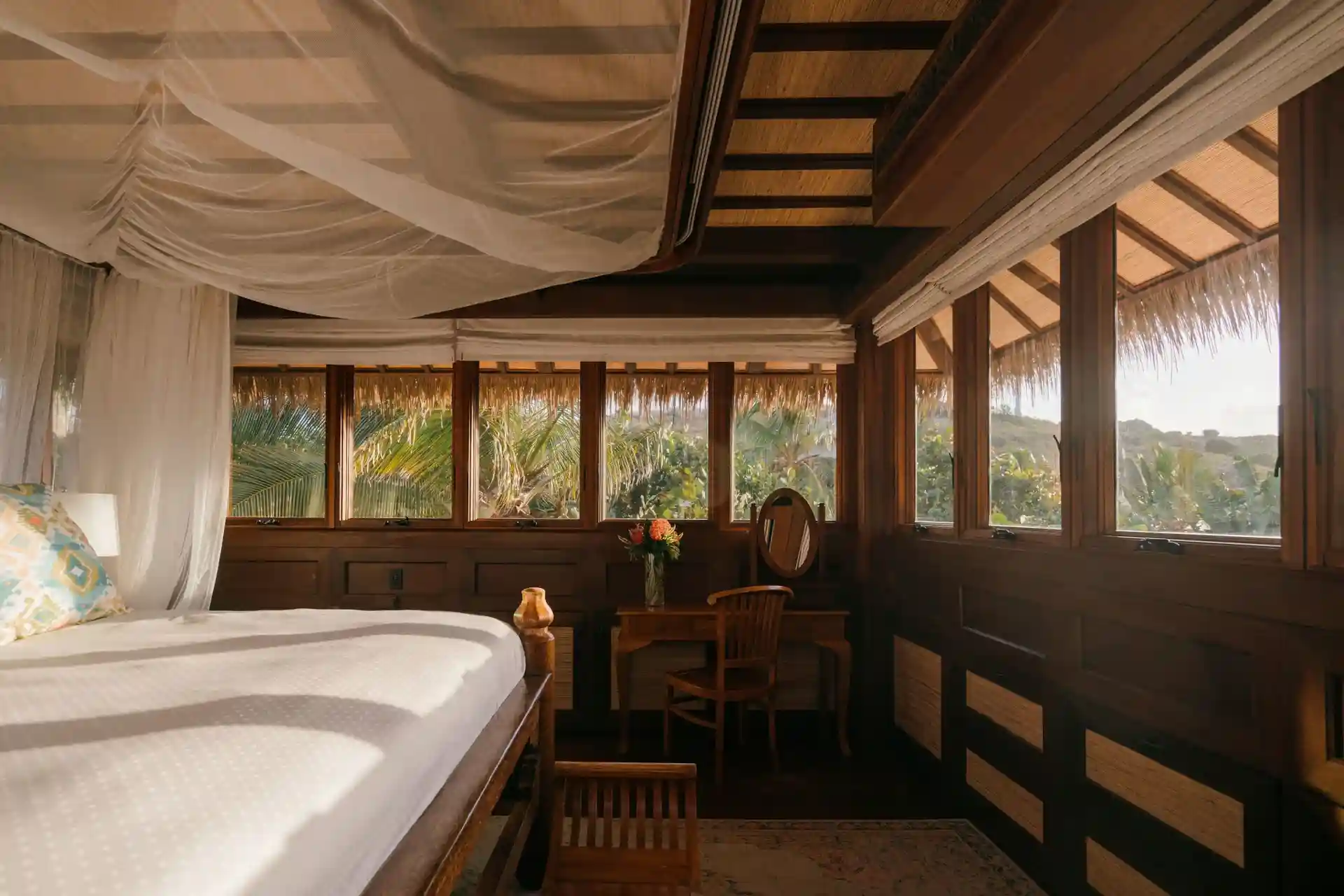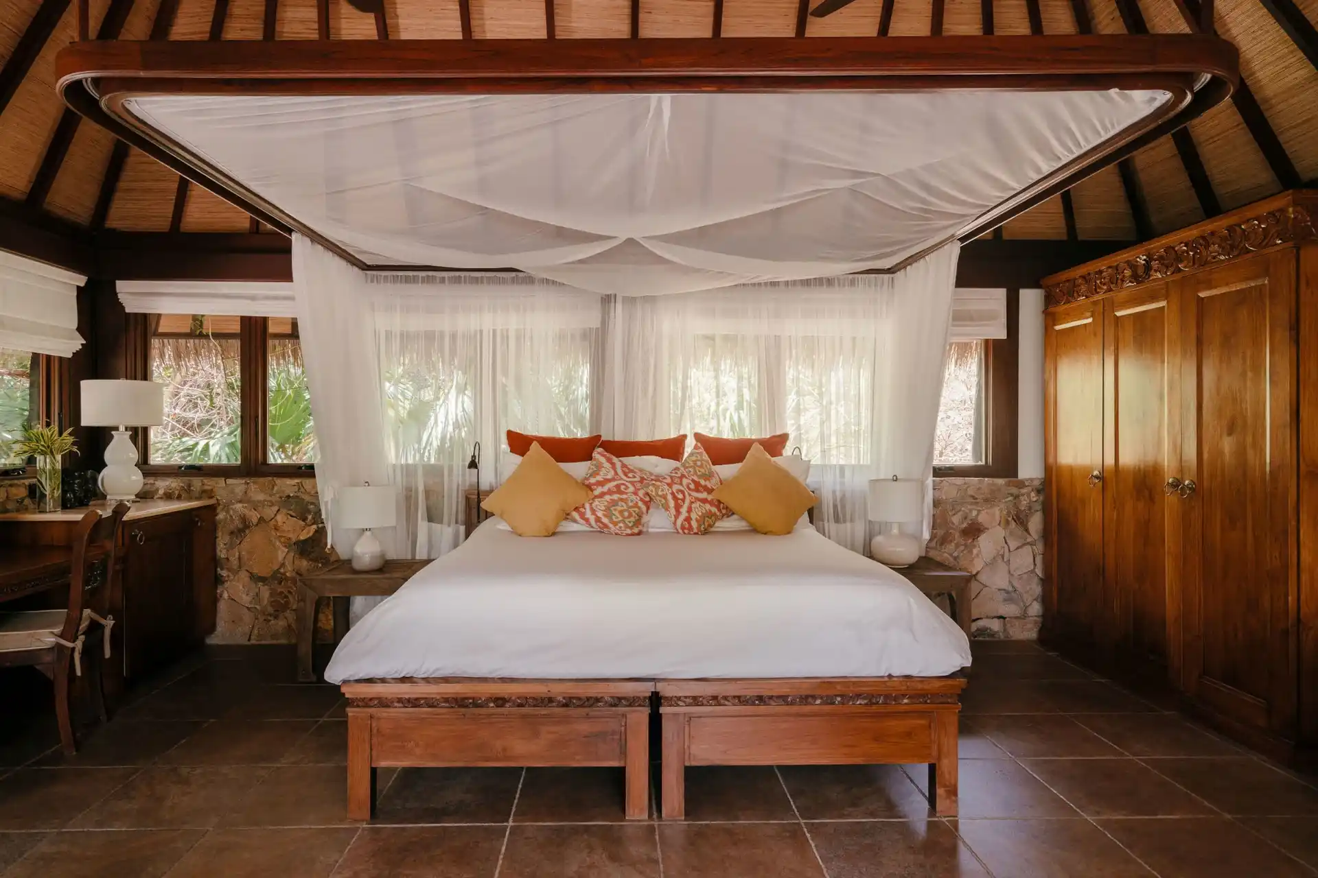 Accommodations on Necker Island include eleven bedrooms in the Great House and ten individual Bali Houses dotted around the island. The total number of guests that can easily be accommodated on Necker Island is 48, plus six children in the bunkroom.