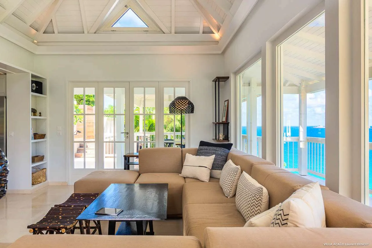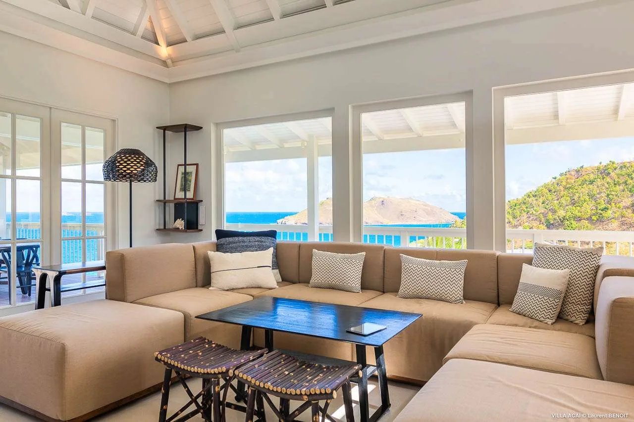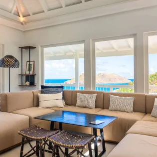 On the main level is the combined living room and kitchen. A large and comfortable sectional couch sits in the living room, with windows on two sides overlooking Flamands Bay. The views from here are incredible, making this an idyllic centerpiece of Villa Acai.
