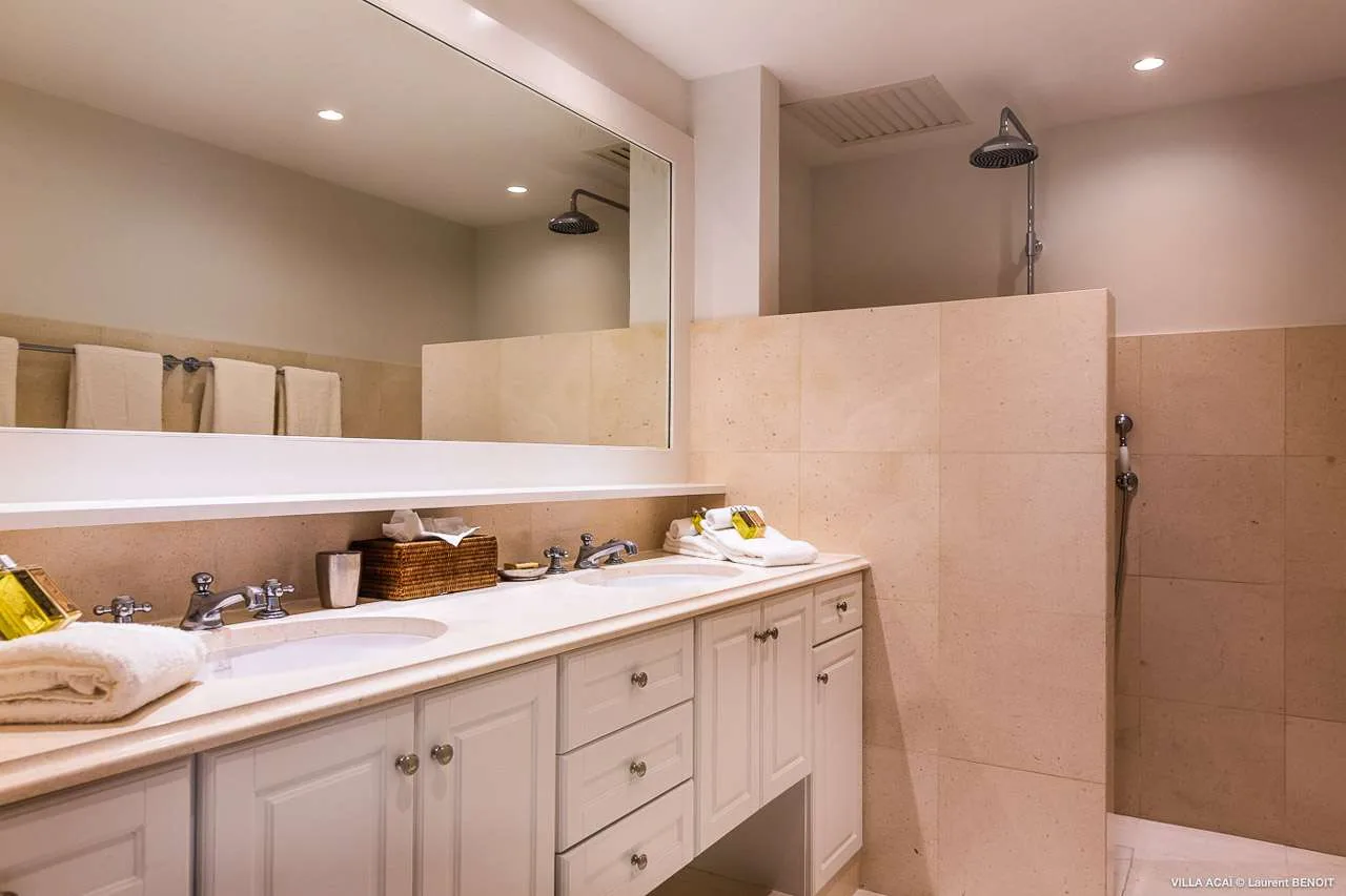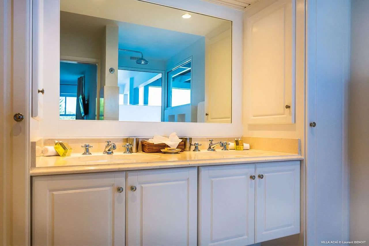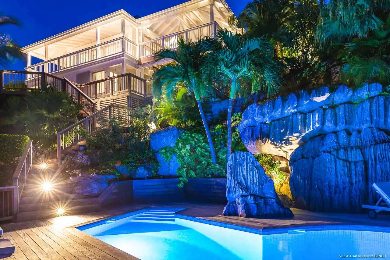 Villa Acai is ideally situated in a corner of the popular Roc de Flamands residence, boasting one of the best views in the area. It’s a short walk down a steep hill to Flamands Beach and the famous Cheval Blanc Hotel, with its restaurants and spa. The center of Gustavia is 10 minutes by car.