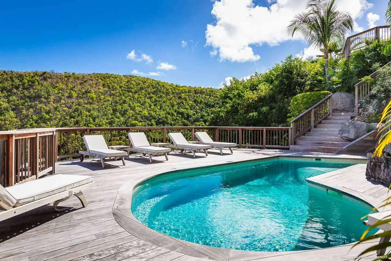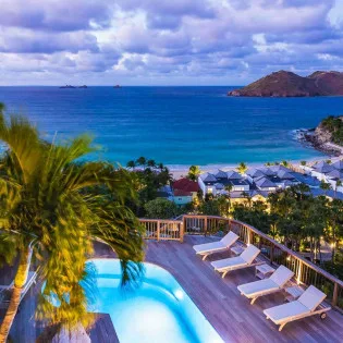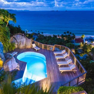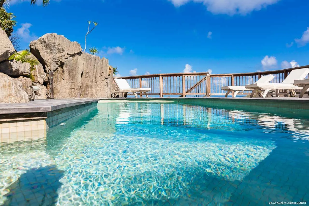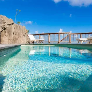 A few steps lower is the large sun deck with the heated pool that overlooks a large part of Flamands Beach. The original rock formation of the cliff flanks the pool, grounding you in the rugged landscapes of St. Barts. On the other side, the palm trees and tropical garden provide privacy for days spent relaxing by the water, sunbathing on loungers.
