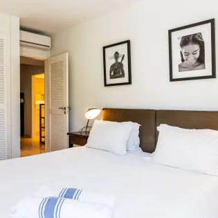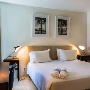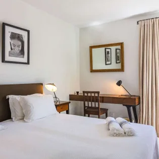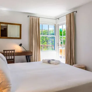 The master bedroom features a spacious ensuite bathroom. Two guest suites share a bathroom, with wistful writing desks in the rooms and black and white photos above the bed heads. All three rooms come with either a pair of twins or a king-sized bed.