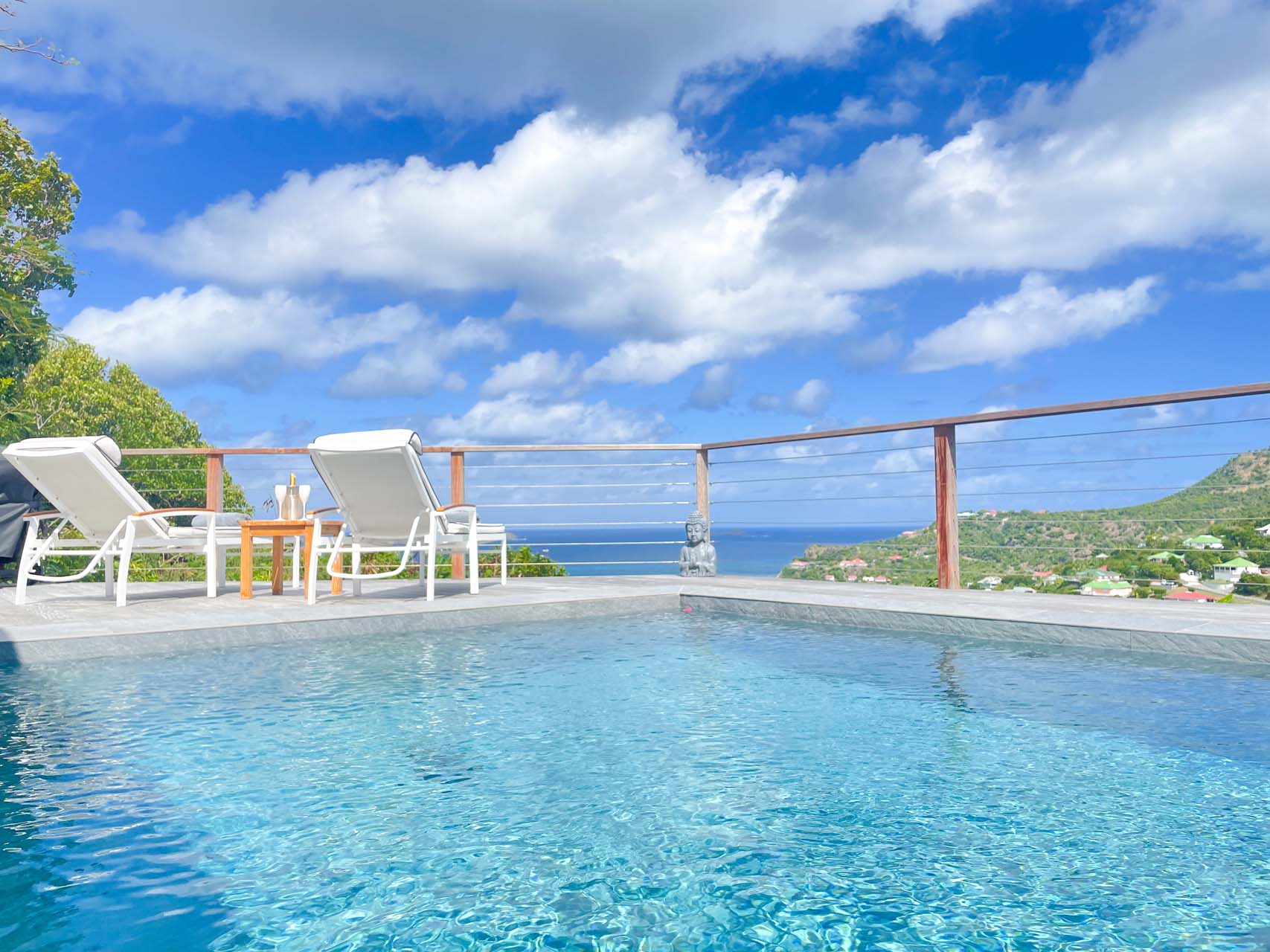 The pool, with easily accessible steps, invites relaxation and tranquility, providing the perfect place to unwind and enjoy your getaway on this beautiful island.