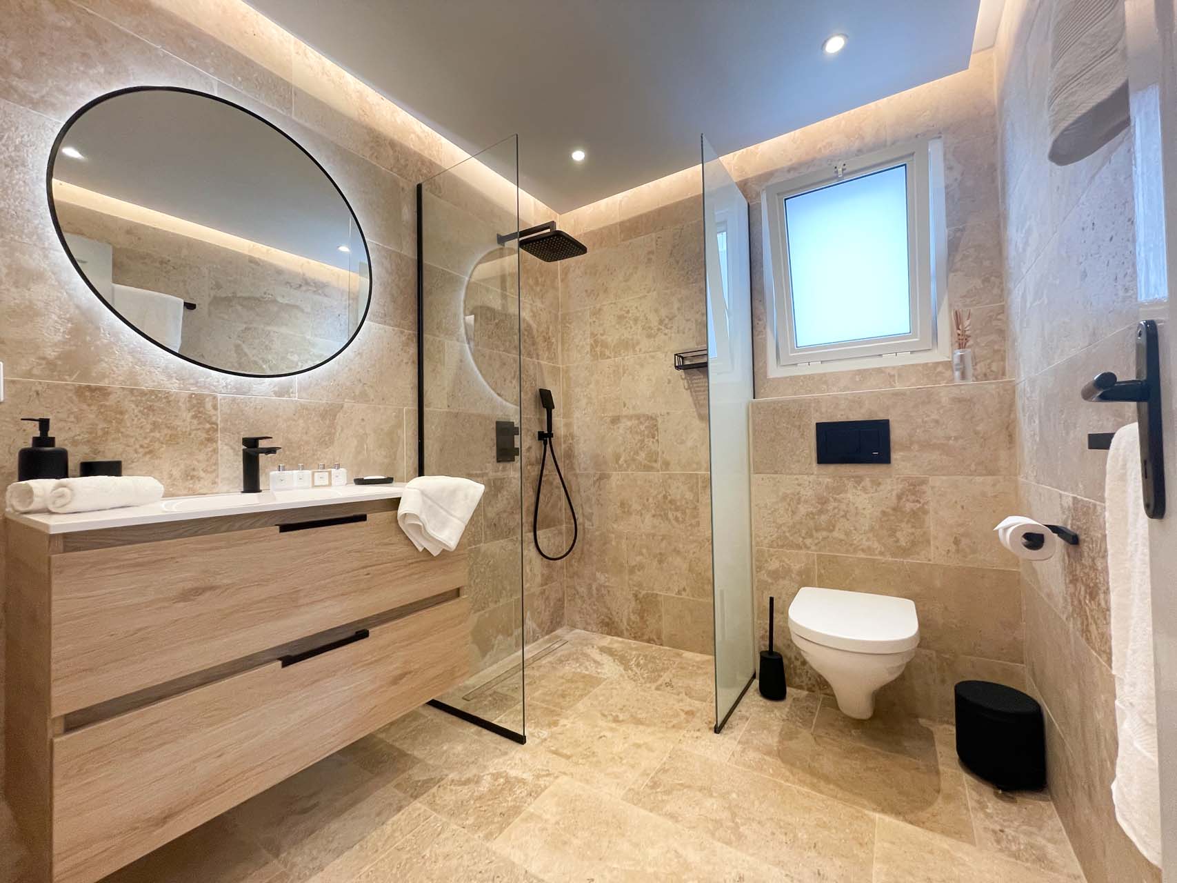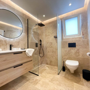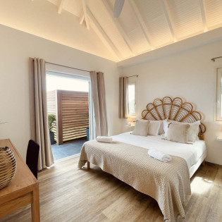 The bedrooms are comfortable and thoughtfully arranged, as they flank the living room and open onto the terrace. The decor exudes warmth and refinement, with a predominant presence of white complemented by subtle touches of light wood.