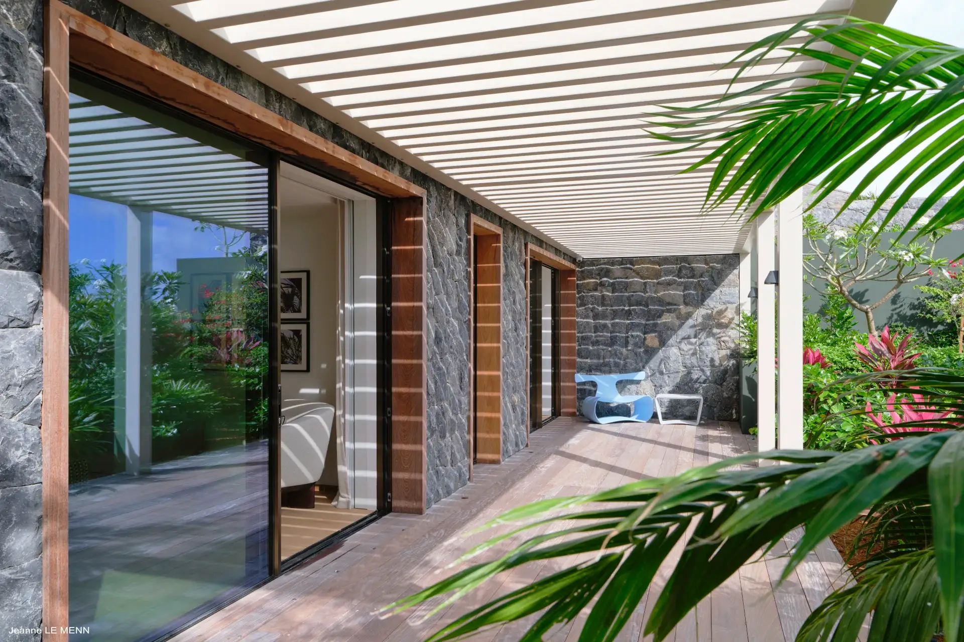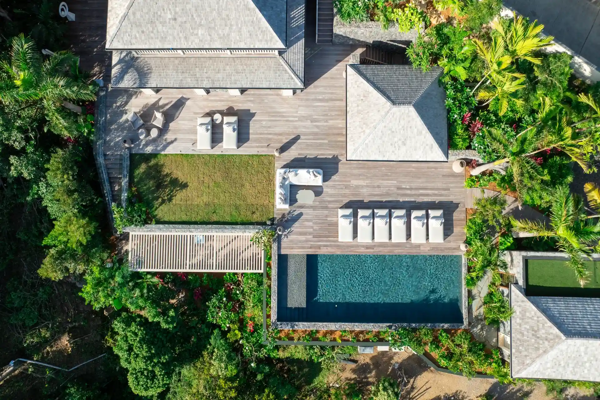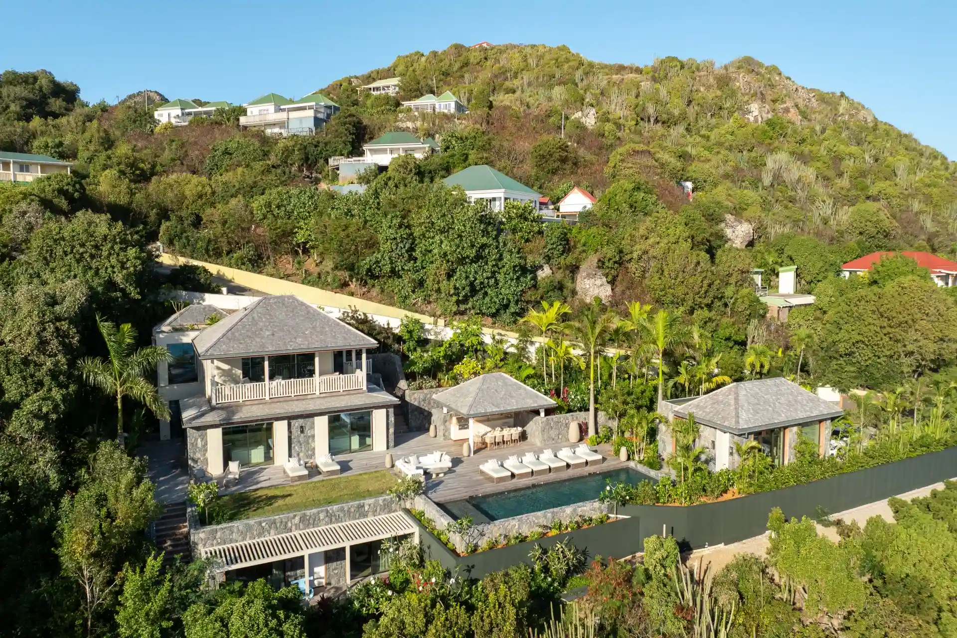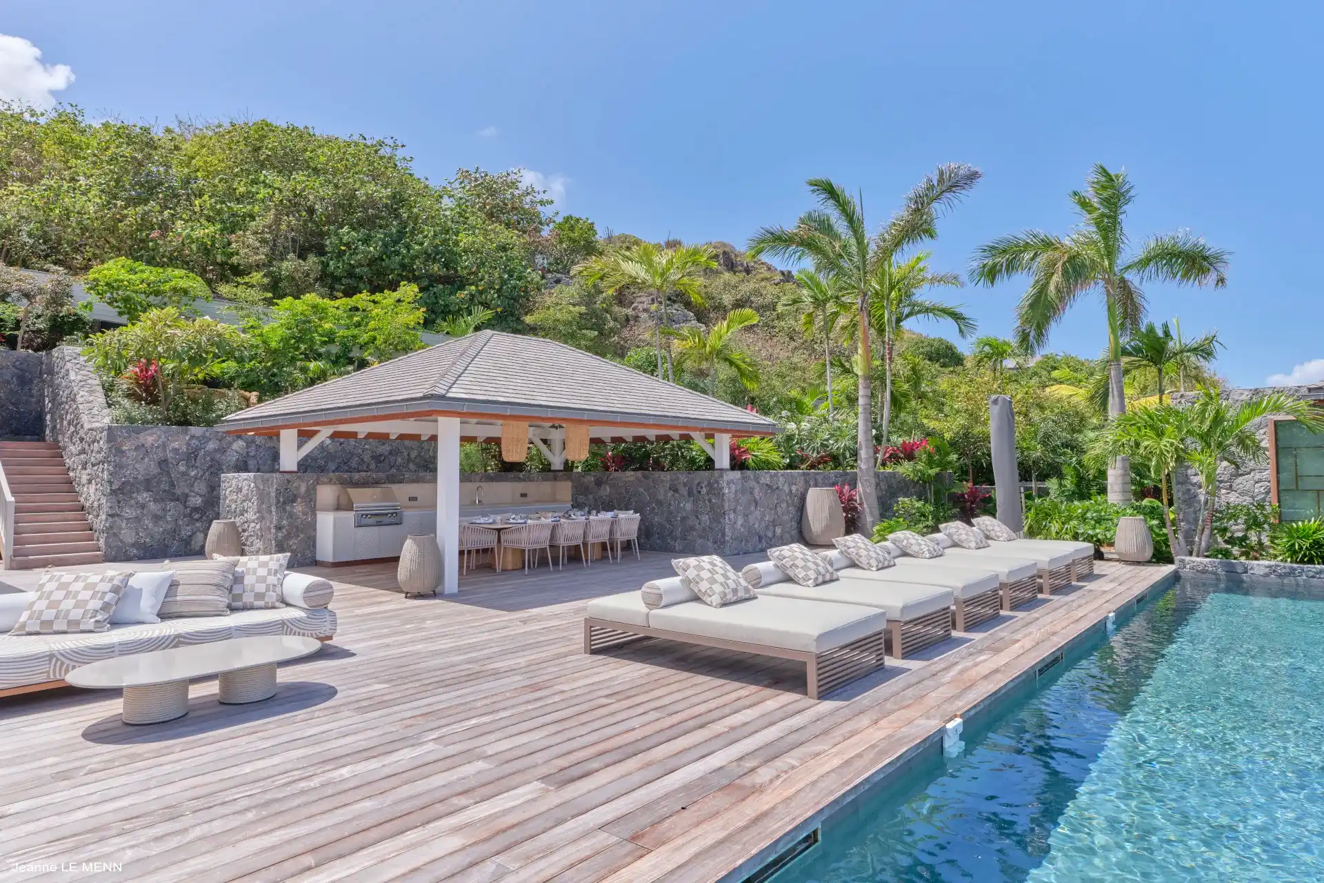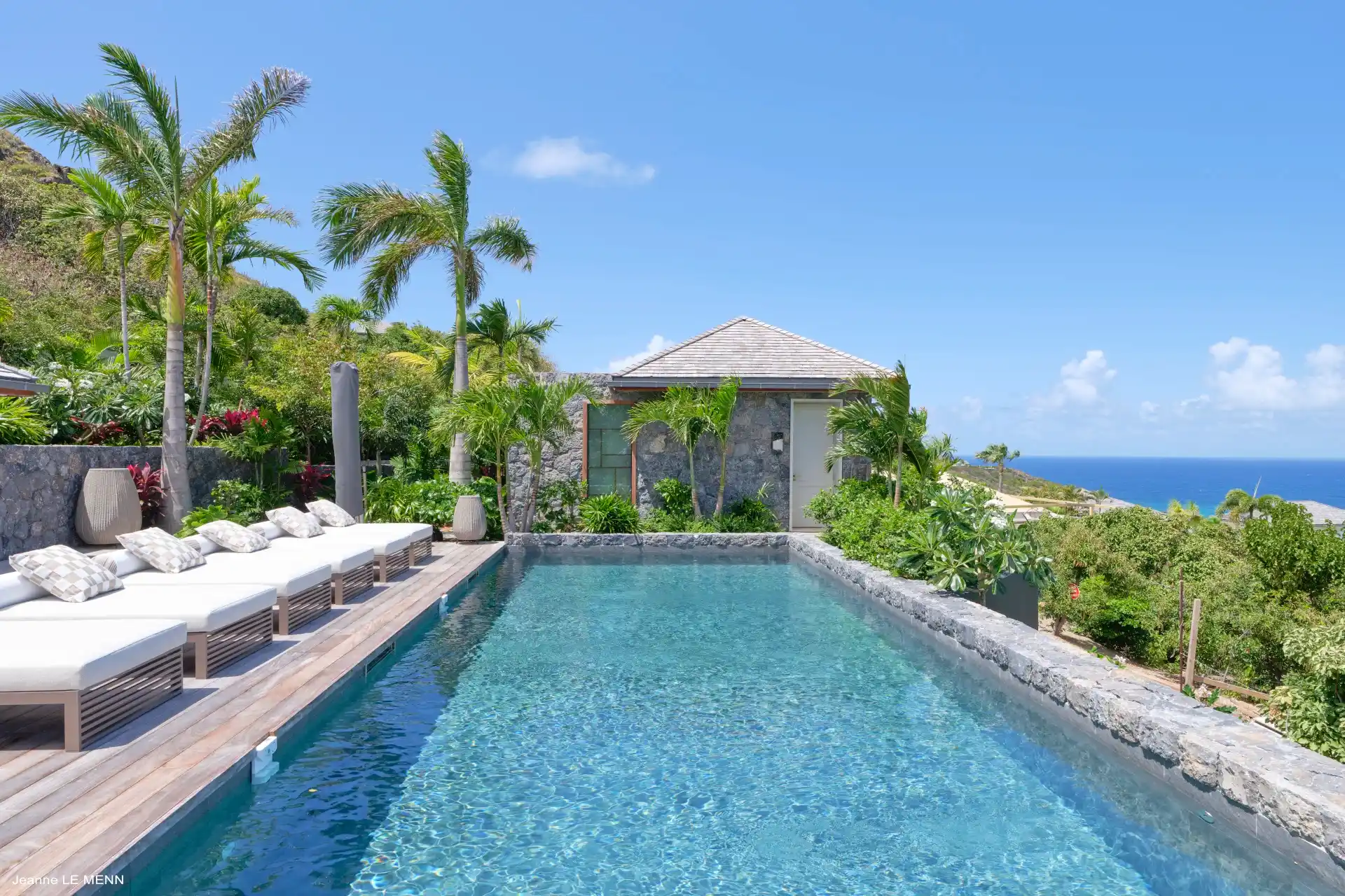 Designed for an unforgettable stay, the villa features cocoon-like bedrooms that combine comfort with privacy. Two are located on the main level, opening directly onto the pool and deck—ideal for enjoying long, sun-filled days—while two additional bedrooms on the lower level offer a more intimate setting overlooking a lush tropical garden.