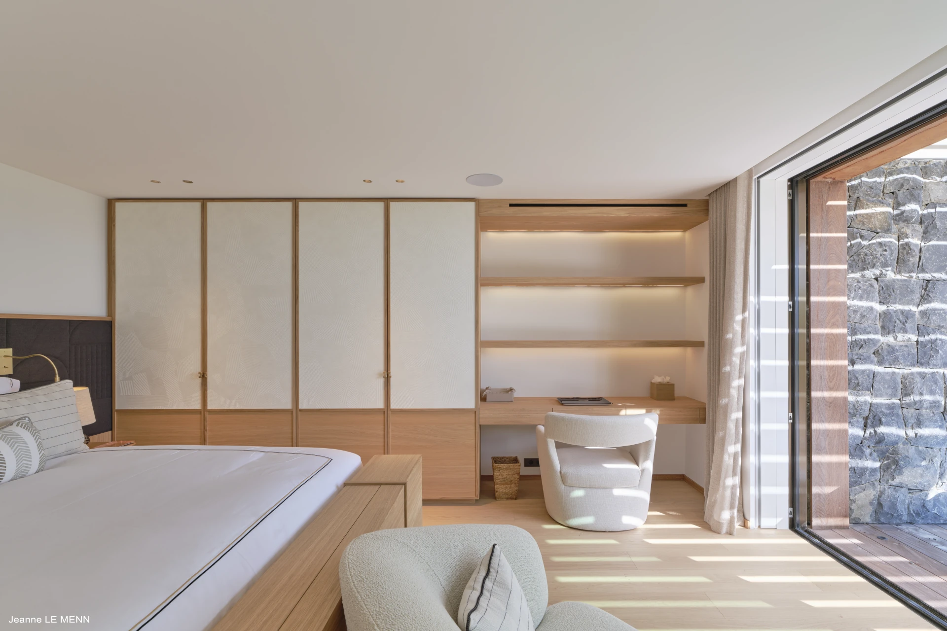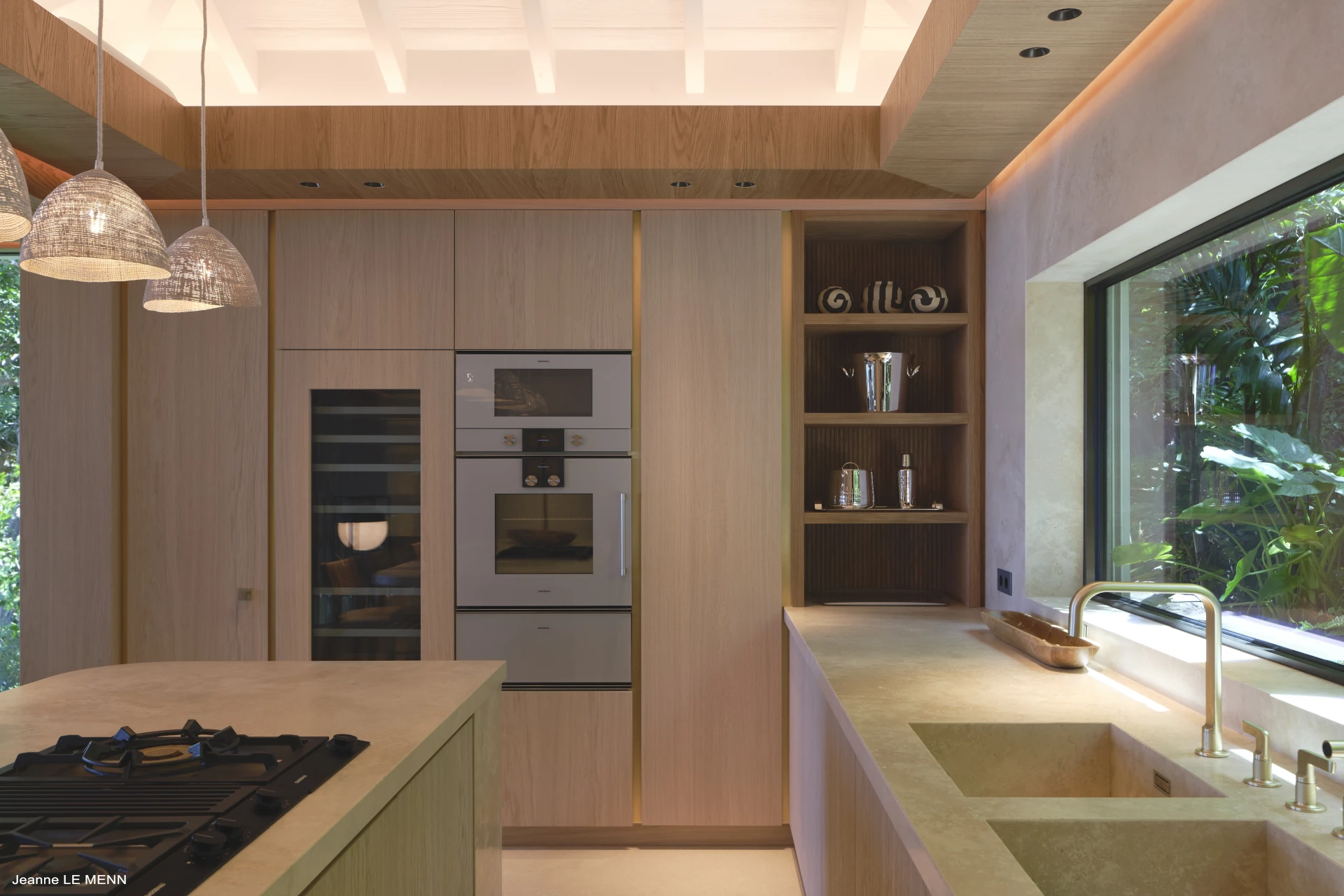 Upstairs, a bright, air-conditioned living space awaits, with a lounge opening onto the sea and a well-appointed kitchen facing the garden. Access is available via an interior staircase highlighted by a striking Raku artwork, or by an exterior staircase in wood and stone, adding to the villa’s distinctive charm.