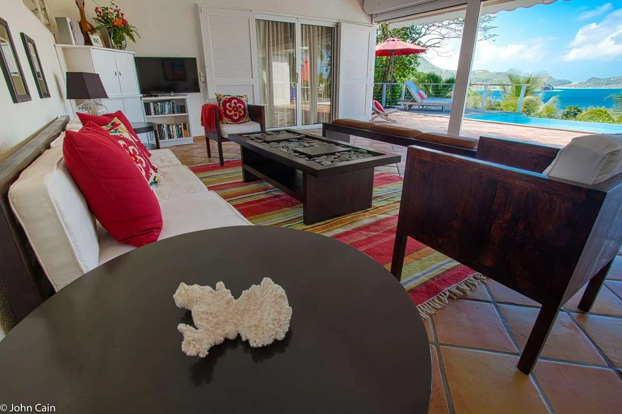 The comfortable living room with terracotta floors and dining area opens to the pool area and ocean view. It’s a cozy and comfortable spot to kick back and relax, easing into the laid-back lifestyle of St. Barts.