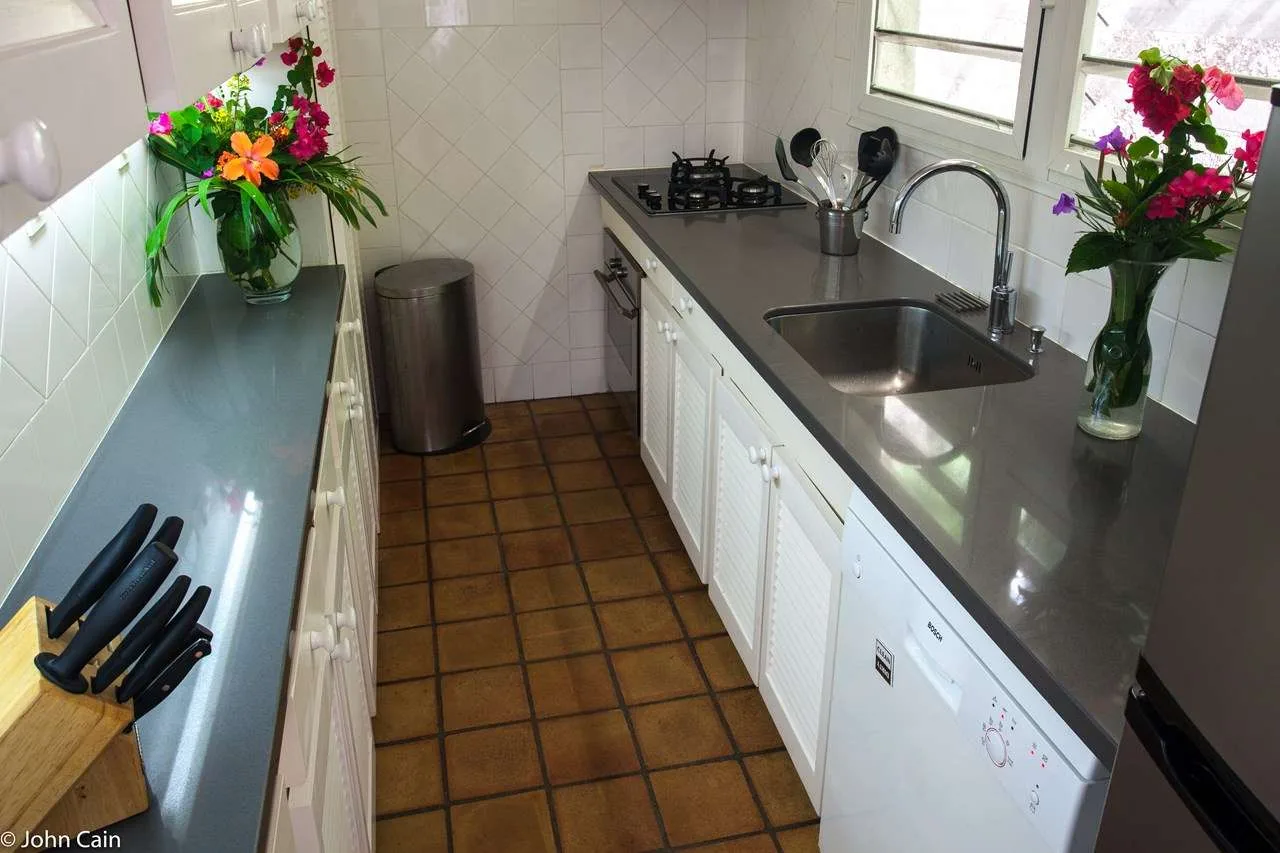 A small, galley-style kitchen at Villa Alizee d'Eden is ideal for preparing meals during your stay. Charming and functional, you’ll have everything you need for cooking.