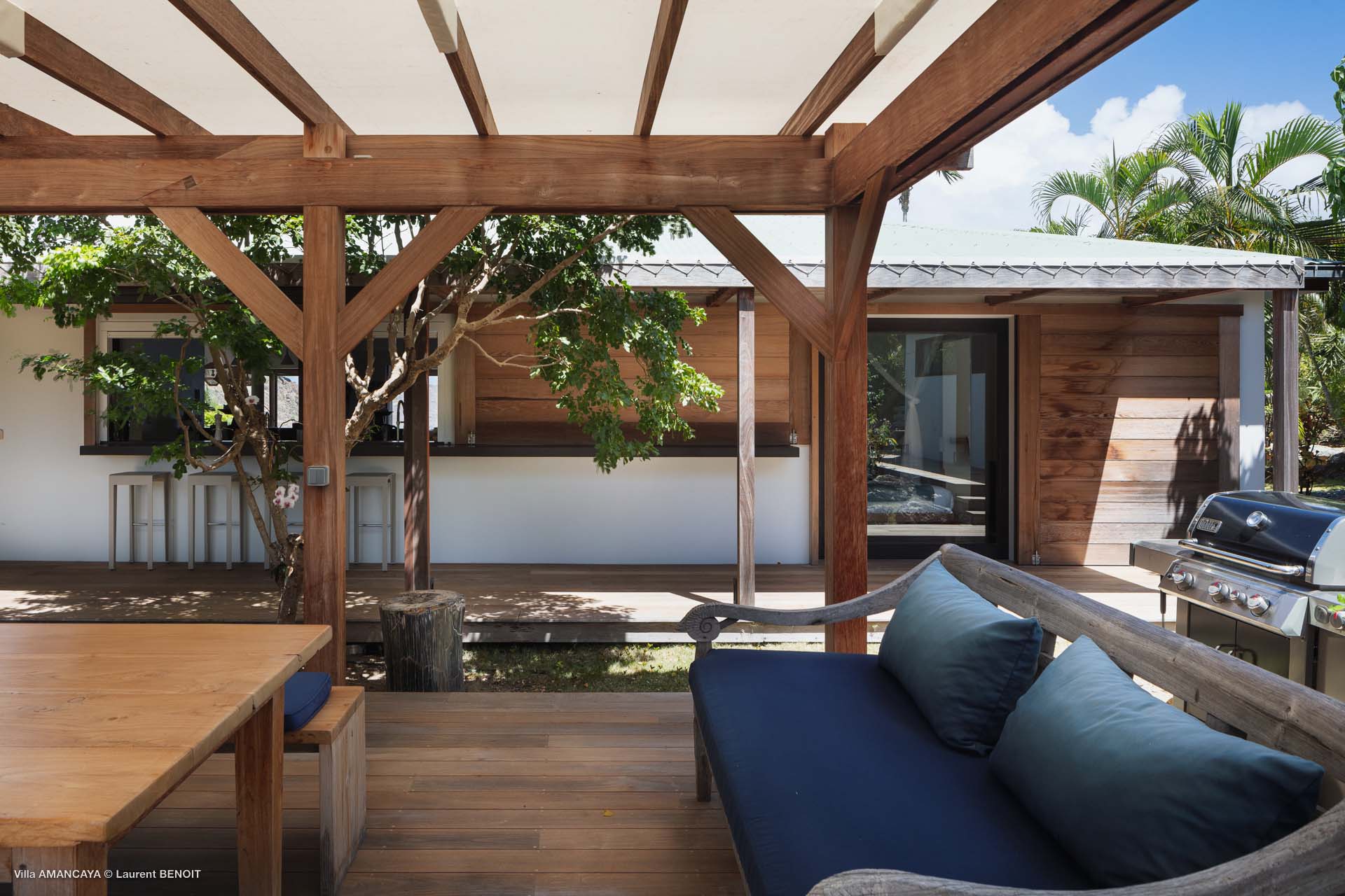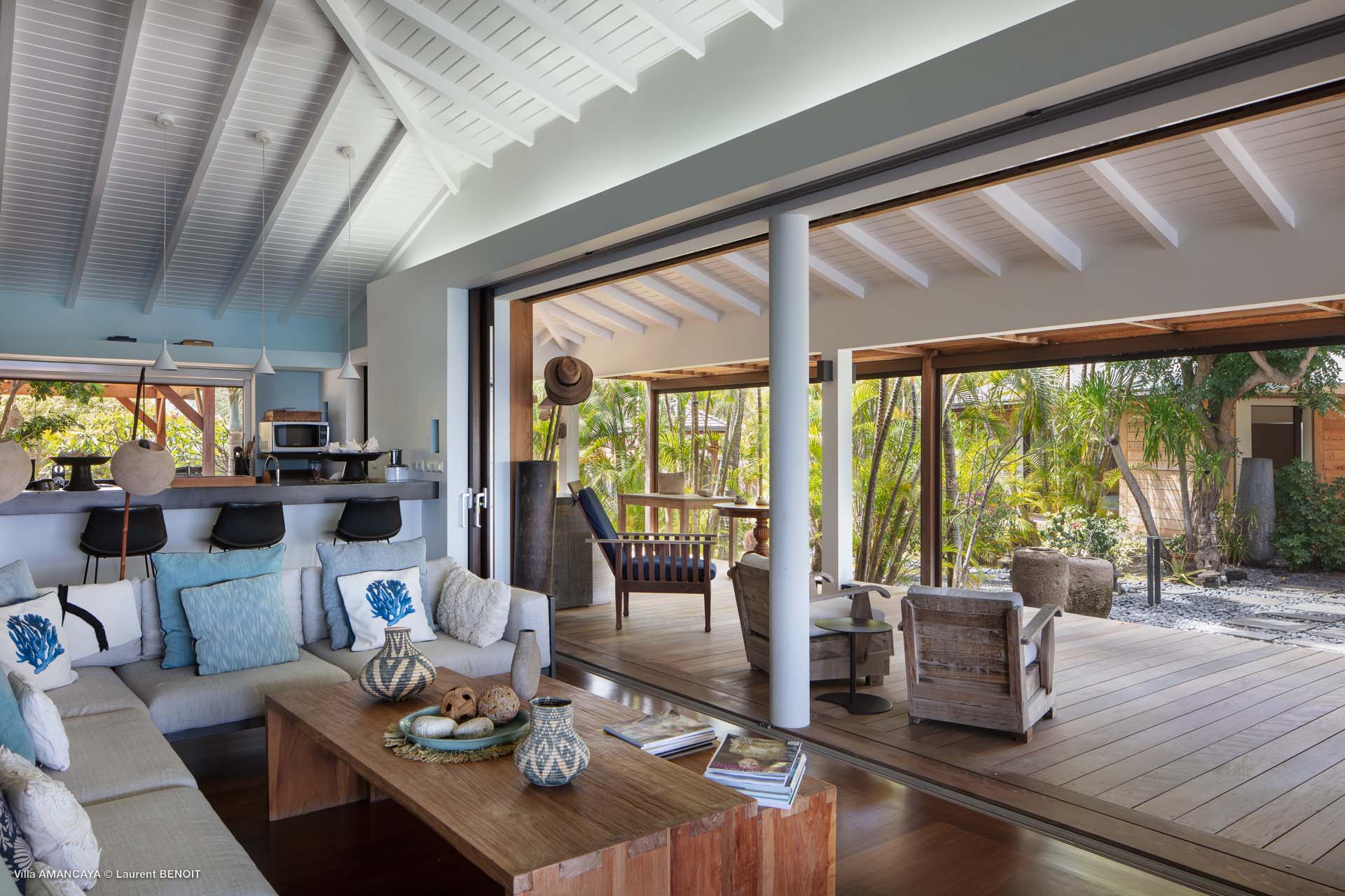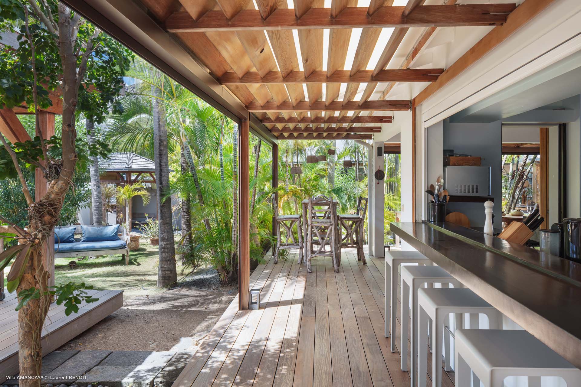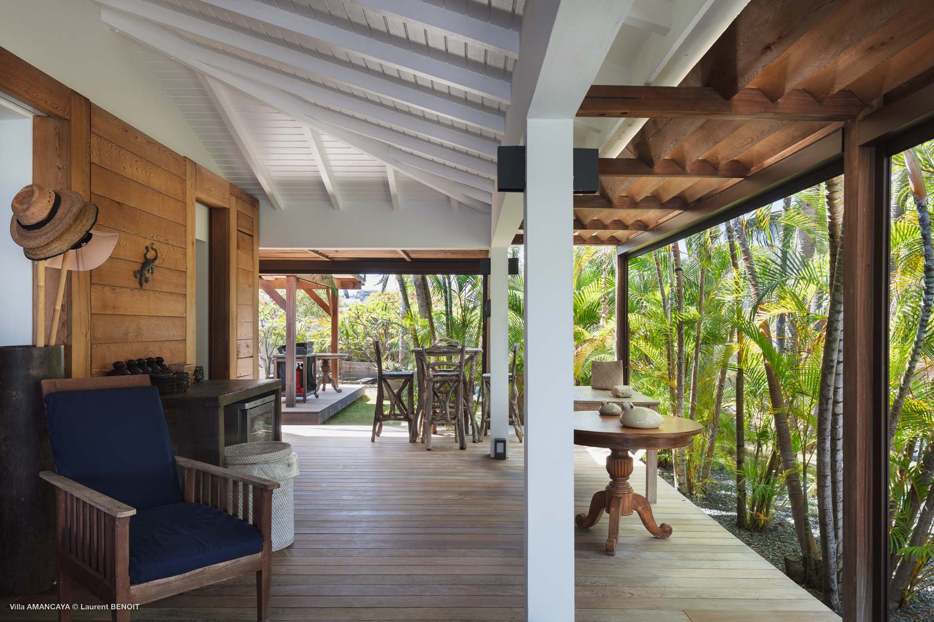 The outdoor spaces at Villa Amancaya are a highlight of this property. There’s a carefree and idyllic feel to the terraces, made from gorgeous natural wood and bordered by lush palms and tropical plants.