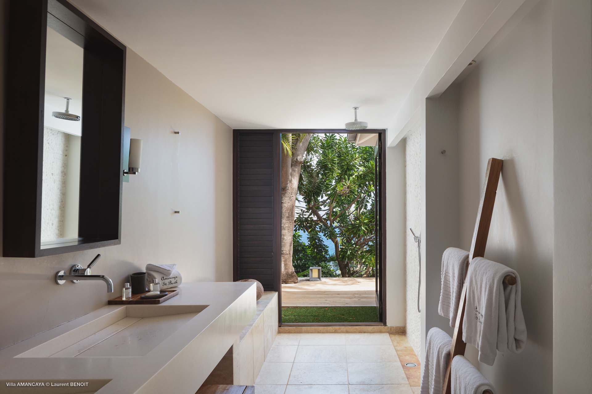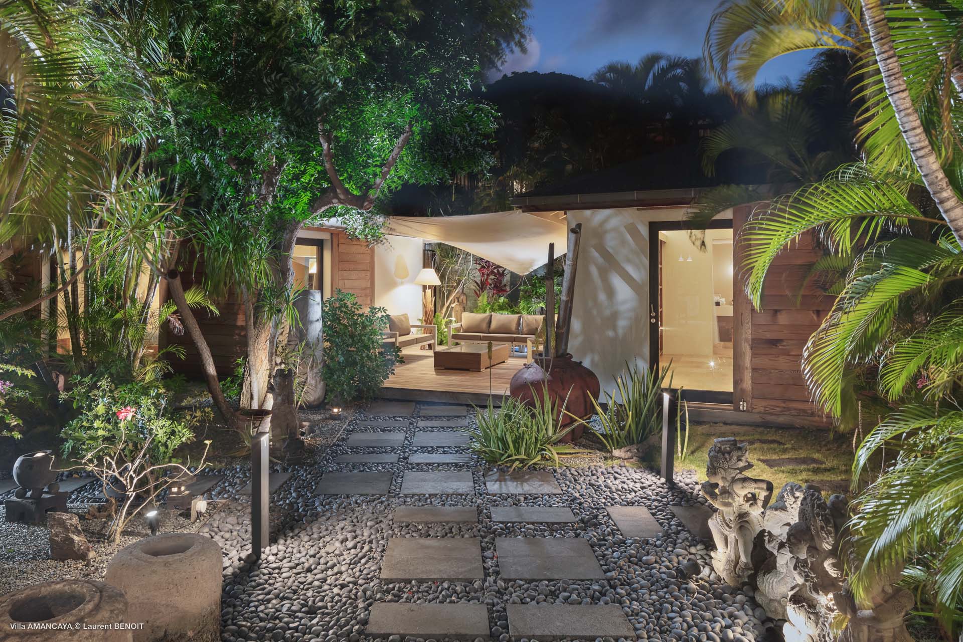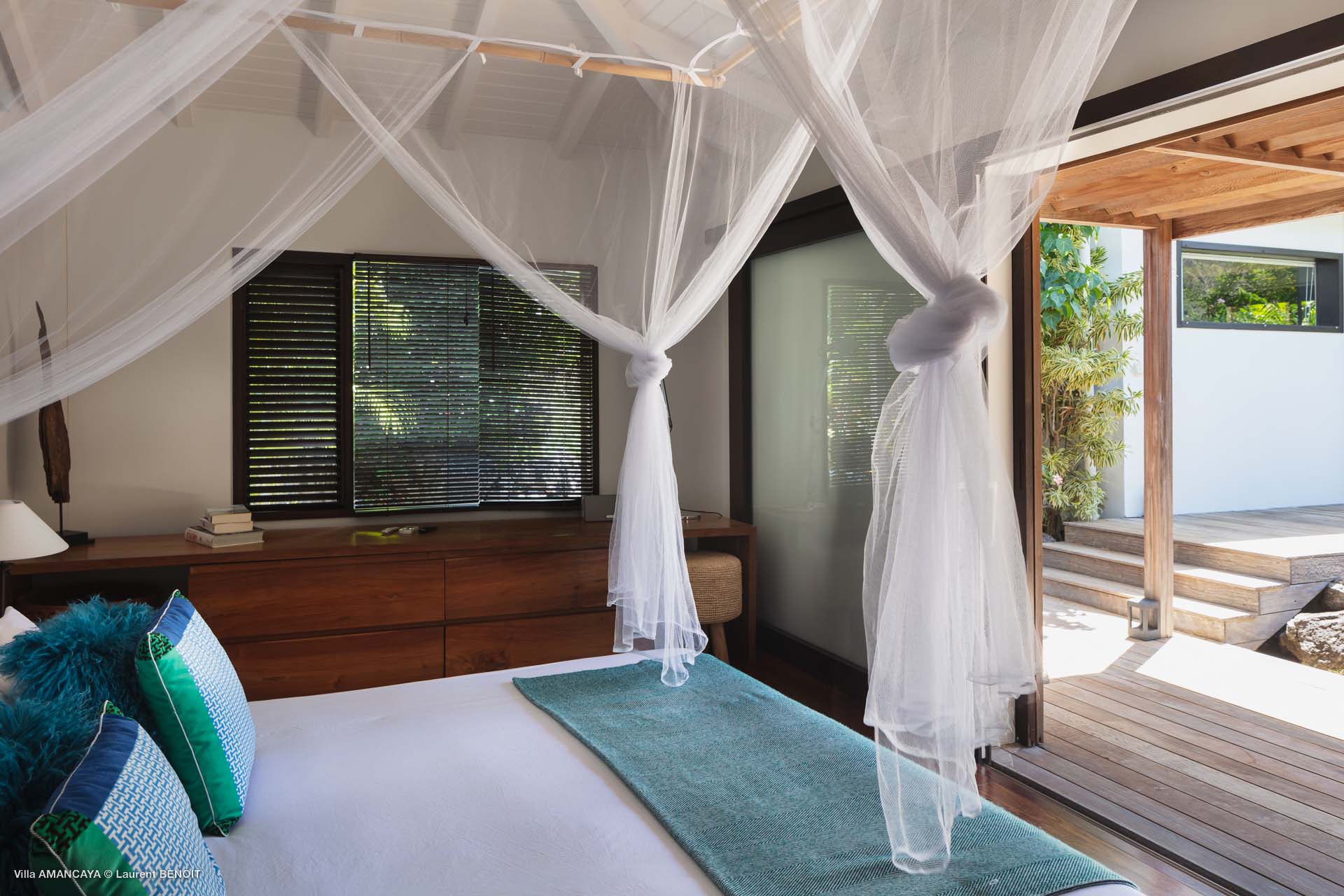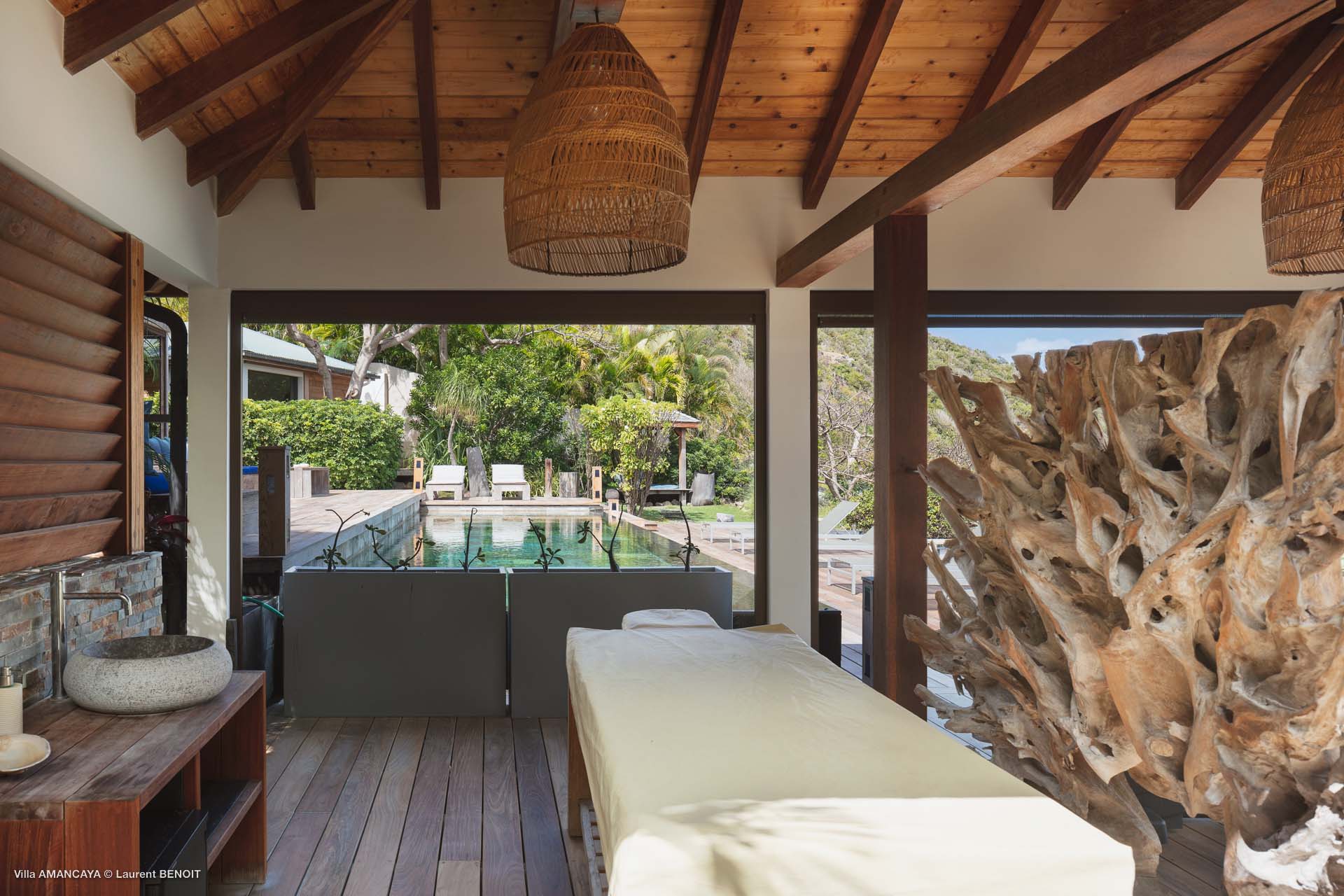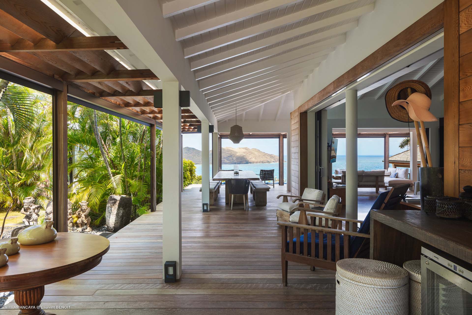 The outdoor spaces at Villa Amancaya are a highlight of this property. There’s a carefree and idyllic feel to the terraces, made from gorgeous natural wood and bordered by lush palms and tropical plants.