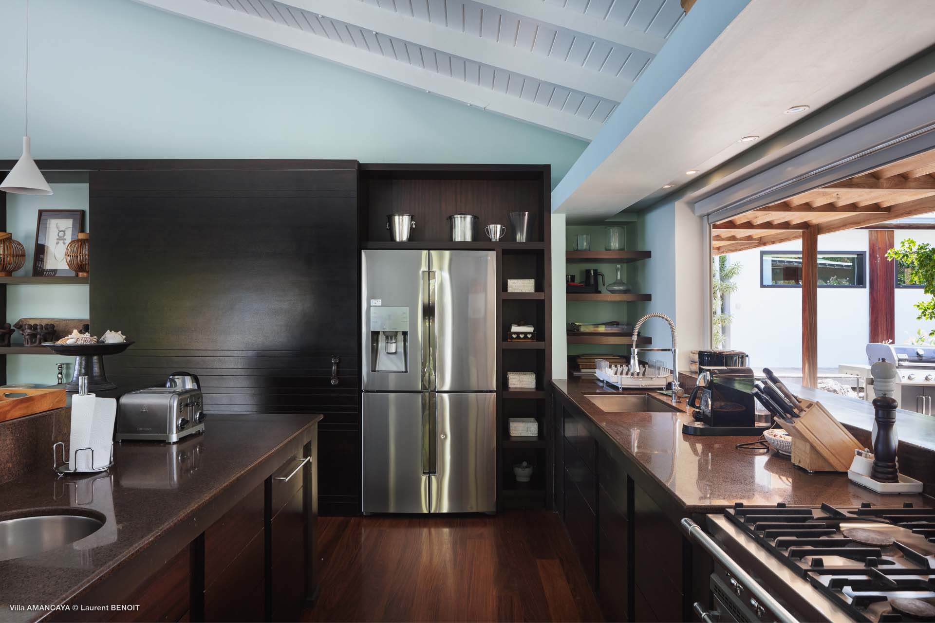 Next to the living room is Villa Amancaya’s well-equipped kitchen. From easy snacks to gourmet island dinners, this space makes it easy to prepare meals during your stay. Our concierge can even organize private chefs to cater a meal or two, leaving you to enjoy a sunset drink and aperitif while you wait.