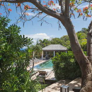 The covered terrace has several seating areas and wonderful spots to kick back with a cool drink and gaze out at the yachts in the bay. Steps lead down to the swimming pool, refreshing and cool in the heat of the day. Loungers for sunbathing line the water, ideal places to settle in with a book or drift off to sleep with the breeze rustling through the garden.