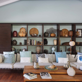 The living room has a large L-shaped sofa and opens to the pool and view. Shelves behind the sofa feature a range of interesting décor, from coffee table books to elegant vases and ornate teapots. The room takes advantage of the view, with the incredible deep blues of the Caribbean Sea drawing your gaze.