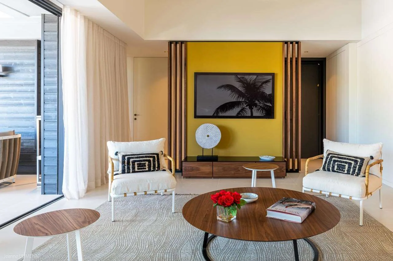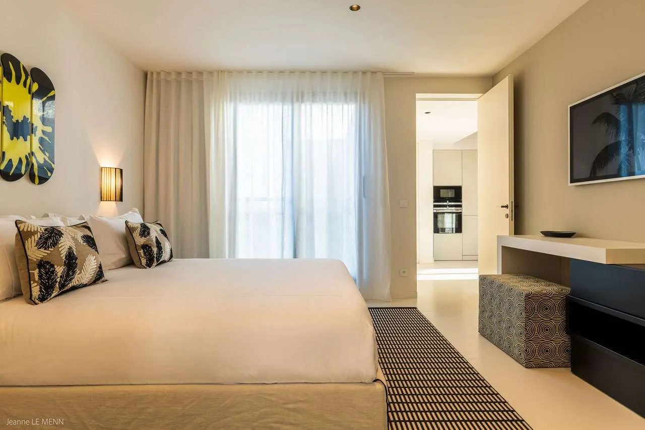 The spacious, fully air-conditioned apartment with its modern classic decor, has a large main room including a fully-equipped, gourmet kitchen, a dining area, and the living room which has comfortable seating and a large screen.