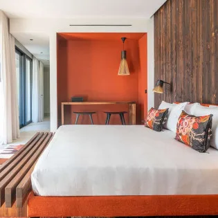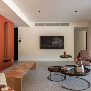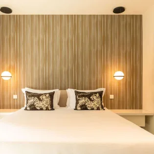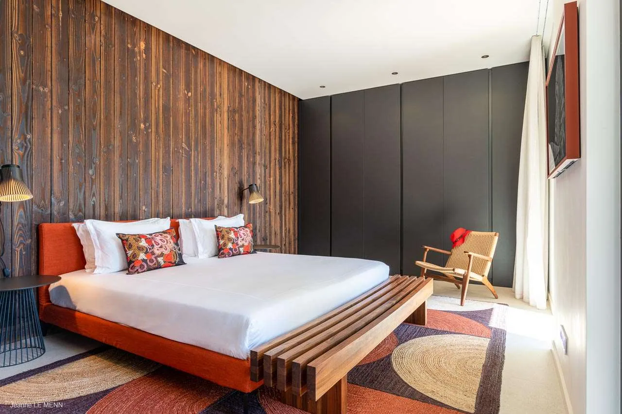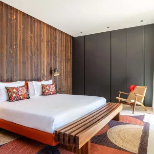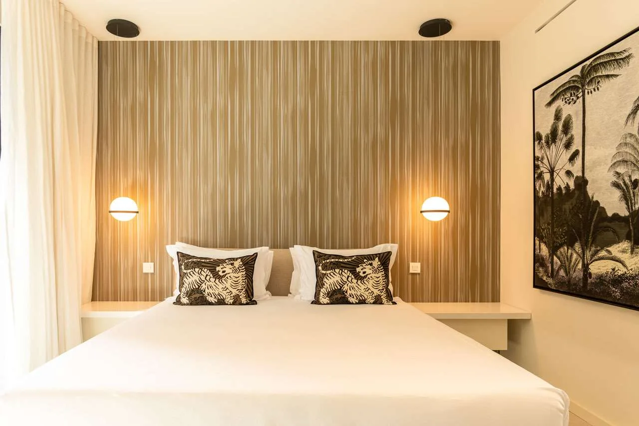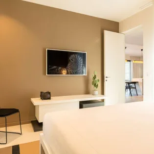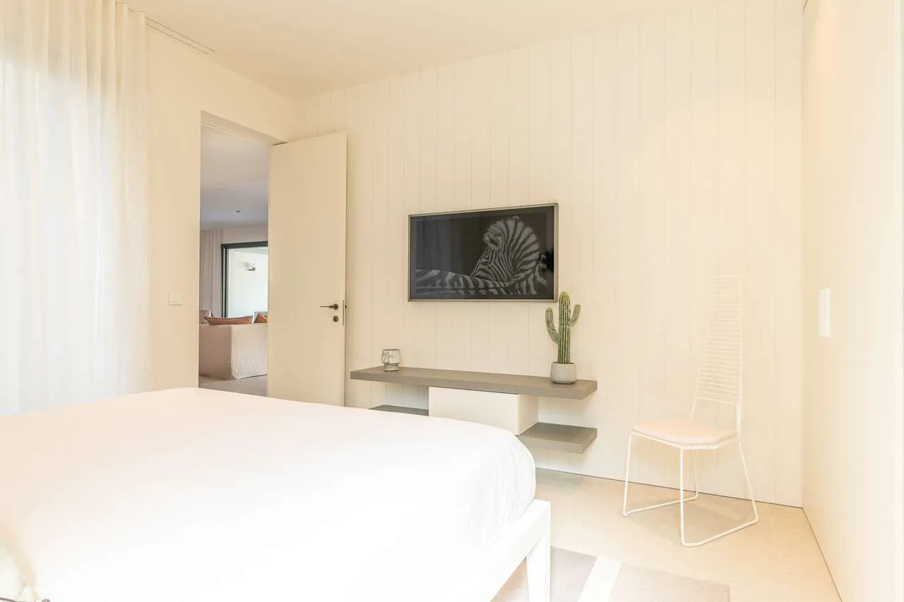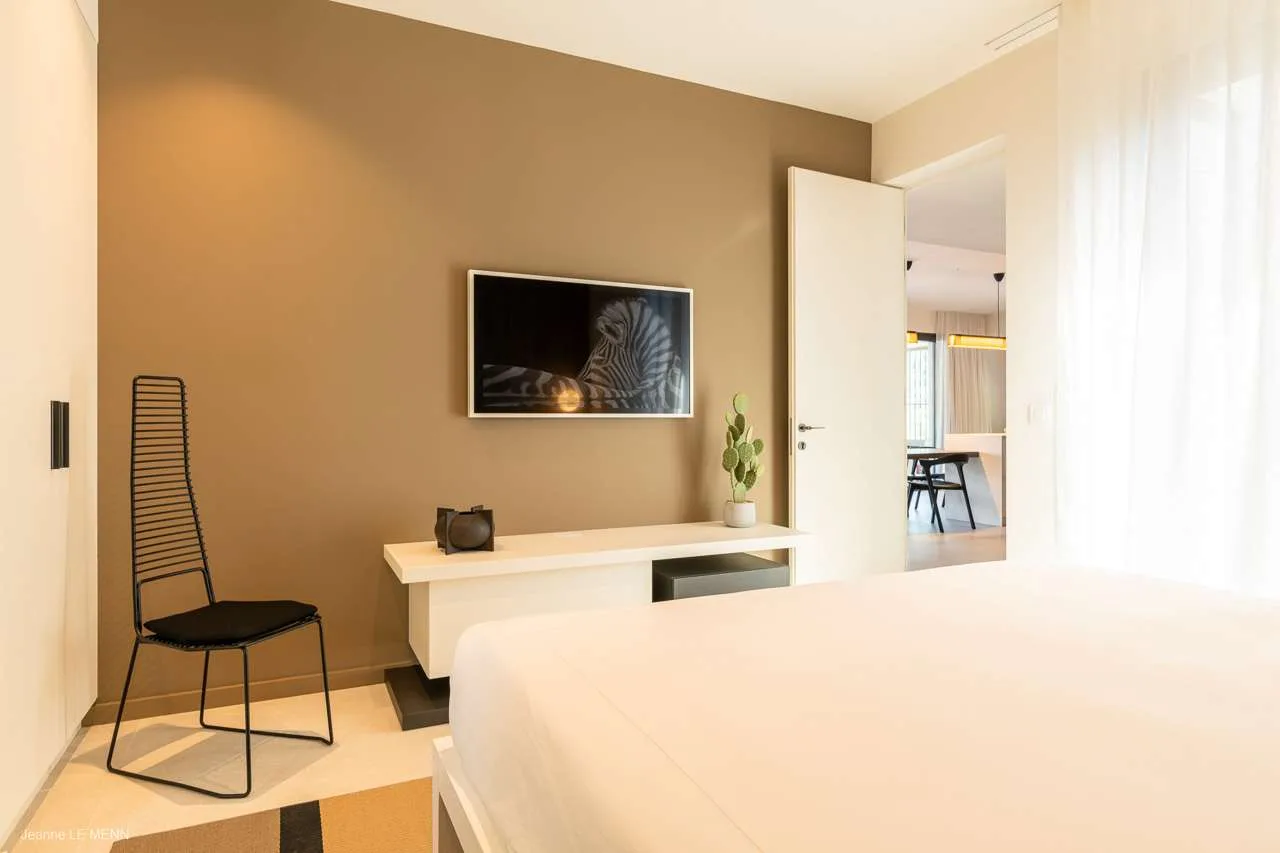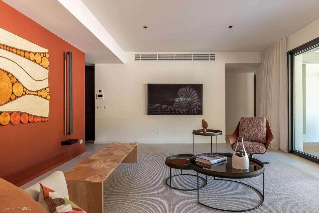 The spacious, fully air-conditioned apartment with its modern classic decor, has a large main room including a fully equipped, gourmet kitchen, a dining area, and the living room, which has comfortable seating and a large screen.