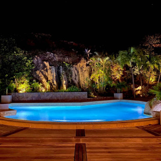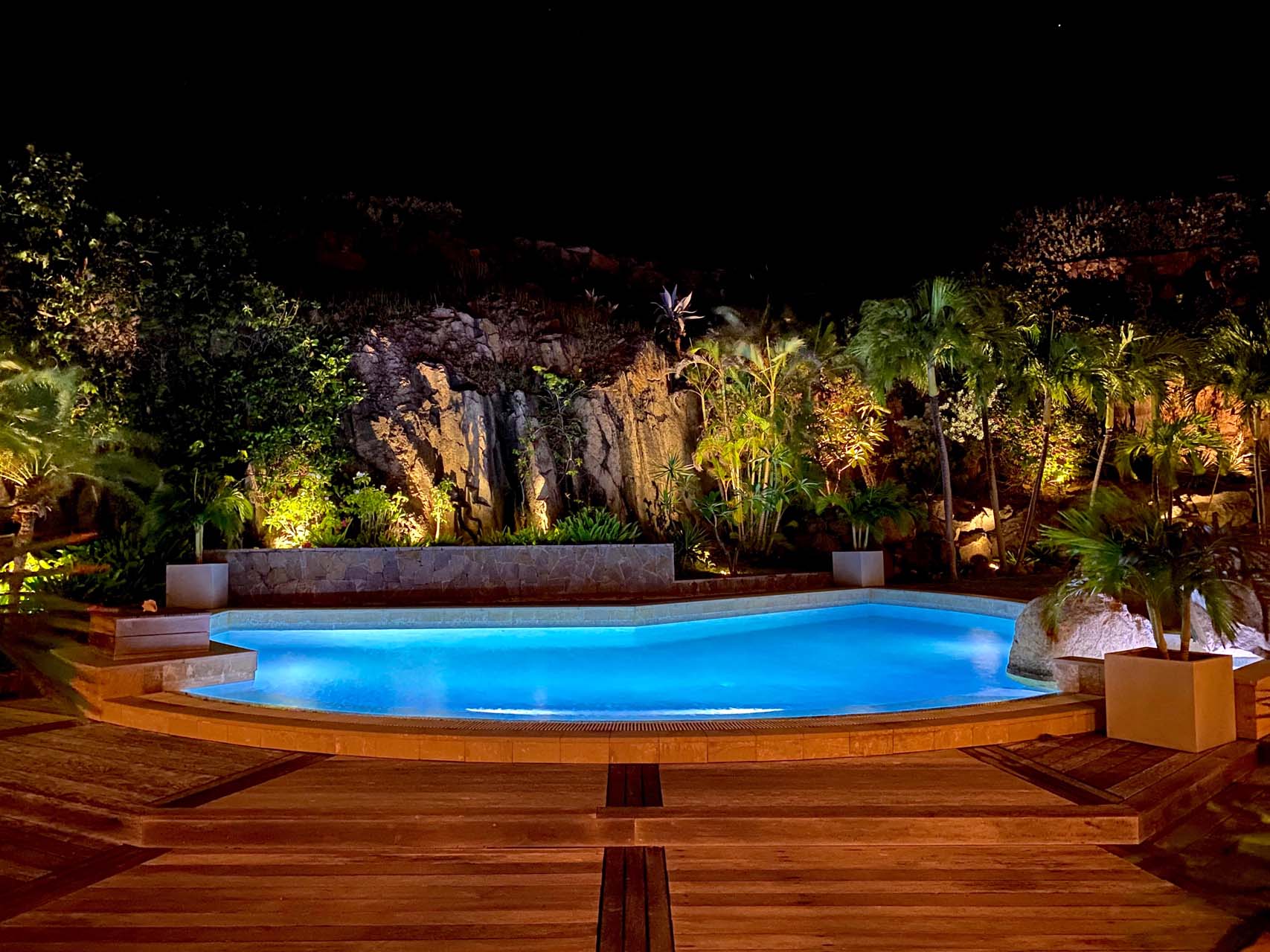 The semicircular pool is tucked up against the rock wall, with palm trees fluttering in the island breeze on either side. On the other side of the home, stone steps trail down a short pathway to a deck and the sea for daytime plunges.