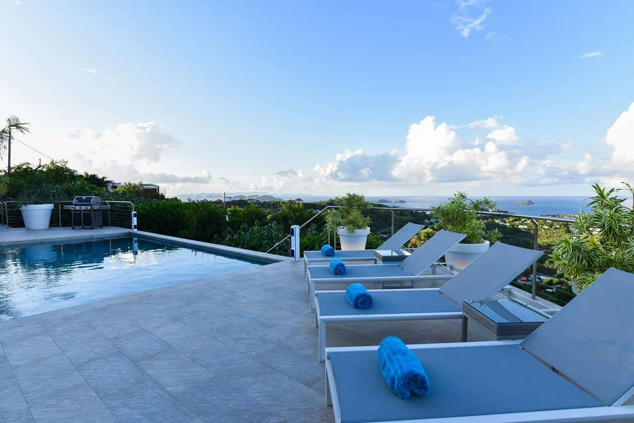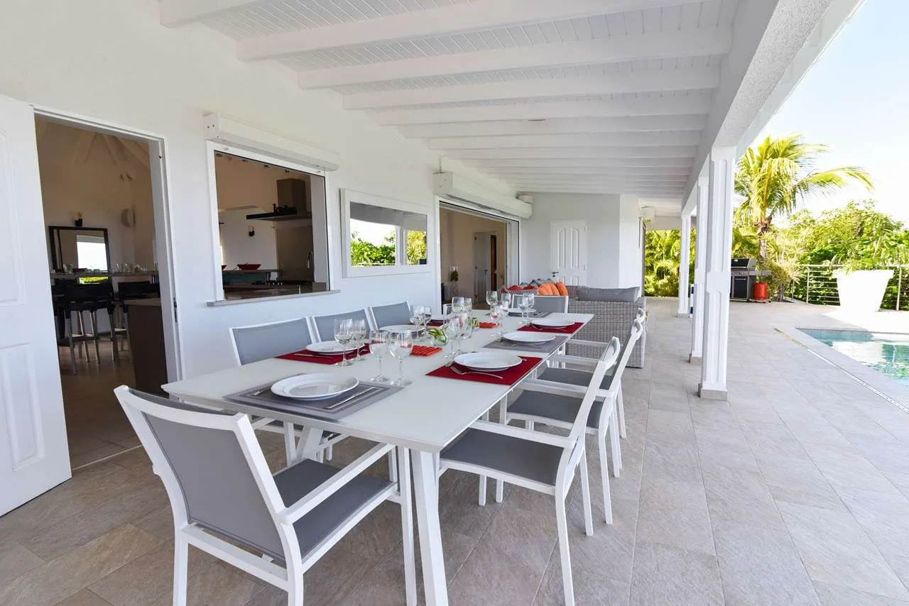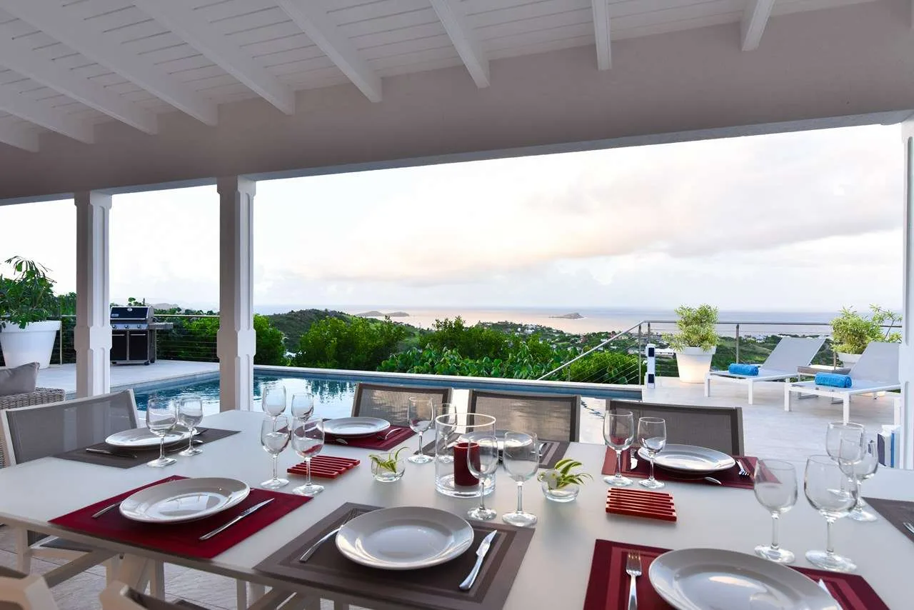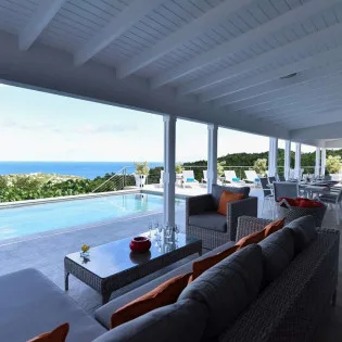 A second outdoor lounge nearby enjoys plenty of sun during the day, a comfortable spot to entertain guests with evening drinks. And when the Caribbean Sea calls, both Lorient and St. Jean are a 5-minute drive away, both pristine sweeps of golden sand and shimmering