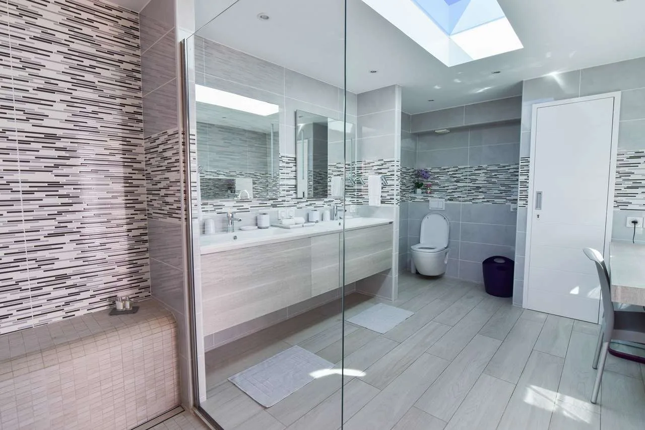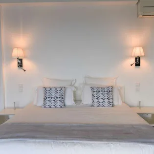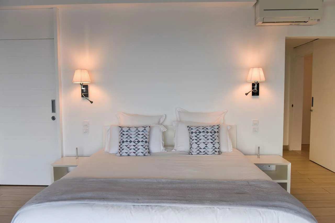 The second bedroom, located downstairs, has a king-size bed, ensuite bathroom, a private terrace, and a separate entrance. A third bedroom is on the main level, has a king-size bed and an ensuite bathroom with a shower. All bedrooms have comfortably designed furniture and air-conditioning.