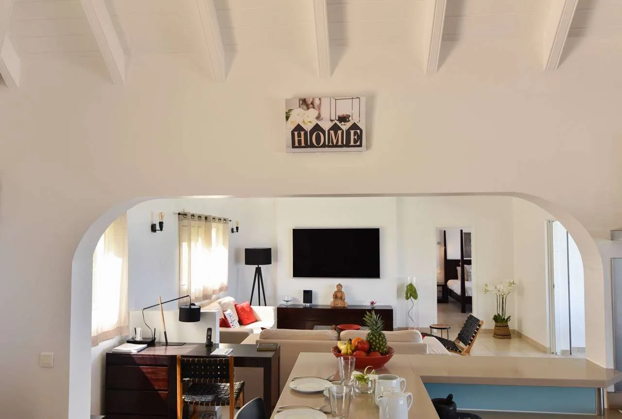 Villa Au Coeur du Rocher spans two levels, with a beautiful open-plan design awash with the ocean breeze. The main level features a large great room, the centerpiece of the home with the living area and kitchen.